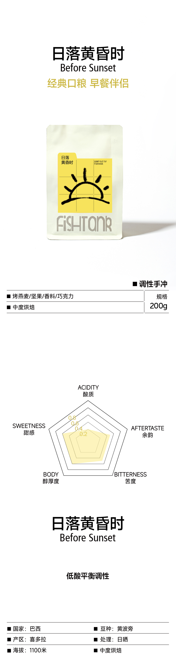 日落黄昏时 调性拼配手冲咖啡豆200g 低酸平衡调