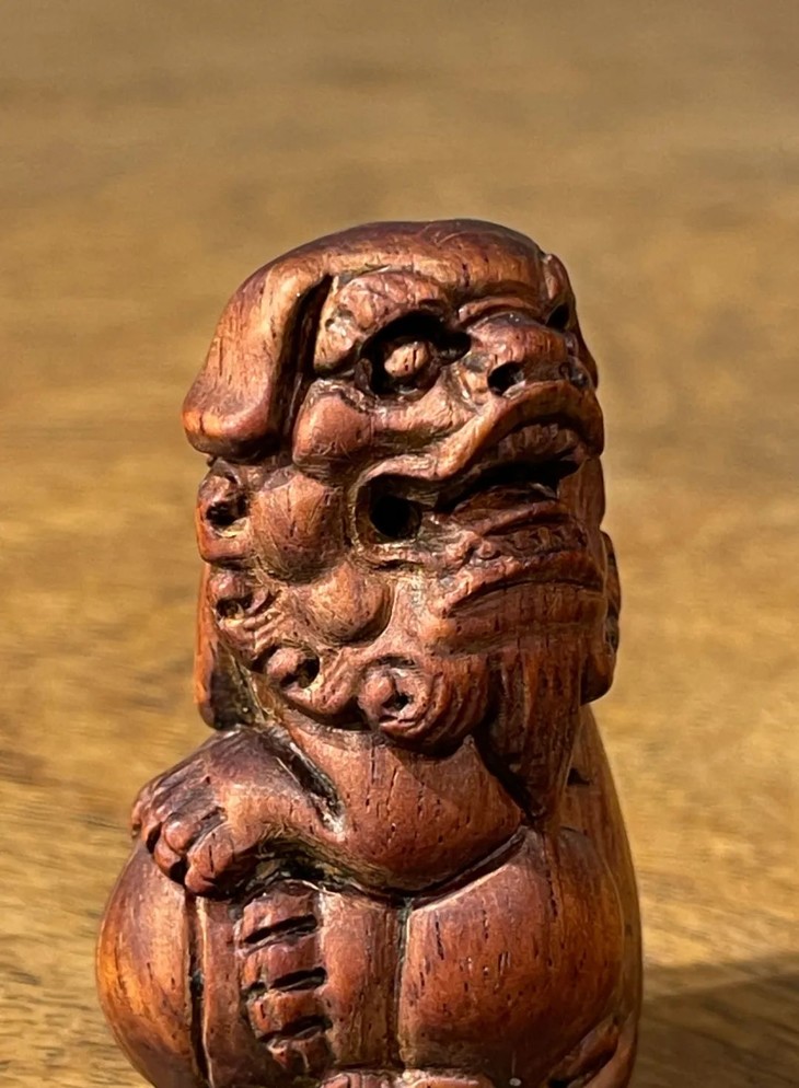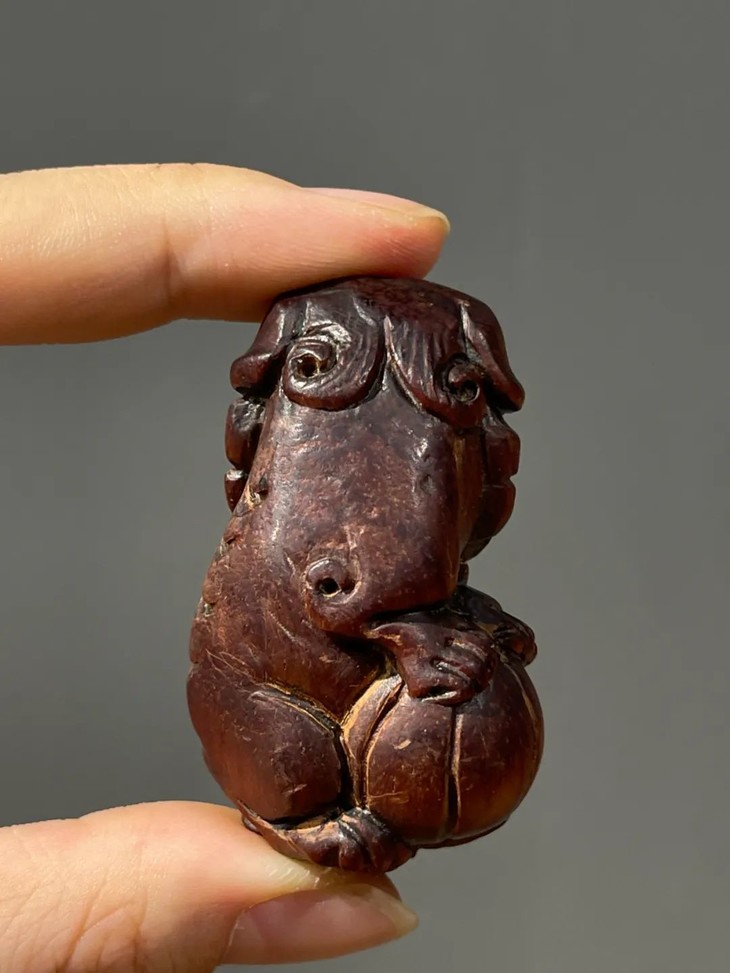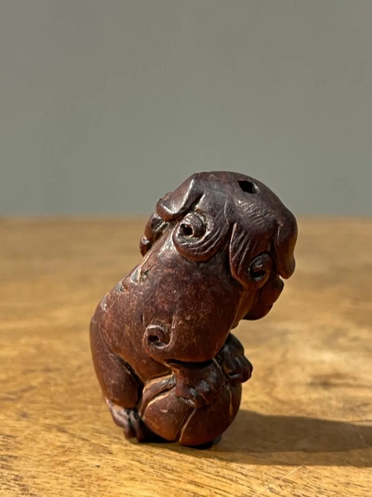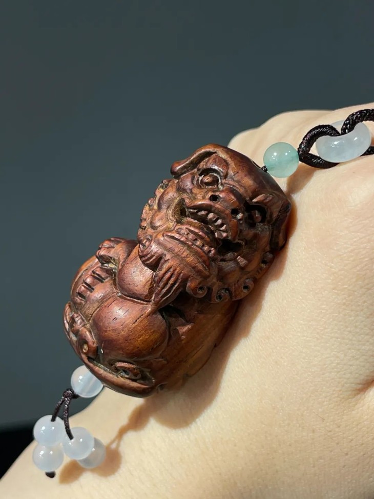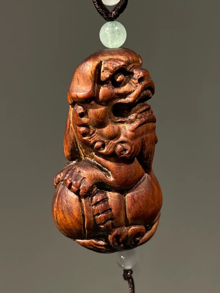 此黄花梨木雕绣球瑞狮吊坠,是典型早期瑞狮造型风格,雕刻刀工利落明快,庄重优雅。老黄花梨木小雕塑,仍然保存完好无损,老黄花梨木包浆皮壳渾厚细腻,真是难能可贵。