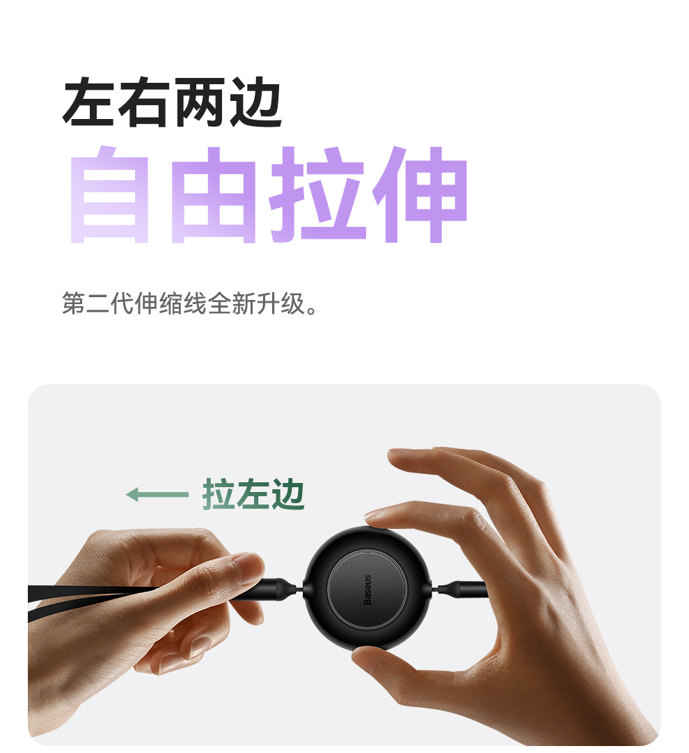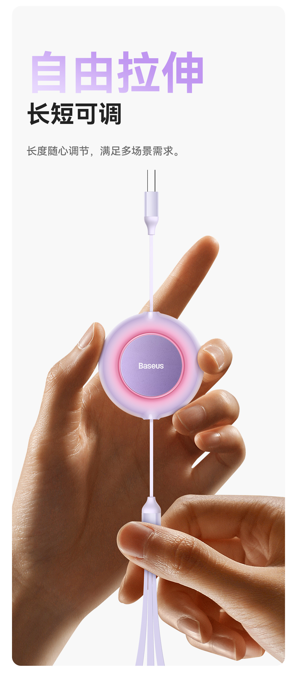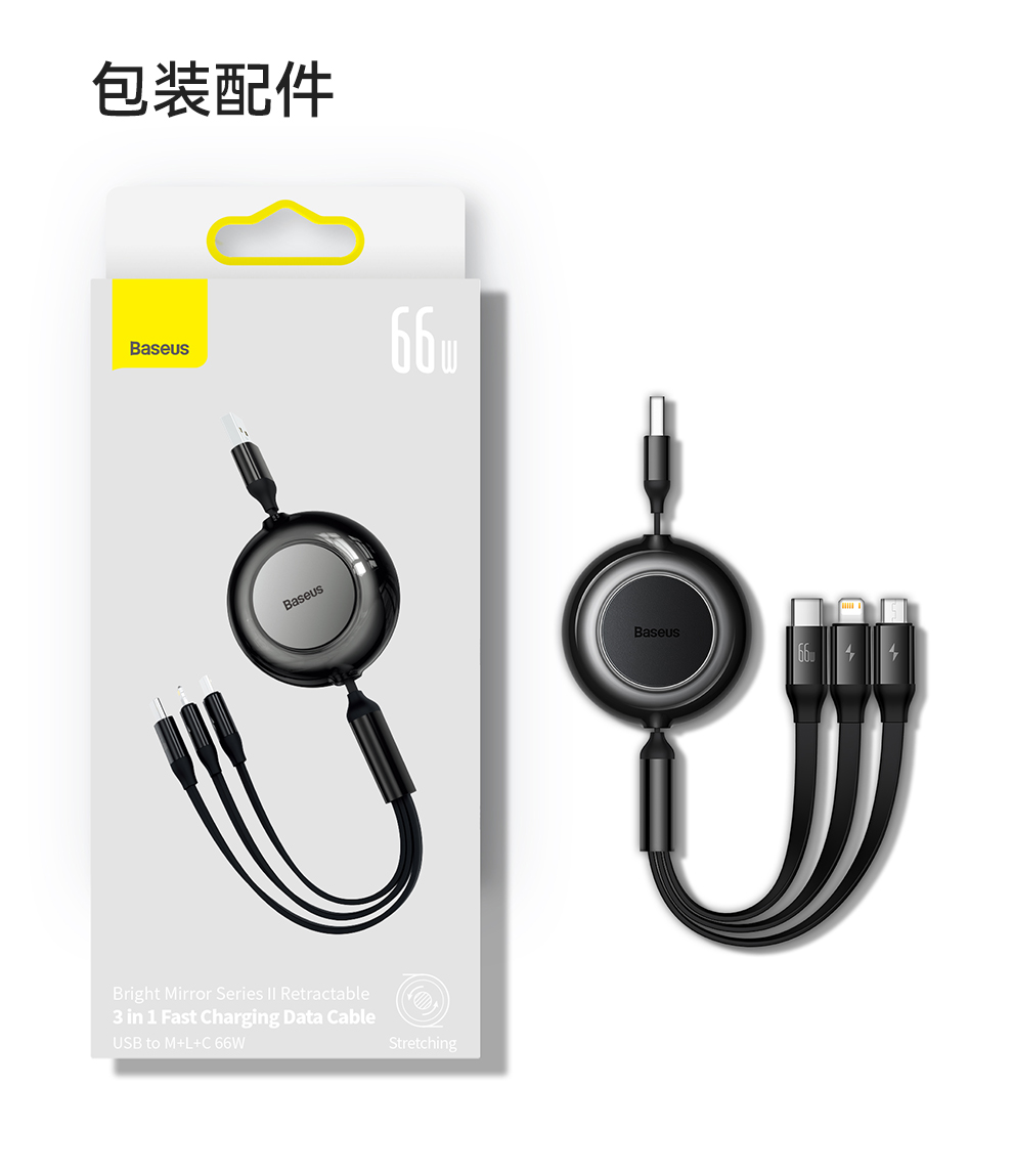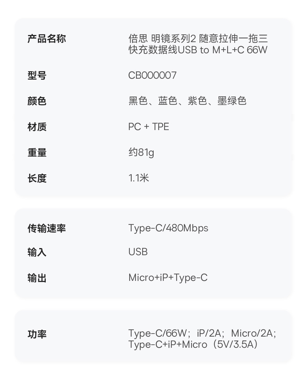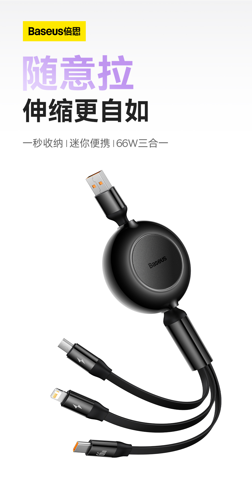 倍思 明镜系列2 随意拉伸一拖三快充数据线USB to M+L+C 66W 1.1m