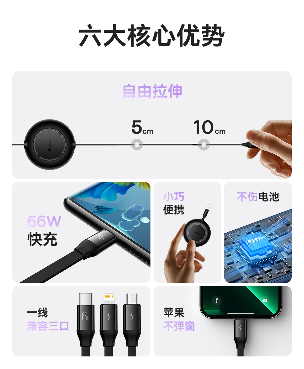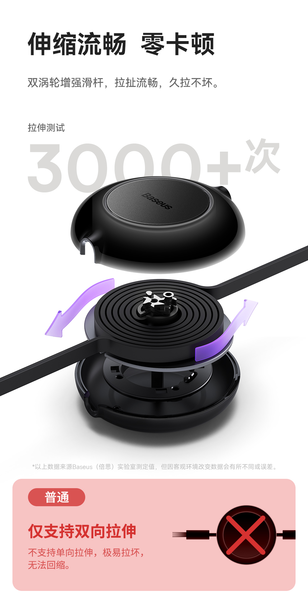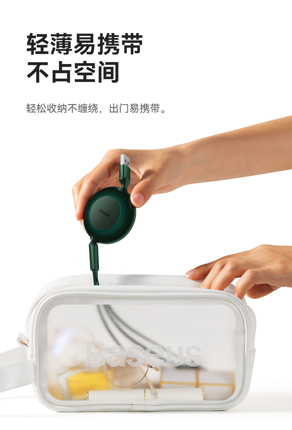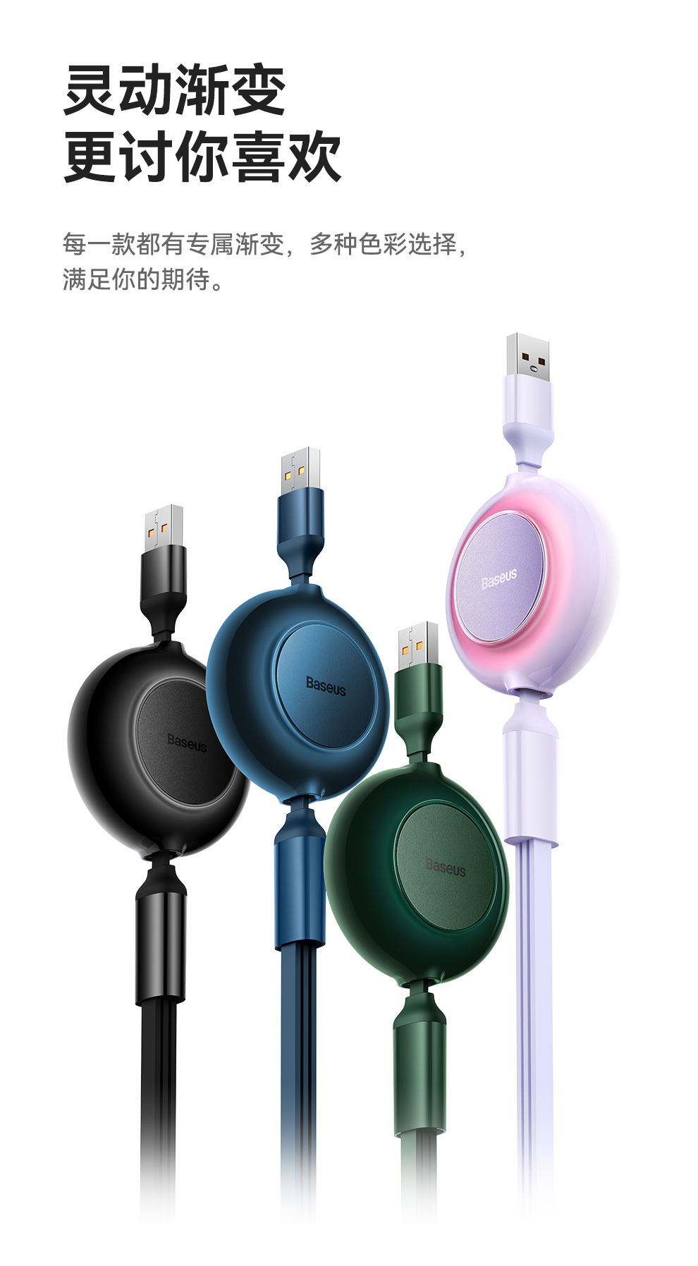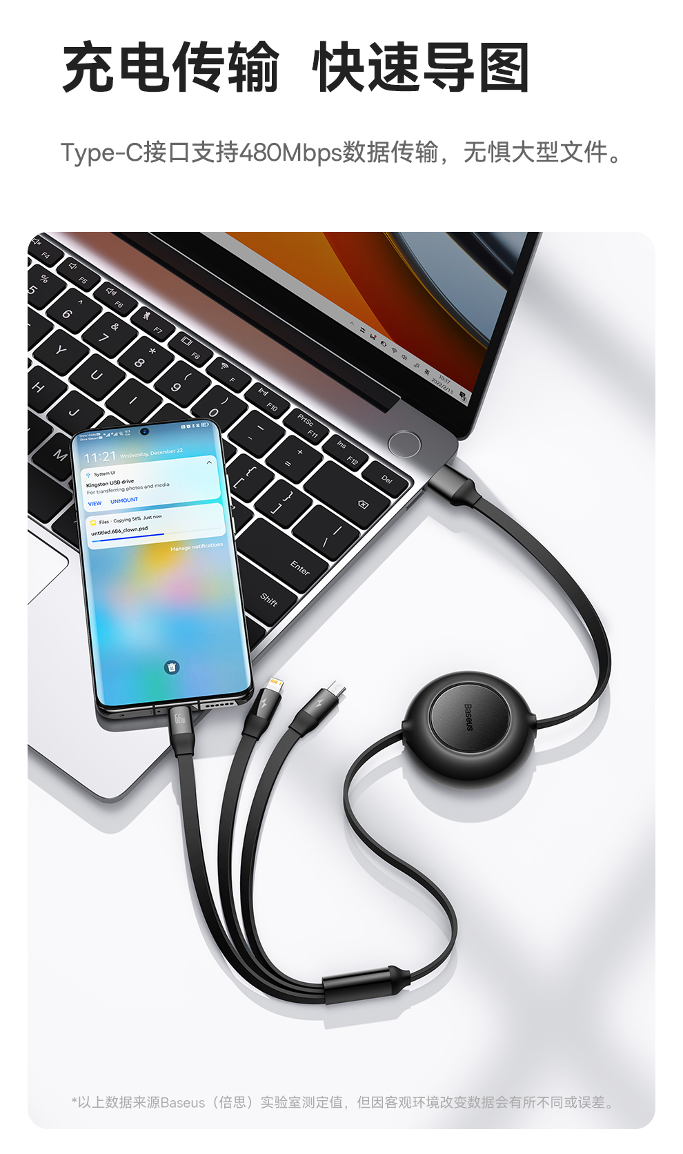 倍思 明镜系列2 随意拉伸一拖三快充数据线USB to M+L+C 66W 1.1m