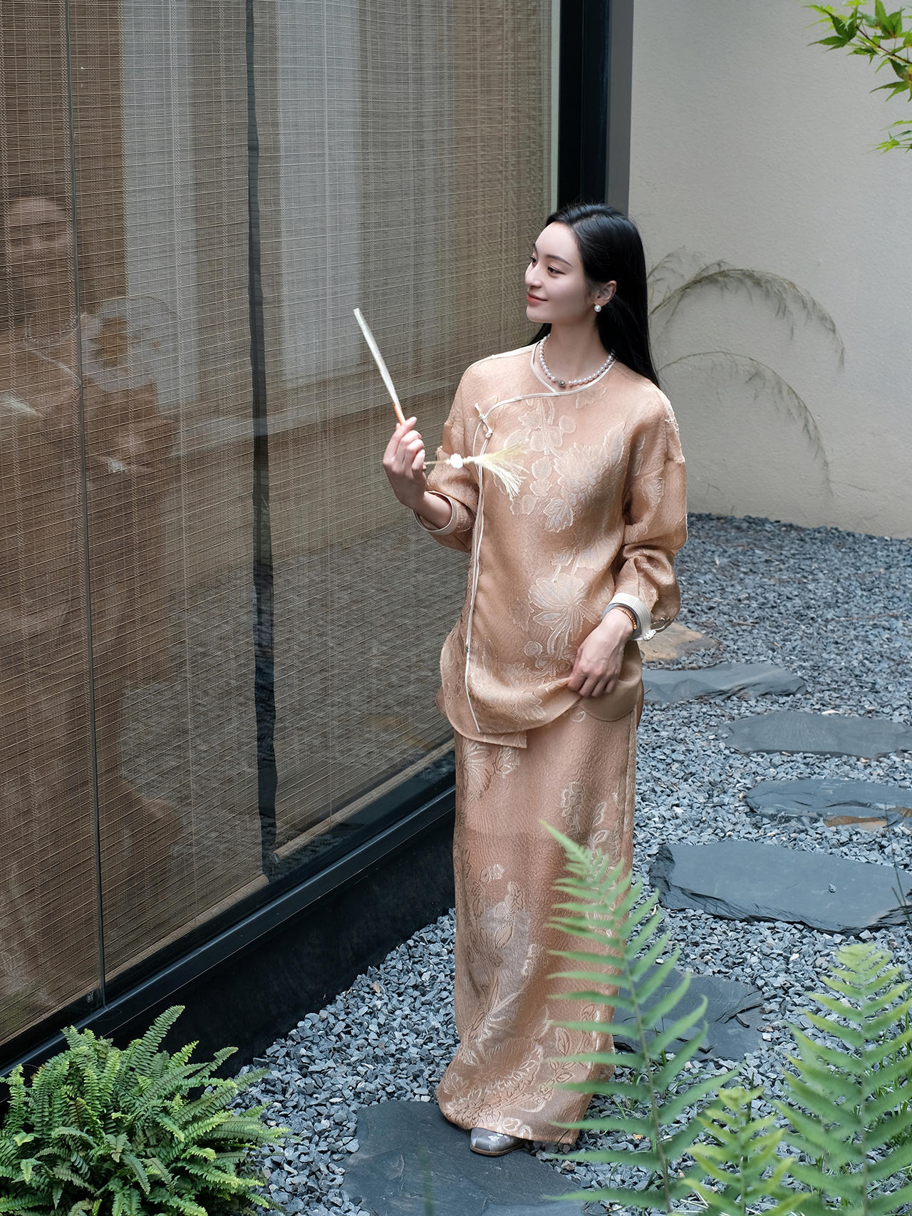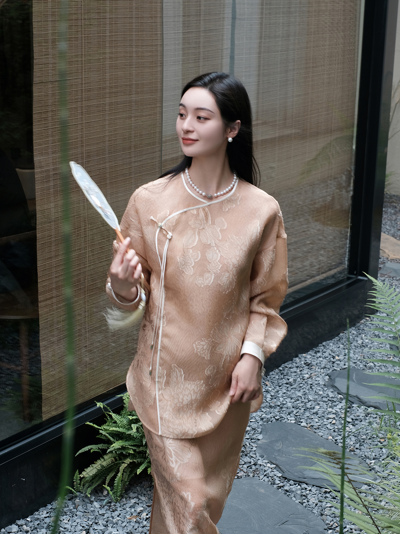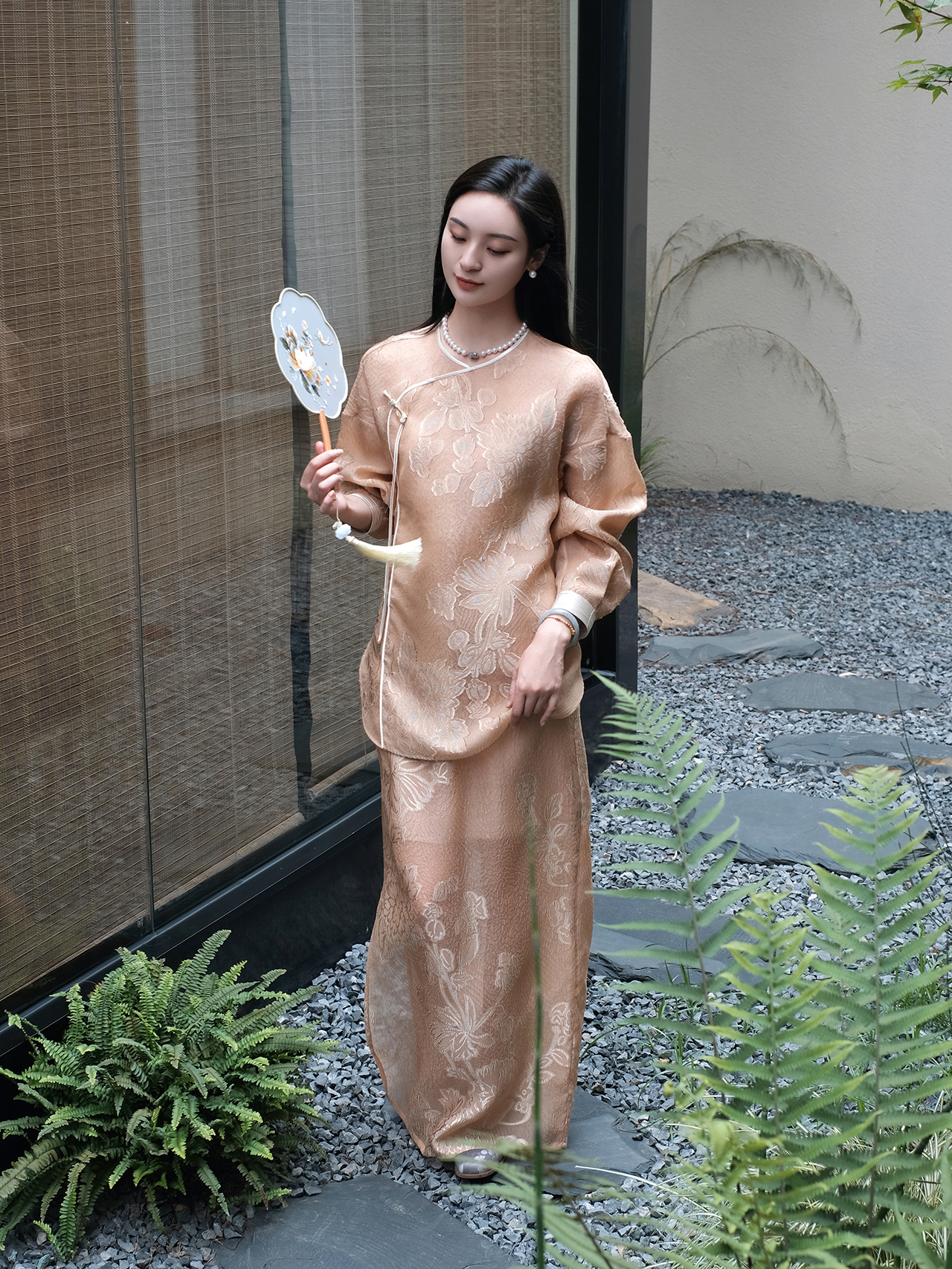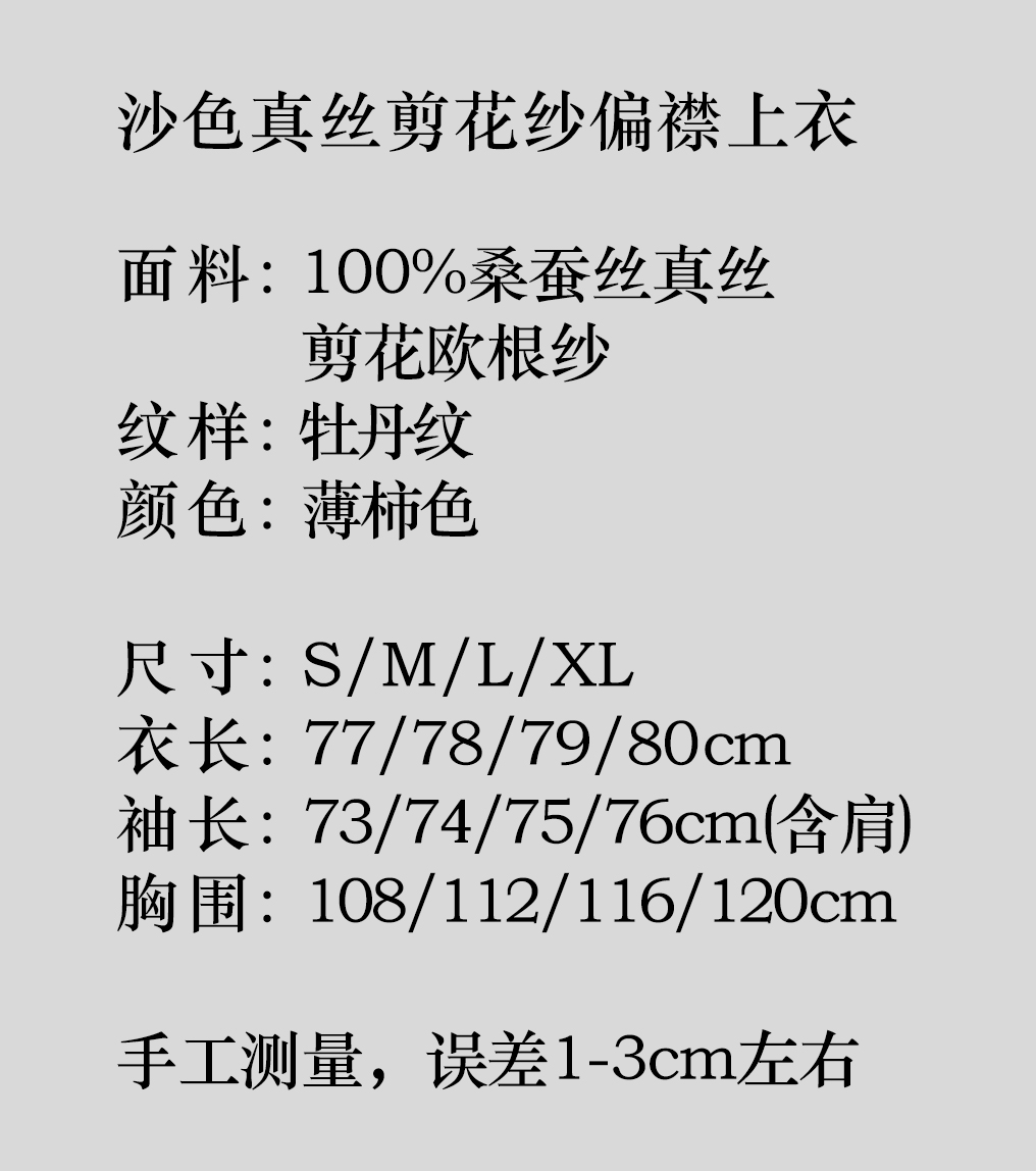盛唐牡丹 |沙色真丝剪花纱偏襟上衣
