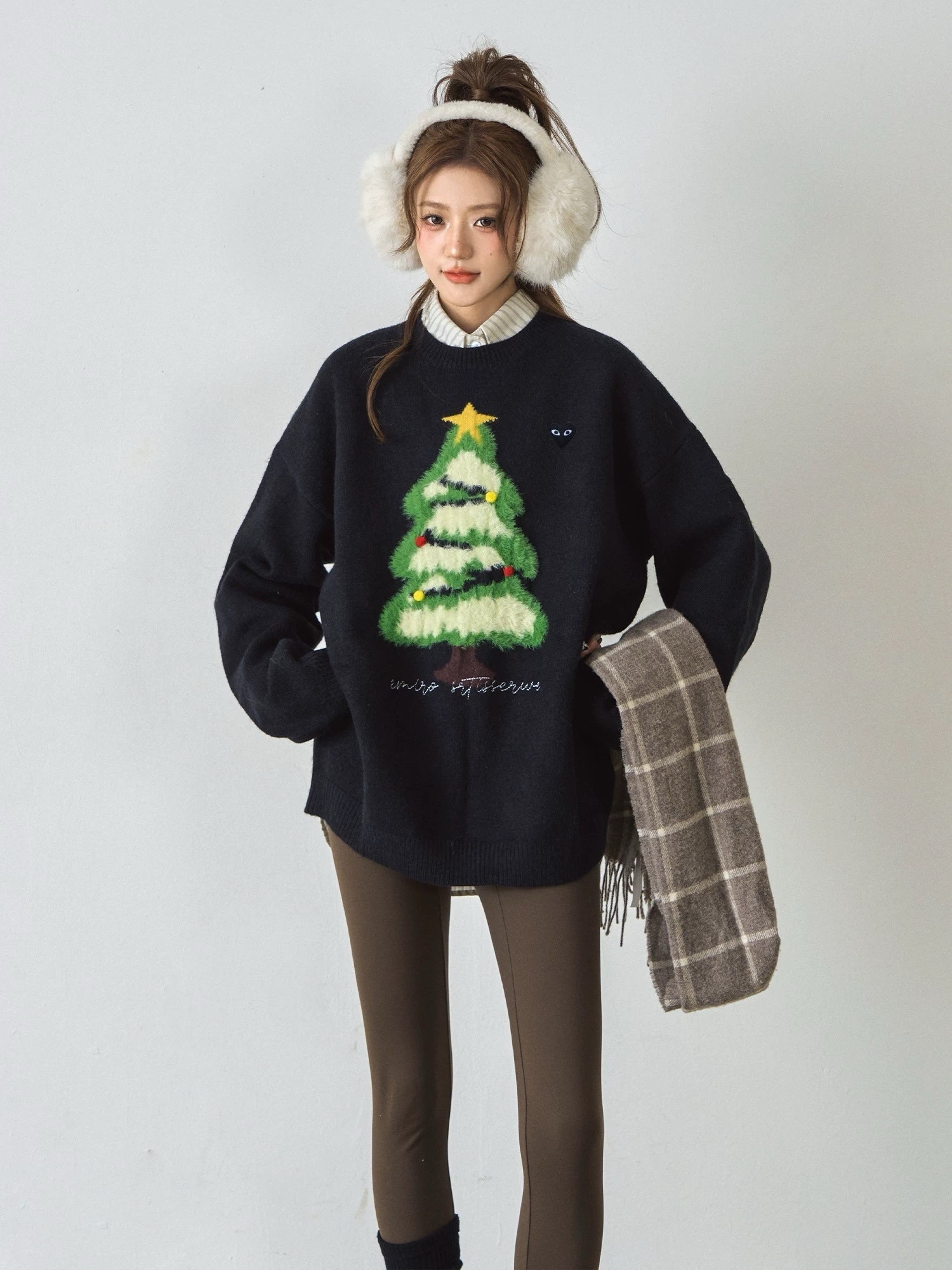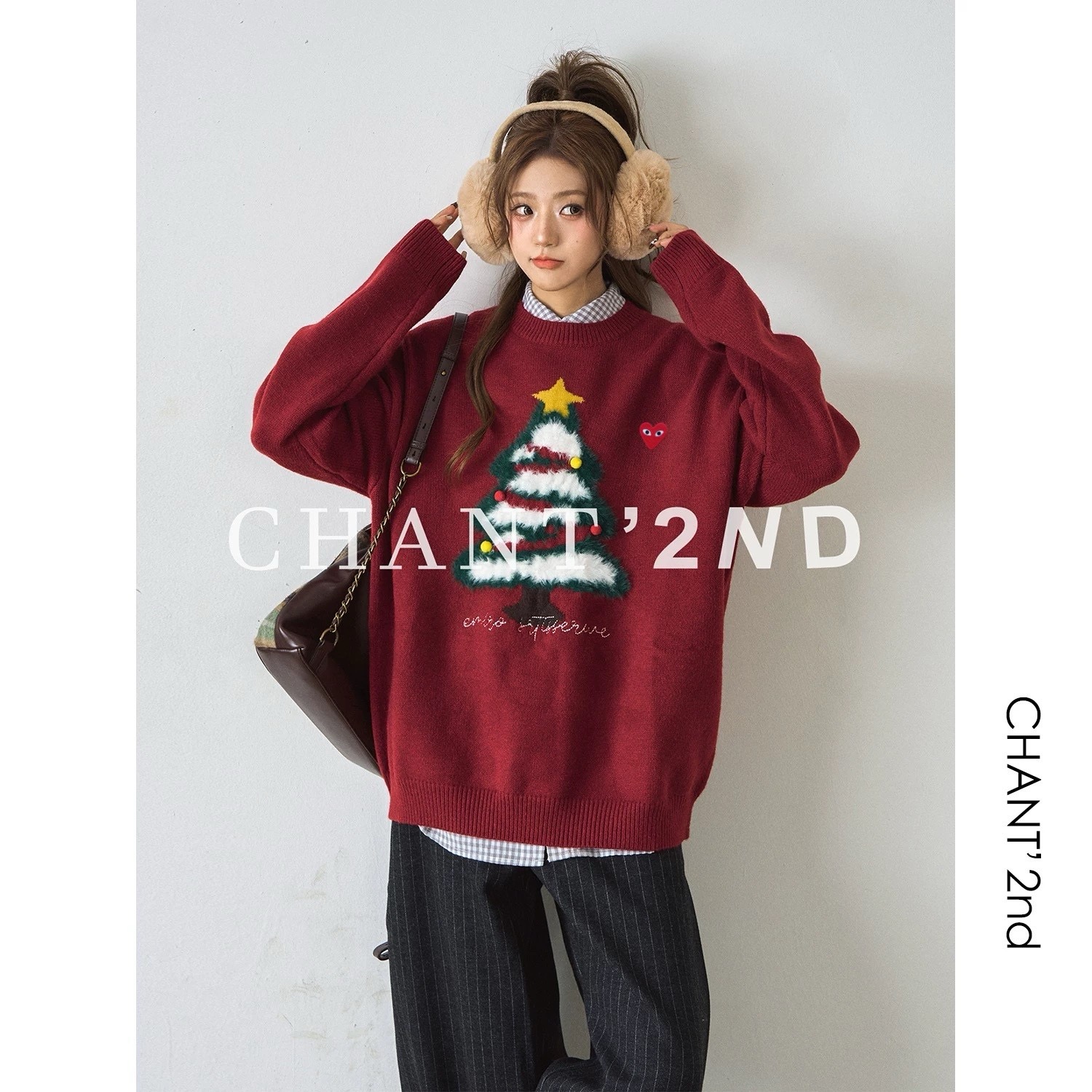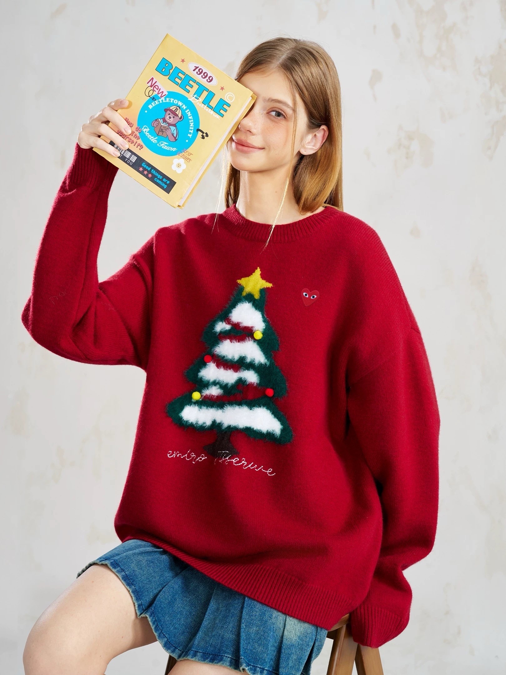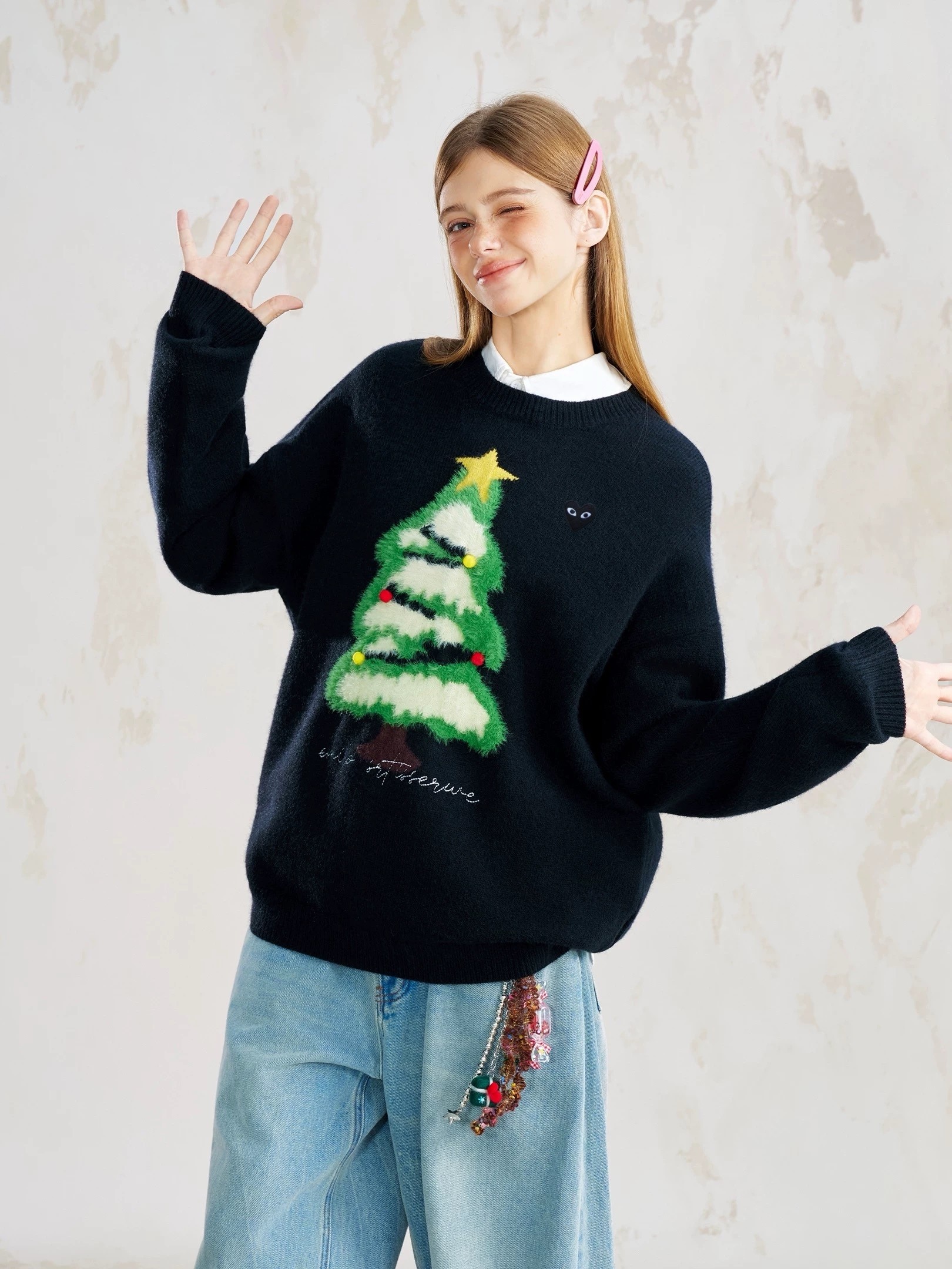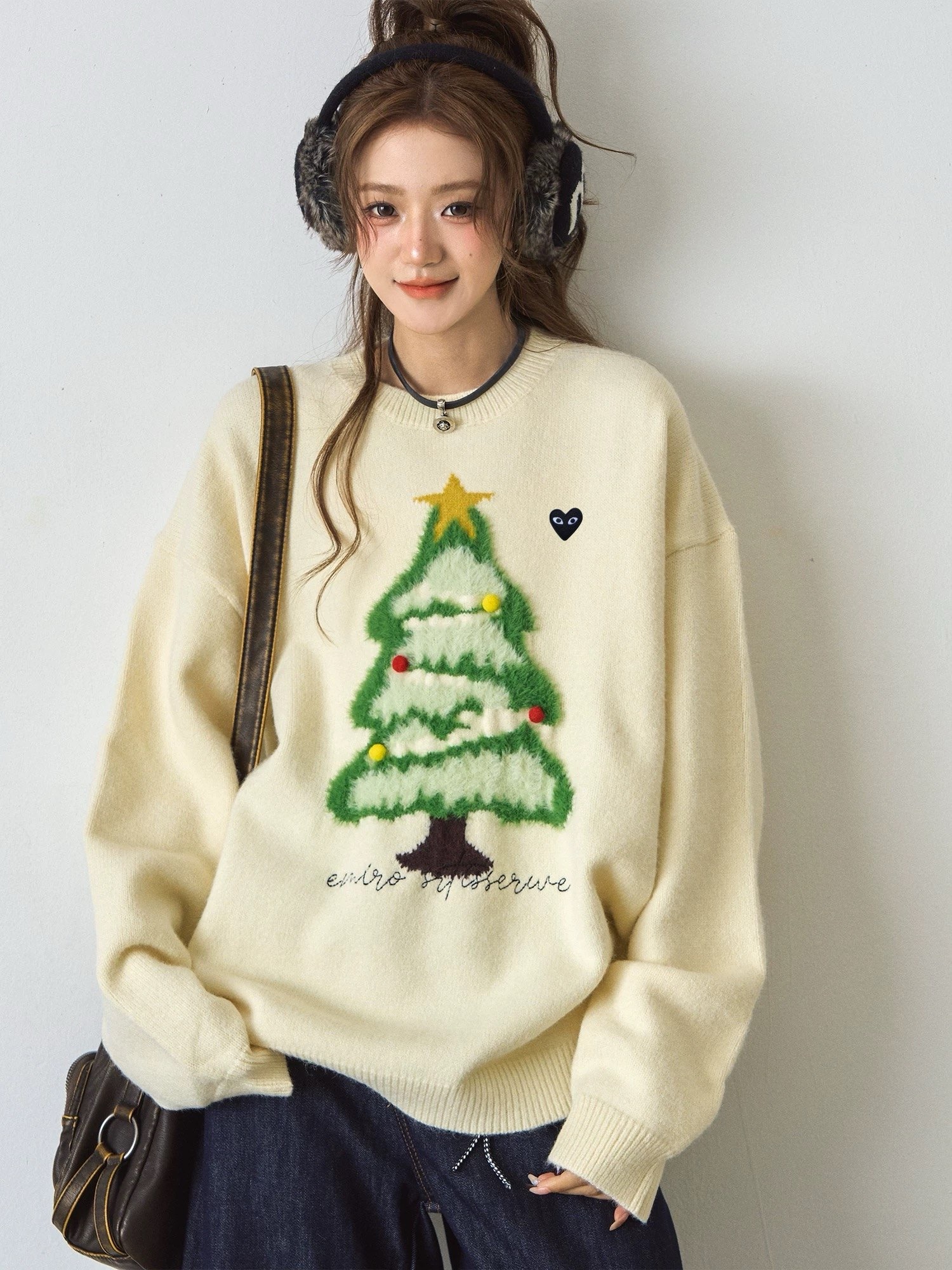 充满节日氛围的红色圆领毛衣。它采用了宽松的oversize版型,穿着舒适且有很好的包容性。毛衣的主体是均匀的平针纹理,质感细腻,保暖性强。醉引人注目的是胸前的圣诞树图案,绿色的树干和树枝上点缀着白色的“积雪”,顶部还有一颗黄色的星星,树上还挂着红、黄两色的小装饰球,充满了圣诞气息。圣诞树下方有一行白色的英文刺绣,增加了细节感。左胸口处有一个小巧的红色心形刺绣标志,上面有一只眼睛的图案,为整体造型增添了几分俏皮和个性。 这款毛衣非常适合在圣诞节期间穿着,无论是搭配牛仔裤、半身裙还是阔腿裤,都能轻松打造出节日氛围浓厚的造型。