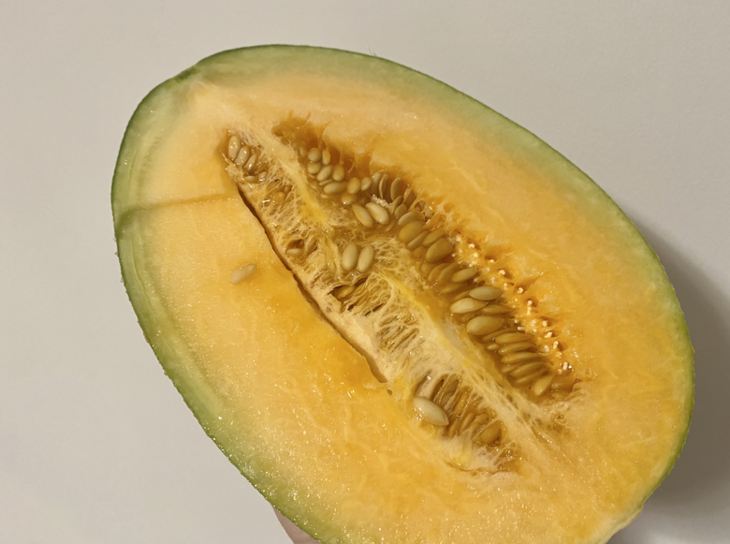 西州蜜瓜纹理清晰,对半切皮薄瓜瓤很新鲜,闻起来有股清甜香。