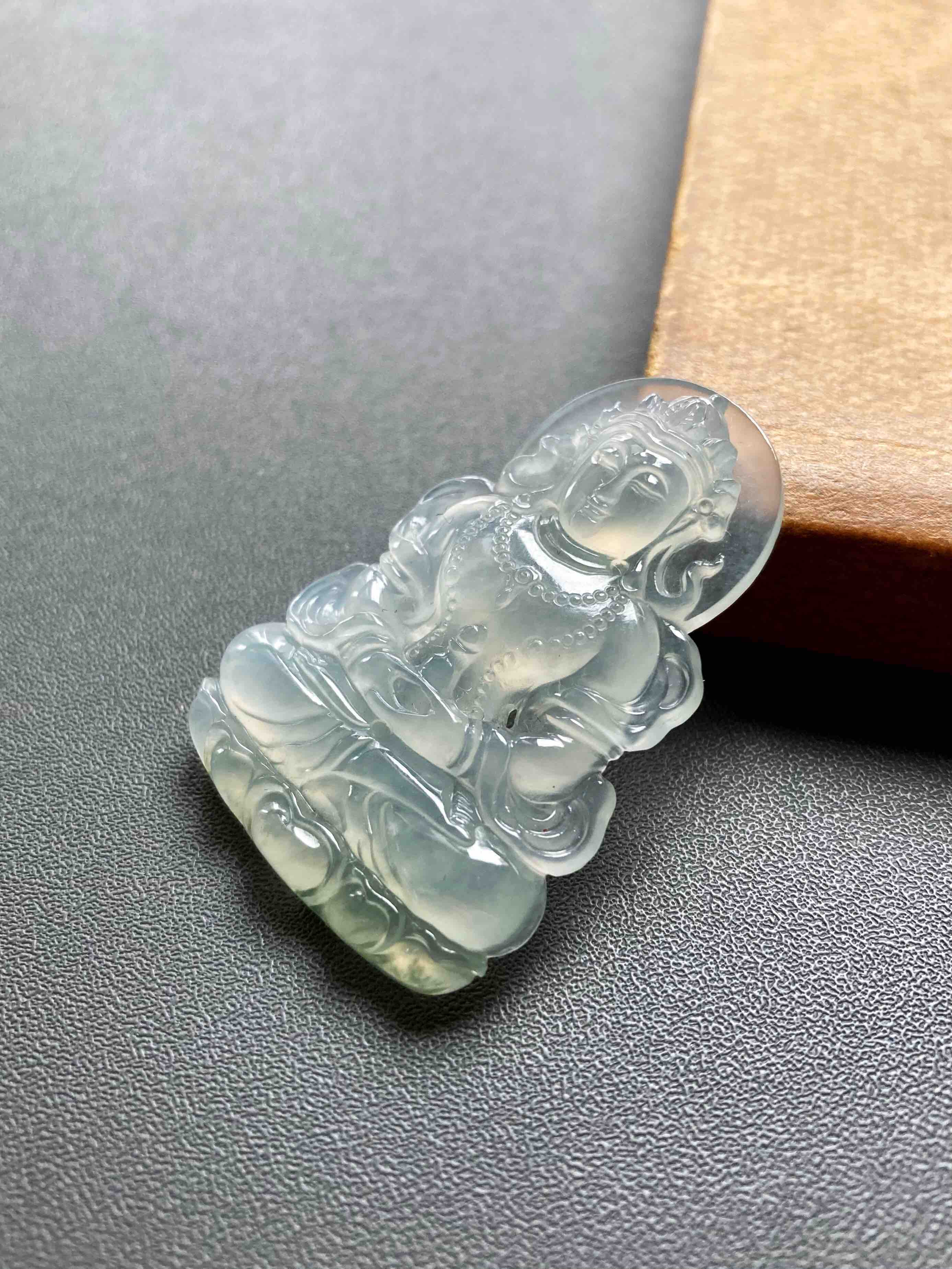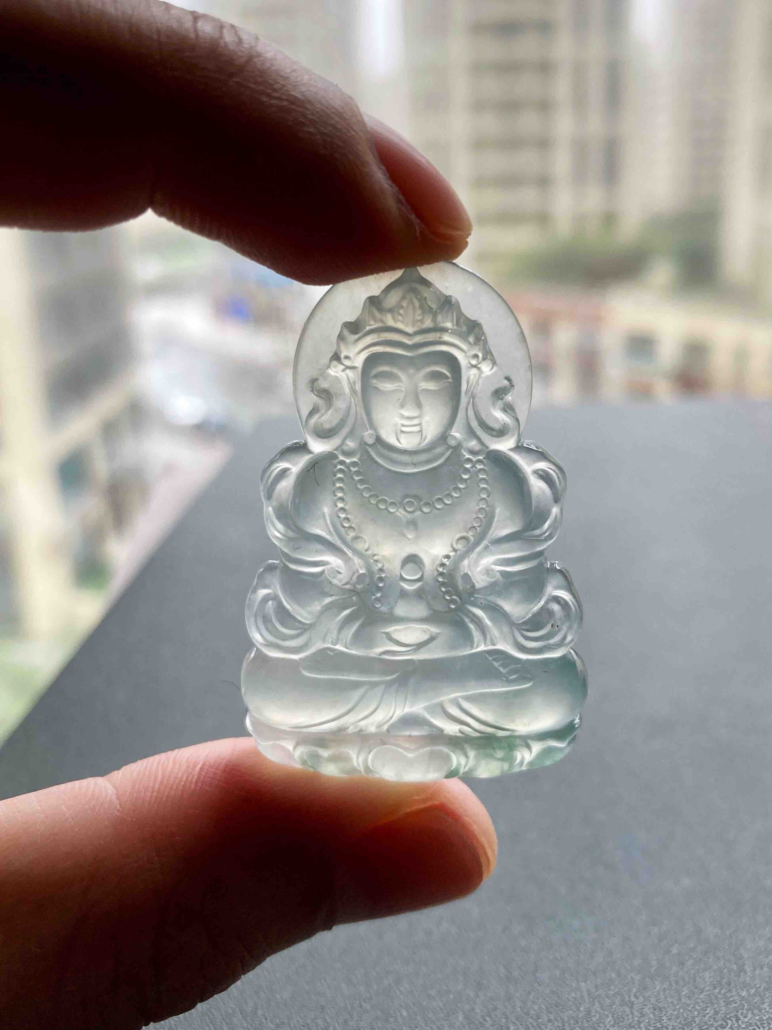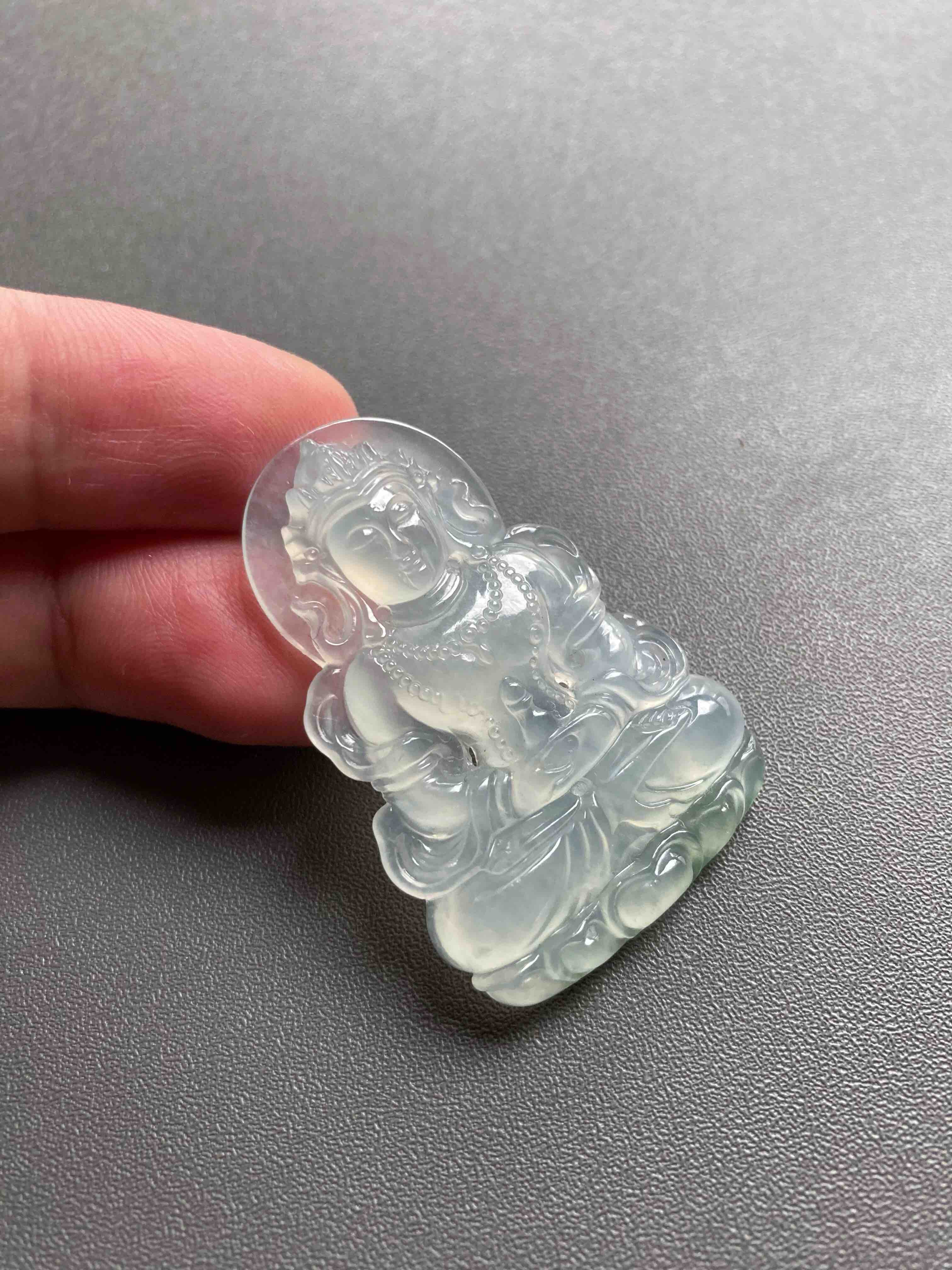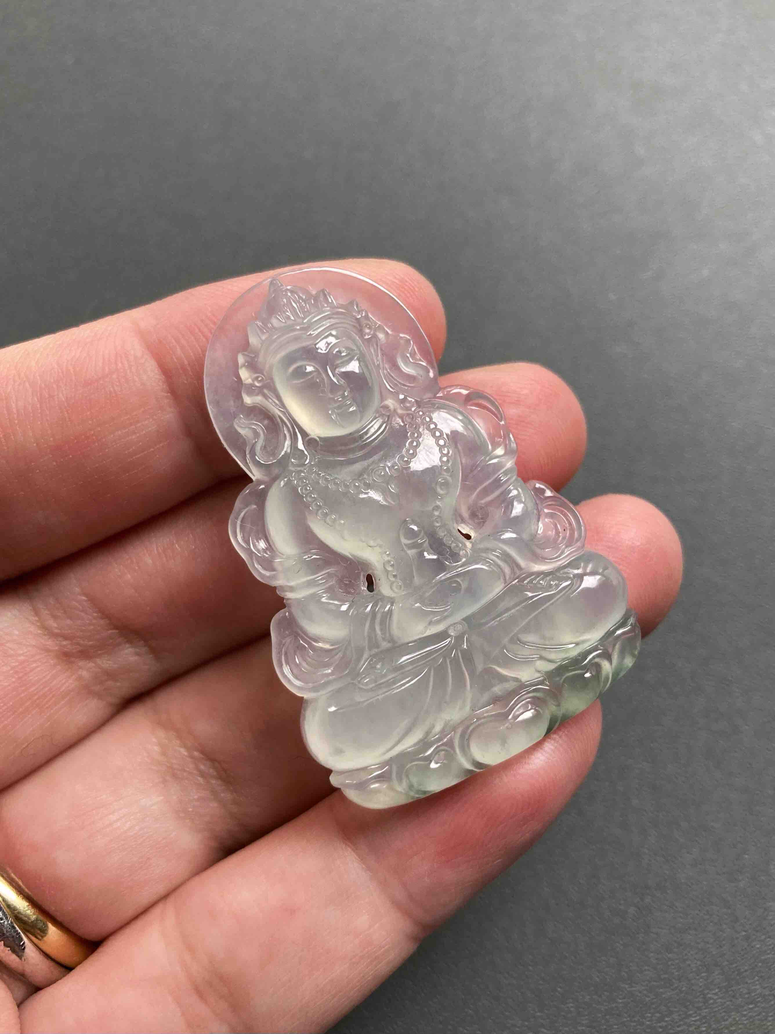 高冰种飘花精雕翡翠度母,42.5×28.7×5.5mm,种水美到爆,晶莹剔透,纯手工精雕细刻,细节刻画精美无比,度母保平安,寓意吉祥,同档次的都是五位数以上了,这件四位数高性价比精品推荐