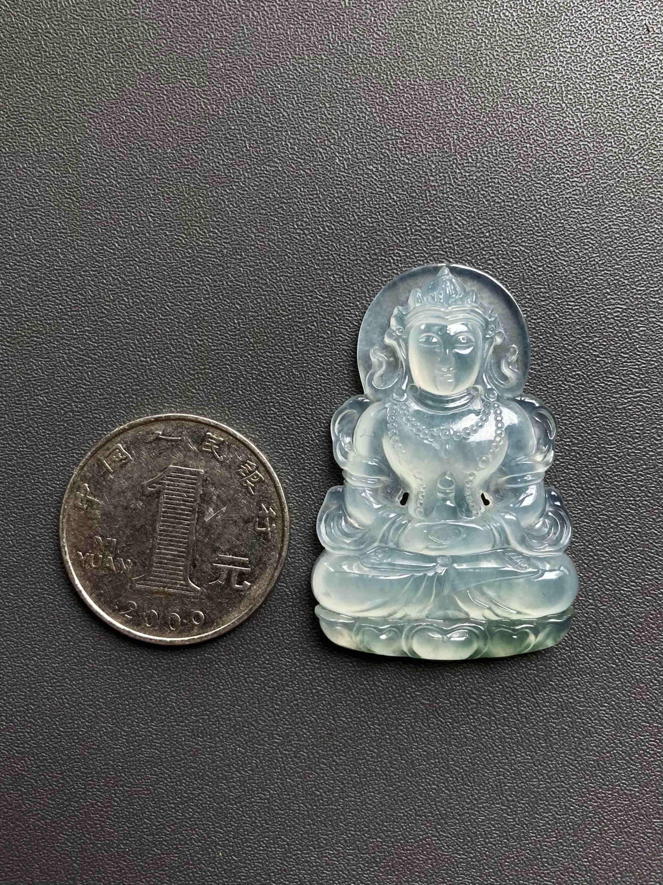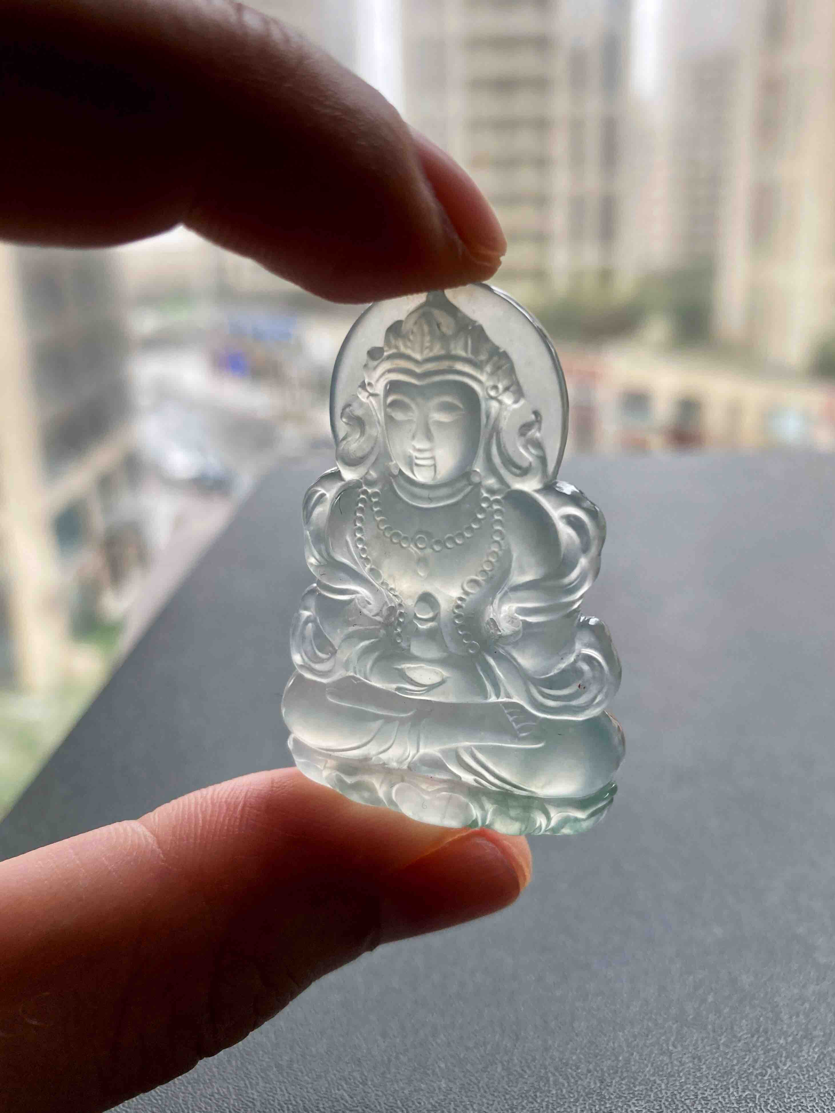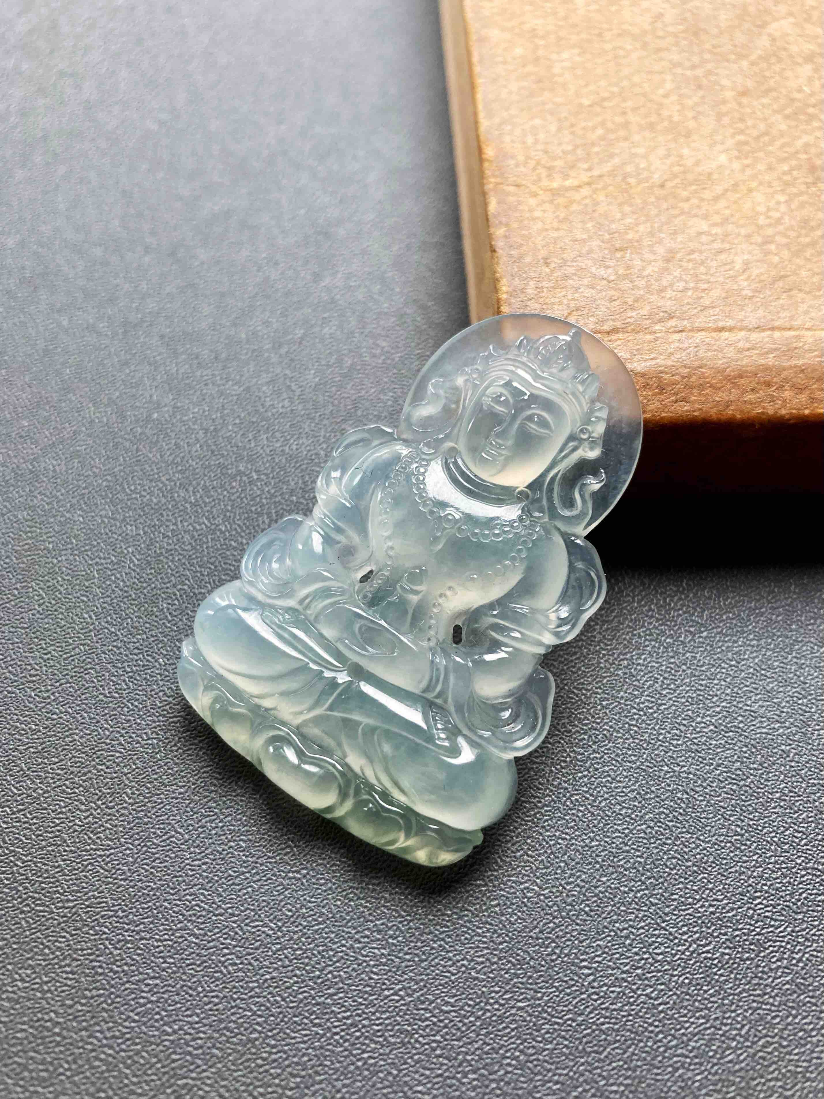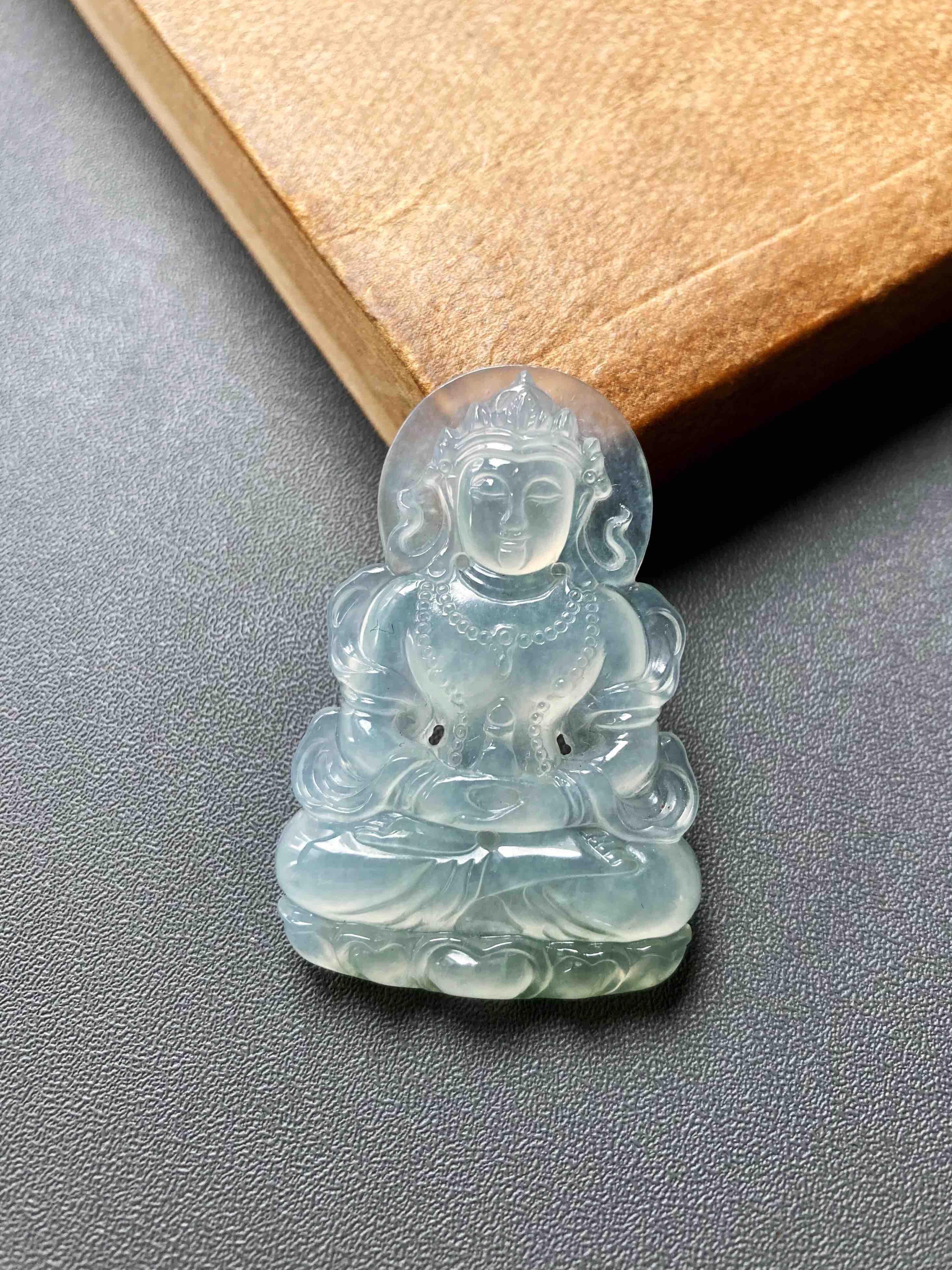 高冰种飘花精雕翡翠度母,42.5×28.7×5.5mm,种水美到爆,晶莹剔透,纯手工精雕细刻,细节刻画精美无比,度母保平安,寓意吉祥,同档次的都是五位数以上了,这件四位数高性价比精品推荐