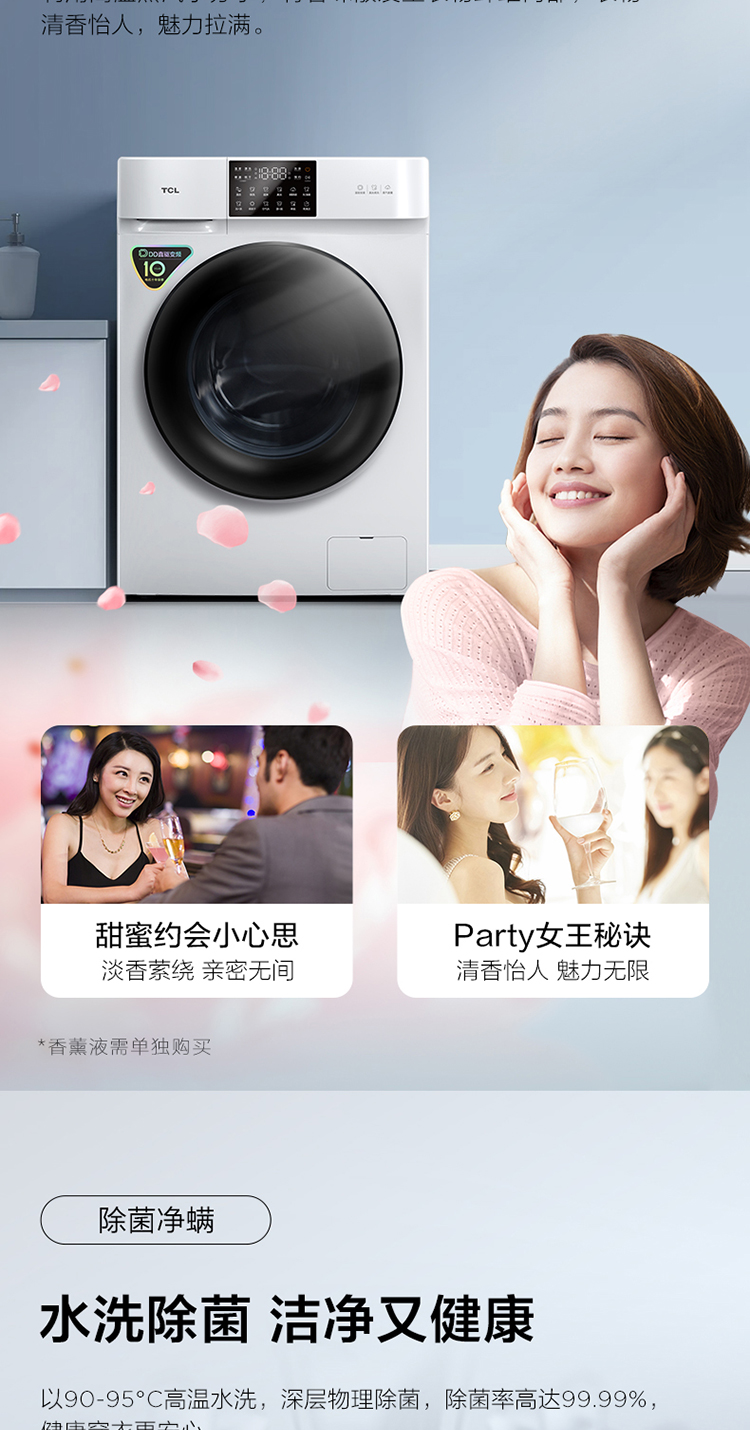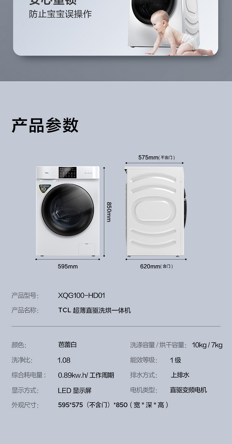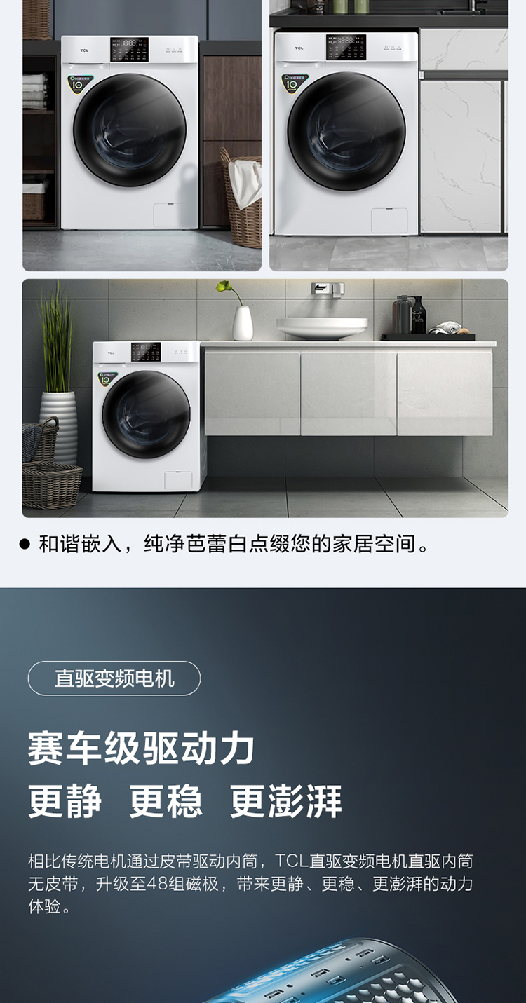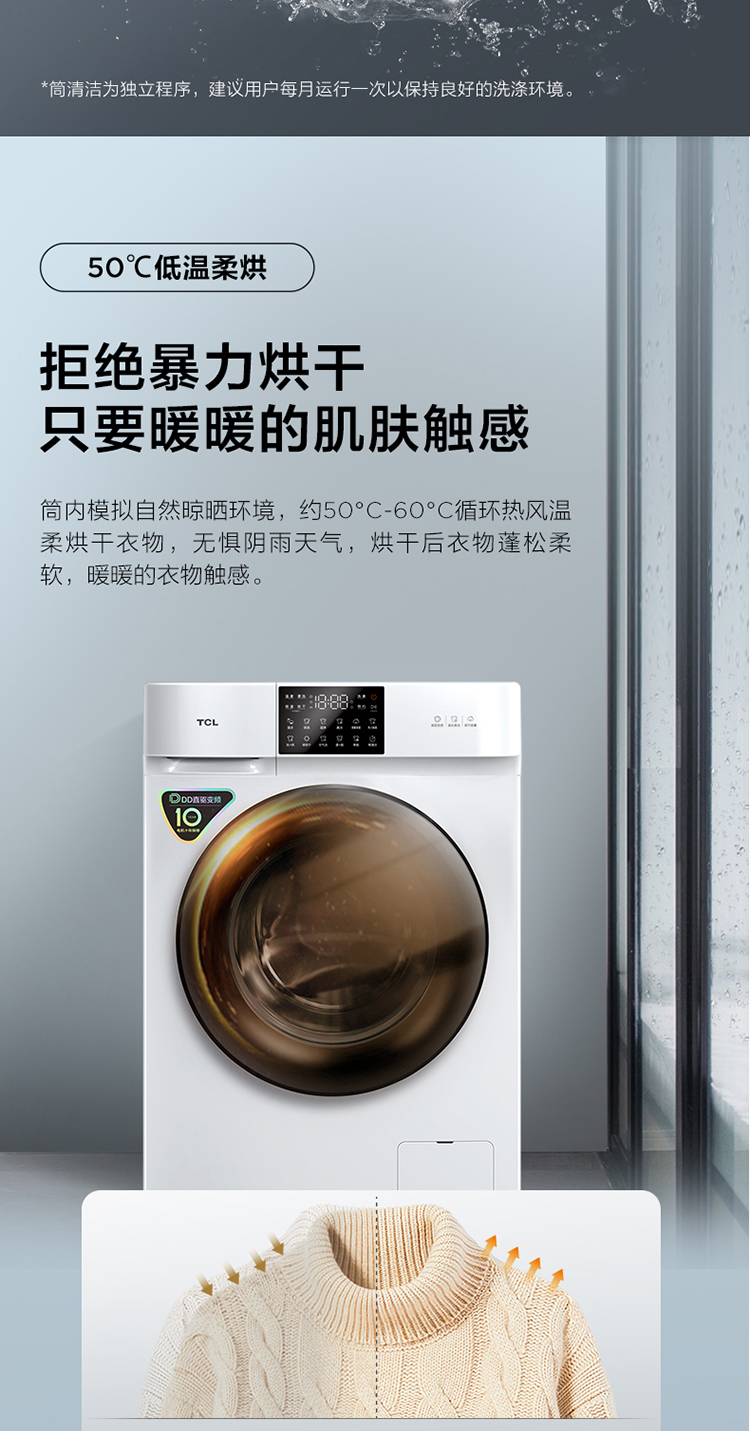 【TCL洗衣机】TCL 10KGDD直驱G100变频滚筒洗衣机洗烘一体 XQG100-HD01