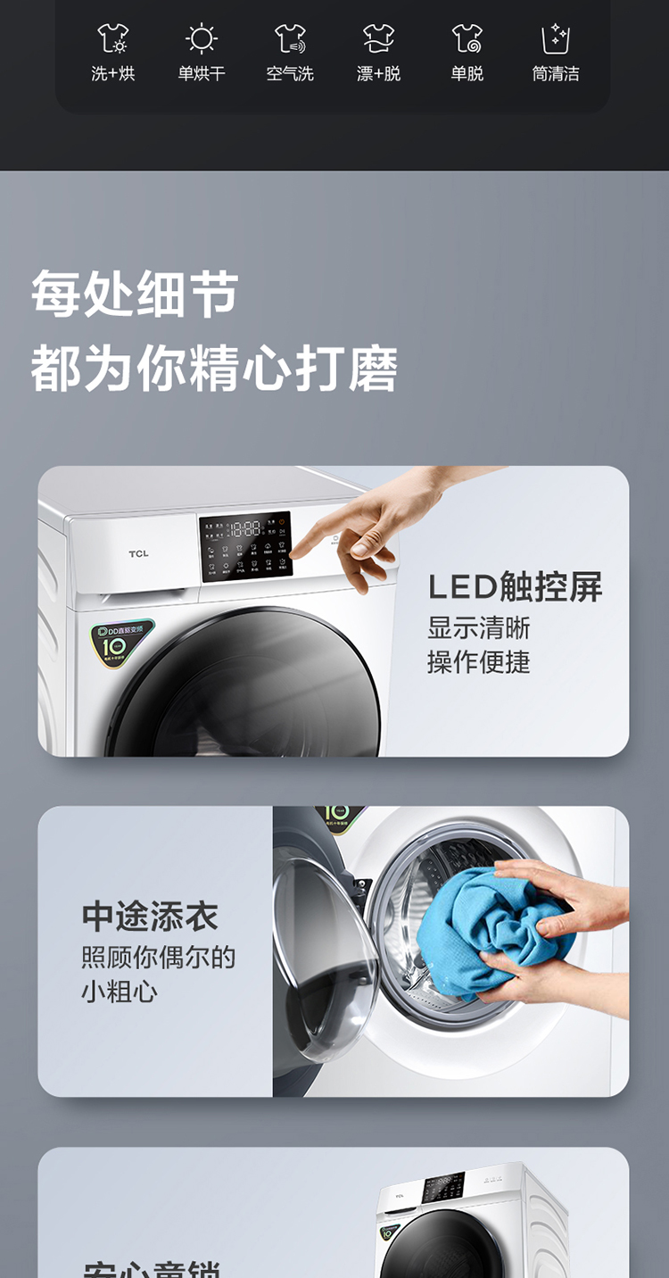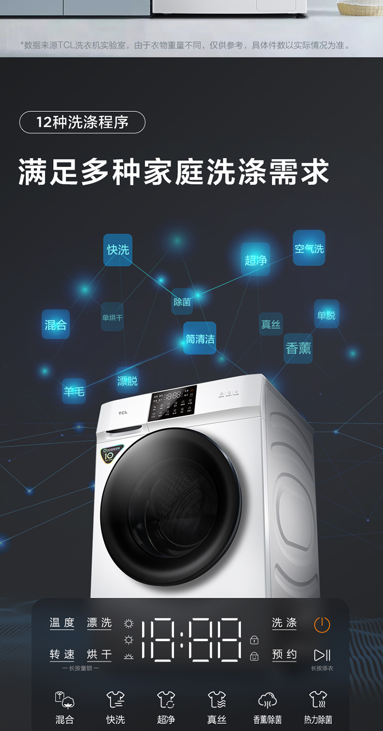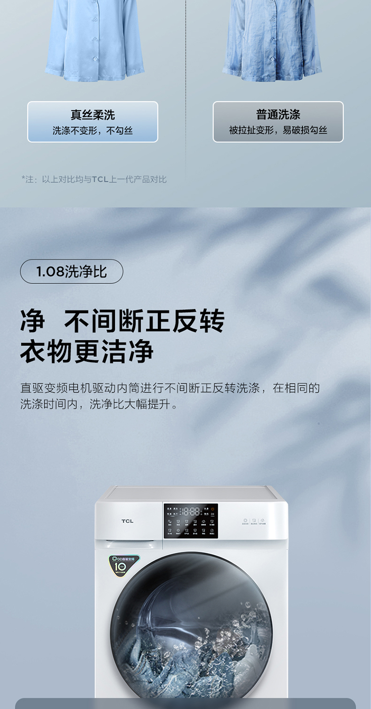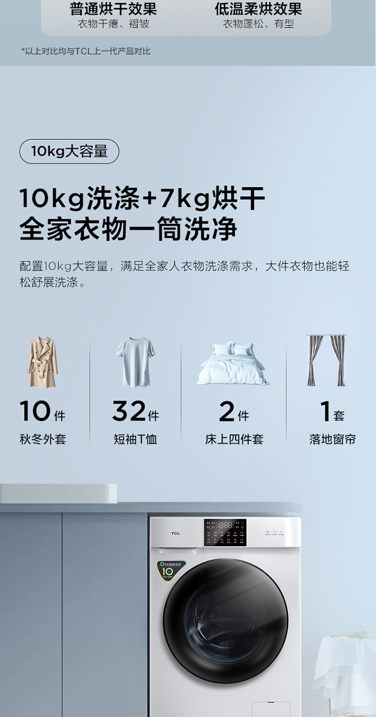 【TCL洗衣机】TCL 10KGDD直驱G100变频滚筒洗衣机洗烘一体 XQG100-HD01
