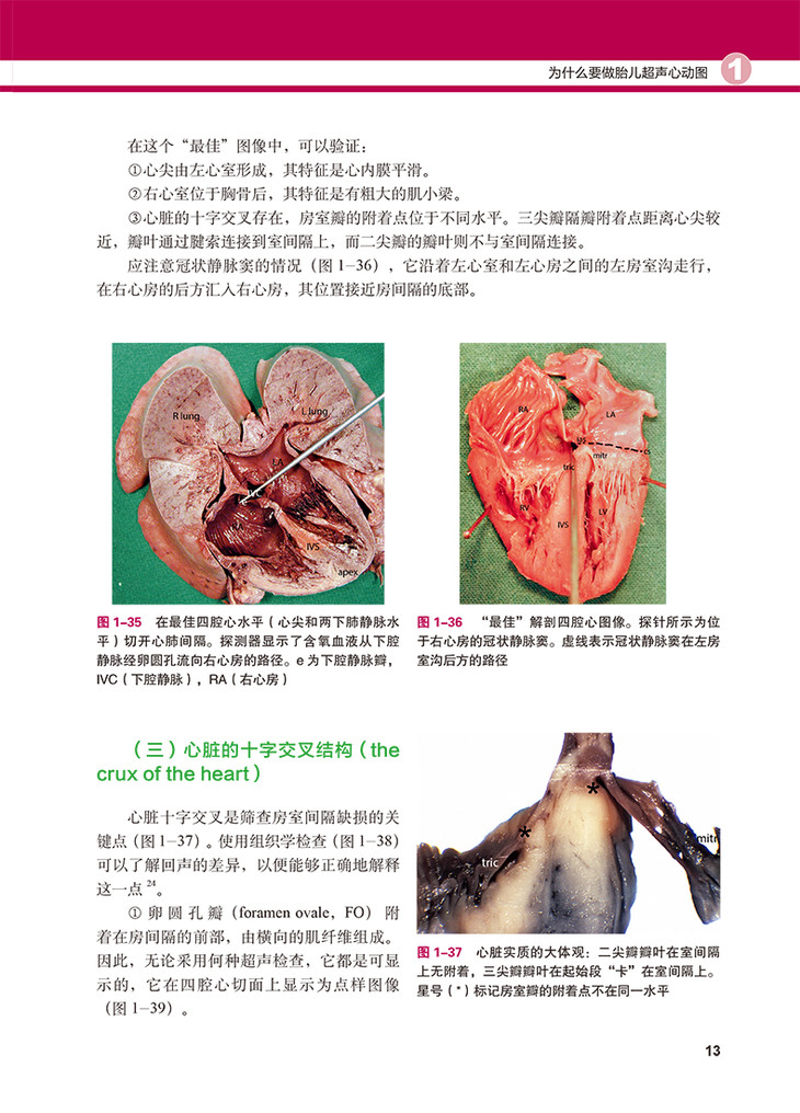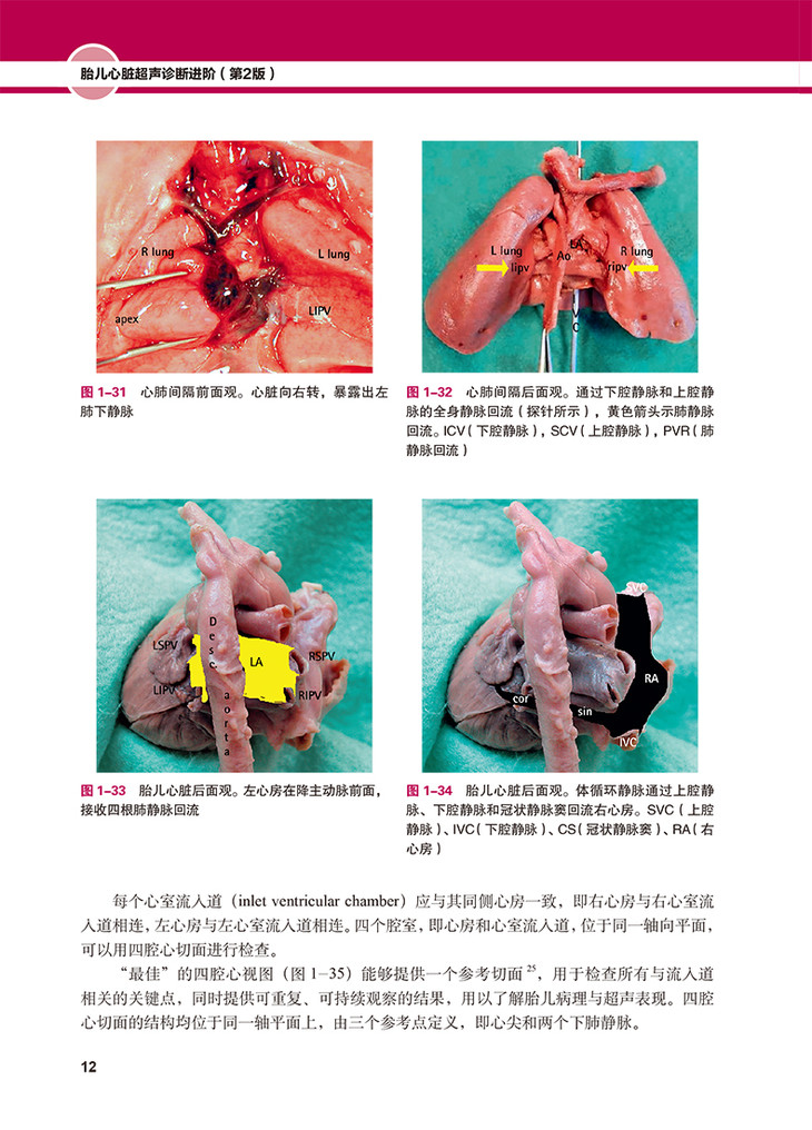 她们通过一系列图例循序地概述了胚胎学和心脏解剖学。她们解释并定义行胎儿心脏检查所必需的切面,尤其是一些还未有完整记录的心脏畸形病例,以及从未见过的正常胎儿心脏示意图。