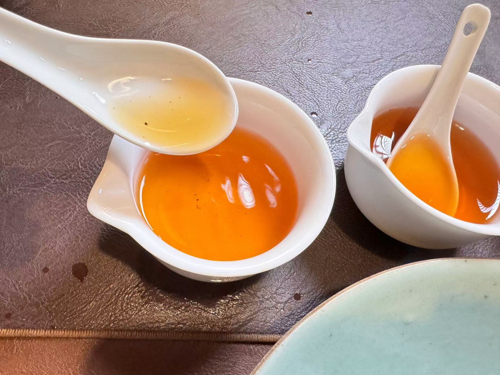 第七道:来,就是这种褐红中带着一点金黄的颜色,就是做青走水到位的表现,做过茶会看青的人都能在细节里寻找相互印证的证据链。