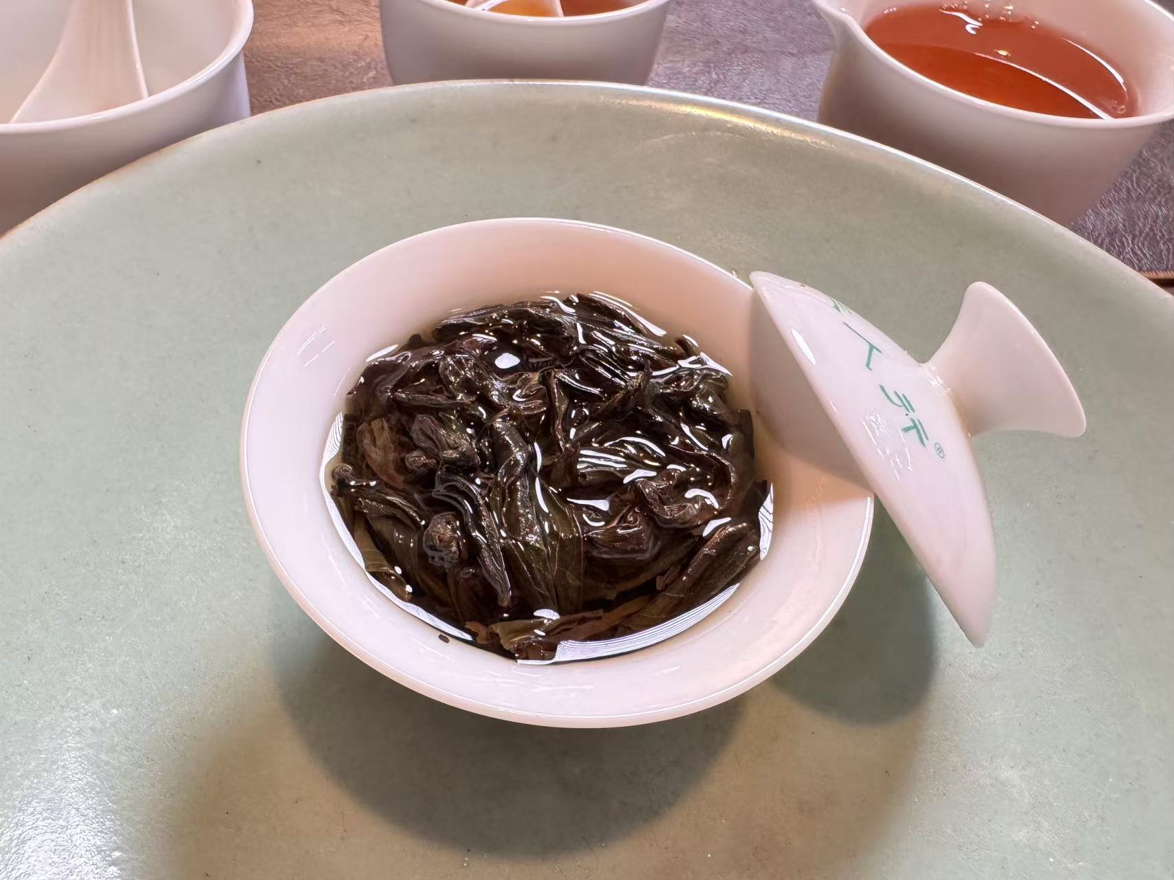第一道的香气里头,就有一种“醇”的感受在里面,很饱满,整体香气不高扬,火工香与木质香交融,青苔感稍许显现,整体香气非常“清楚”。