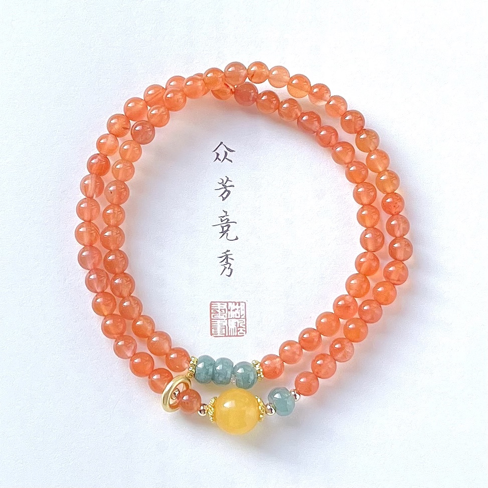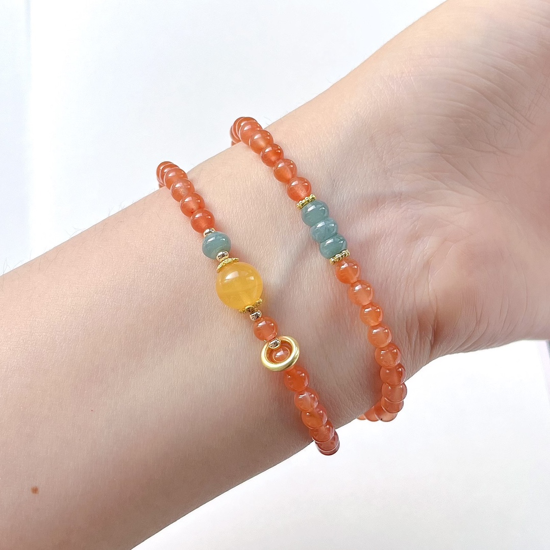 天然南红冰红手串,尺寸约5mm左右,搭配天然蓝水翡翠盘珠,蜜蜡转运珠
