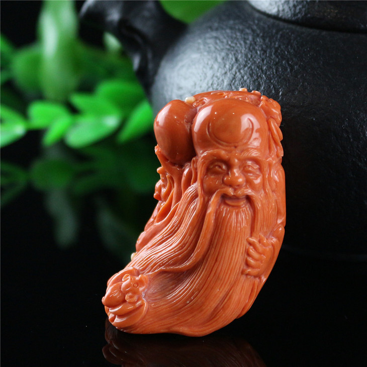 五福拜寿雕件由momo珊瑚手工雕刻而成,寿星表情立体生动,一手捻胡须,一手托寿桃,向征福禄的五只蝙蝠形态各异的围绕在寿星周围,背部祥云图案寓意吉祥如意。