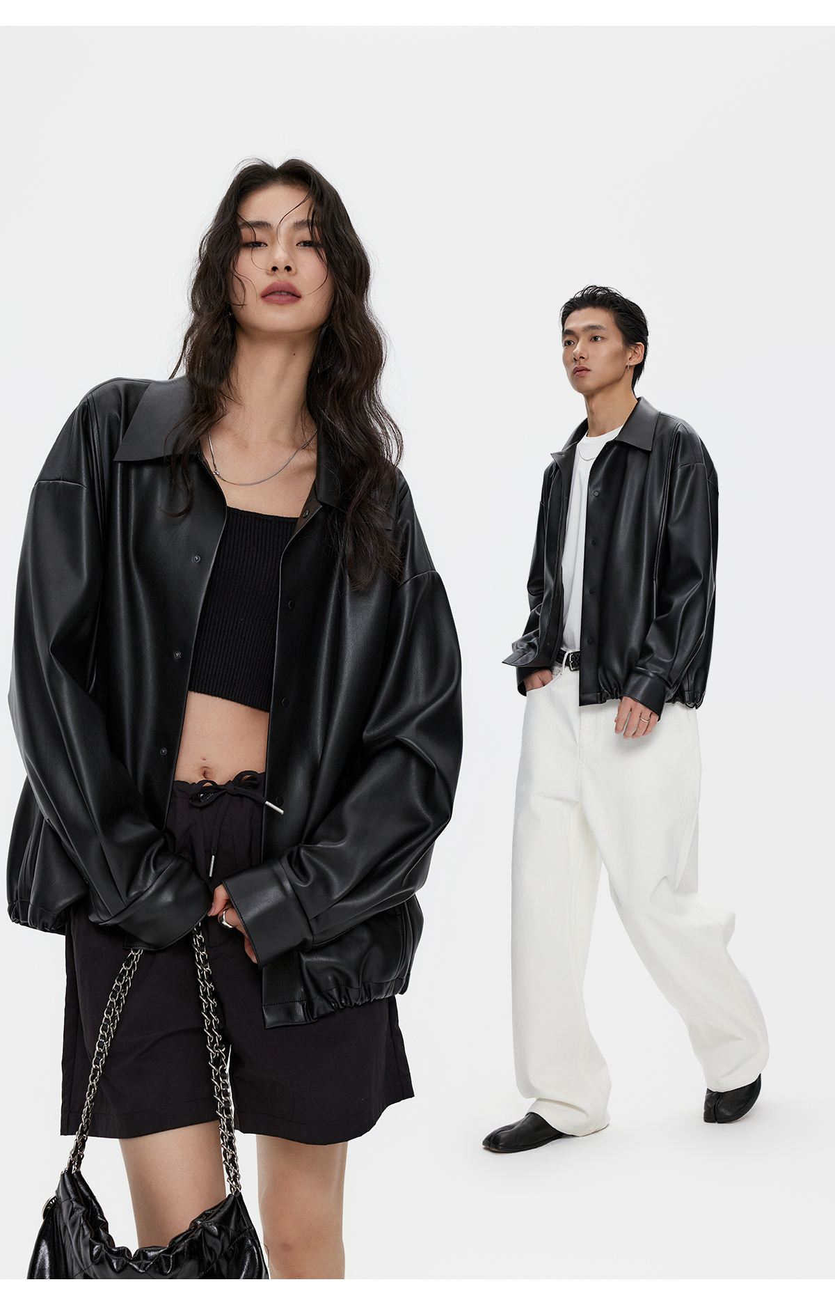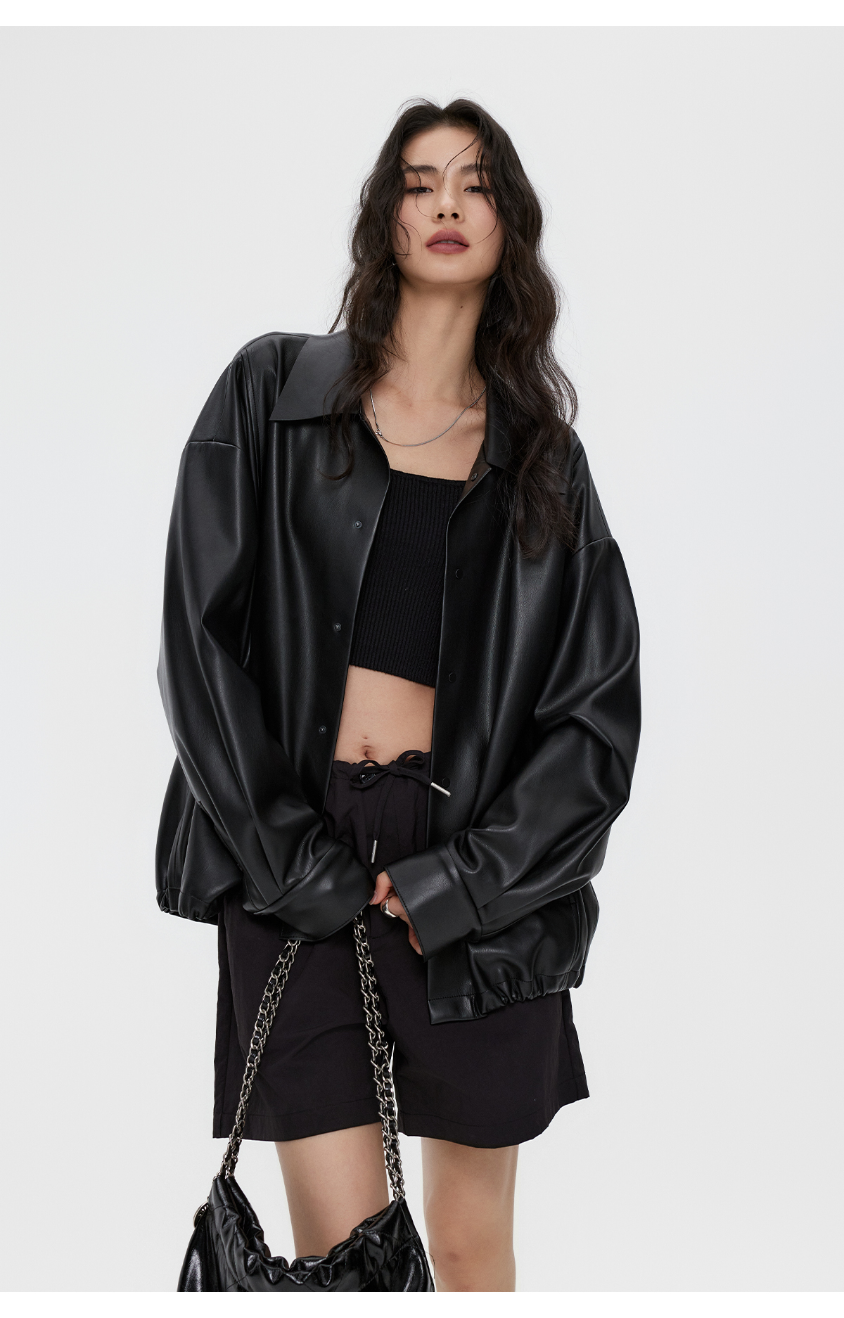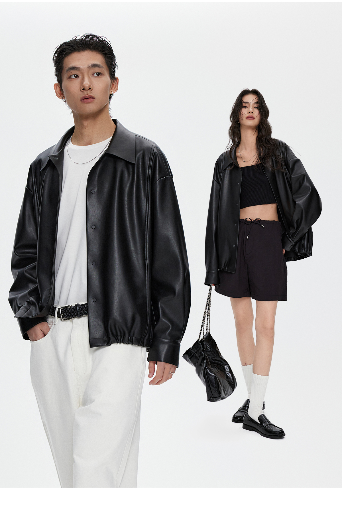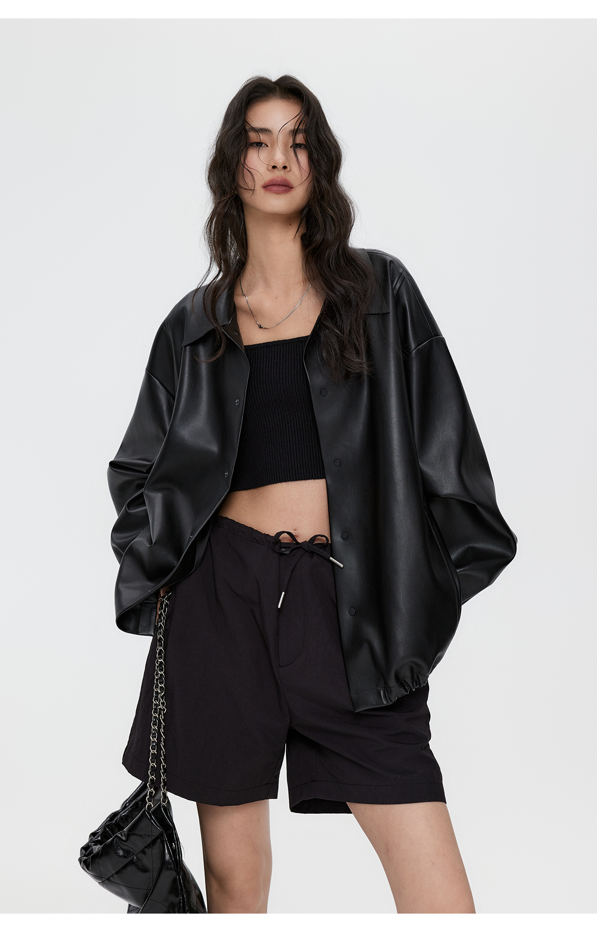 棉仓3461027002-蛋白PU皮翻领JI简设计衬衫式夹克外套