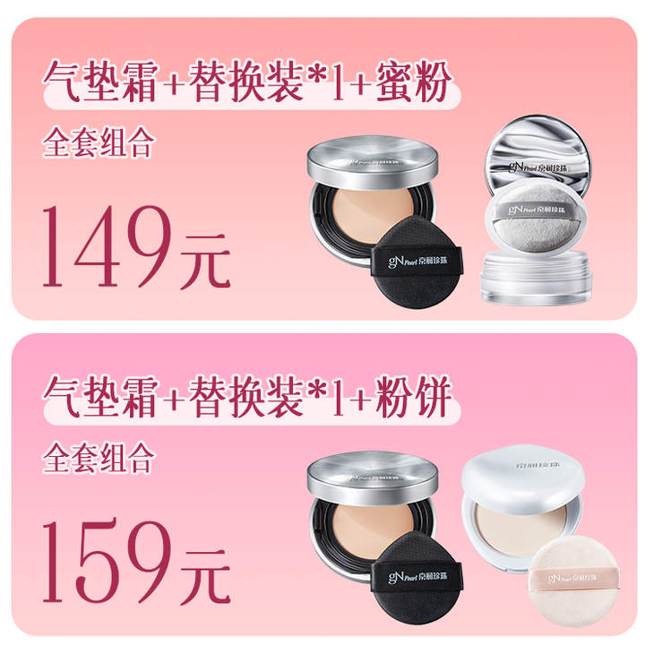 京润珍珠·珍珠养肤气垫霜/蜜粉/粉饼 , 百元入手全套组合!打造透光奶油肌,边化妆边养肤!