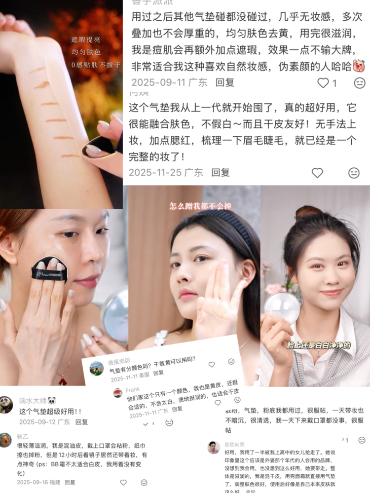 使用方法:基础护肤后,用粉扑轻轻按压气垫取适量内容物,沿着肌肤纹理均匀涂抹于面部,轻拍肌肤帮助贴合。如果想增加遮盖力,可重复涂抹一次。