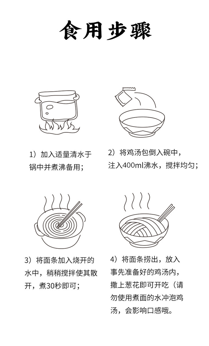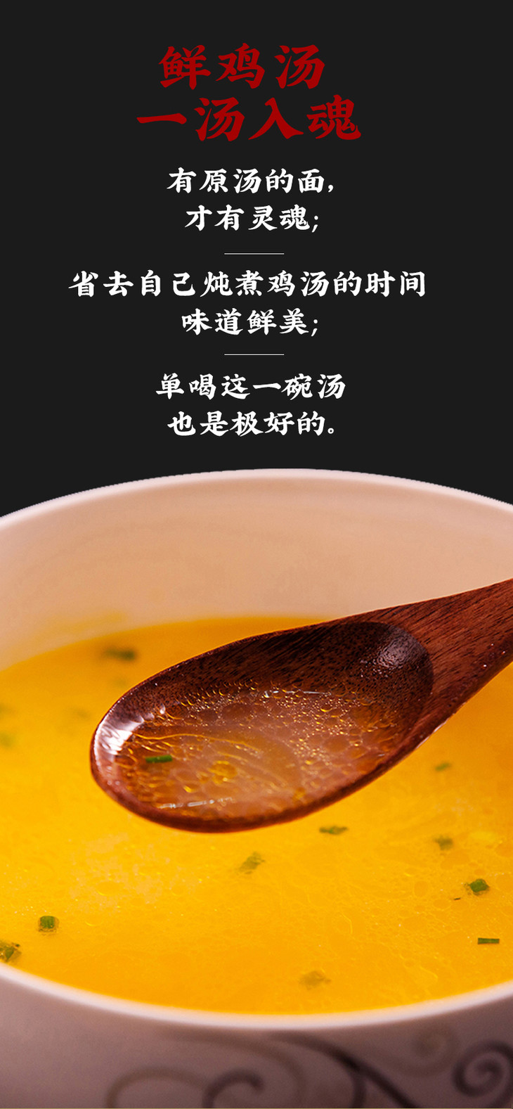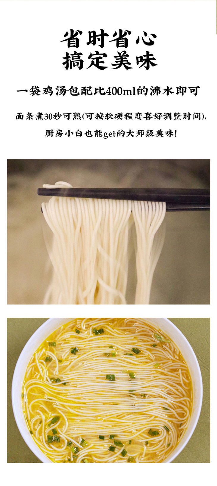 想吃的时候只要把鸡汤包和葱花放到碗里,用约400ml沸水冲上,同时起锅烧水,待水沸后下面条,轻轻搅拌拨散,煮30秒就可以直接捞入鸡汤碗里,色香味俱全的鸡汤面便大功告成了!即便是厨房小白,也能轻松搞定!如果时间充足,还可以再加些青菜、肉丸或鸡蛋,或者剩菜和各种浇头,营养和口感就更加全面啦!细细的面,鲜鲜的汤,一口下去,热腾腾!调味蛮清淡的,重口人就再挖一勺小甜辛,绝对满分!