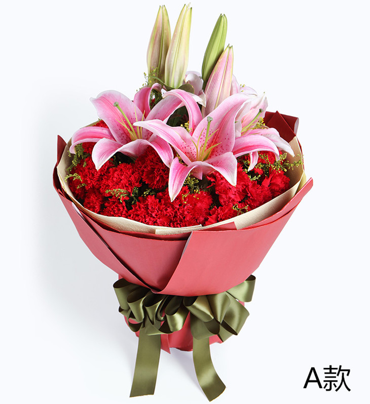 29枝红康乃馨,多头粉百合2枝,黄莺10枝