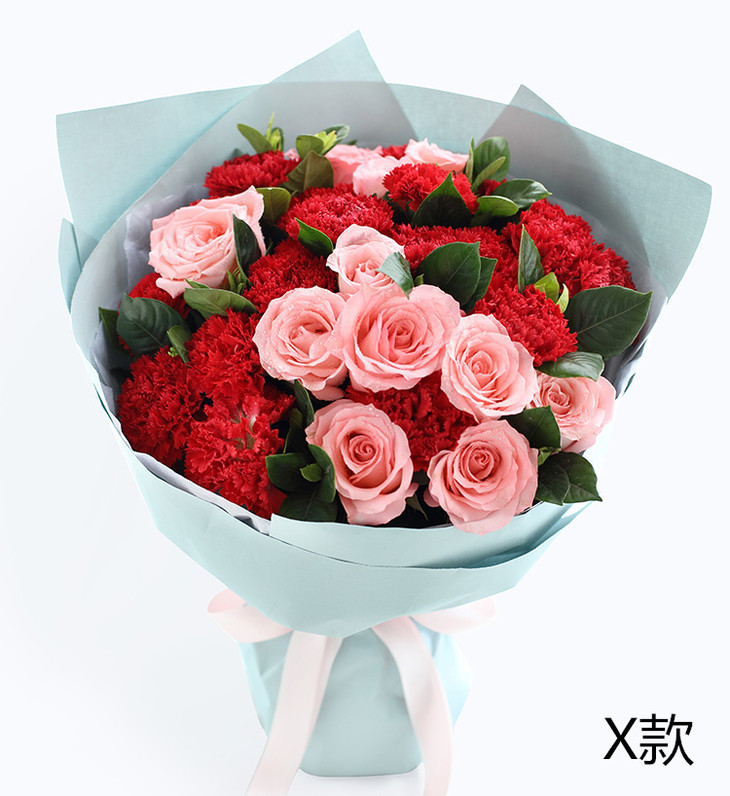 红色康乃馨19枝,戴安娜粉玫瑰11枝