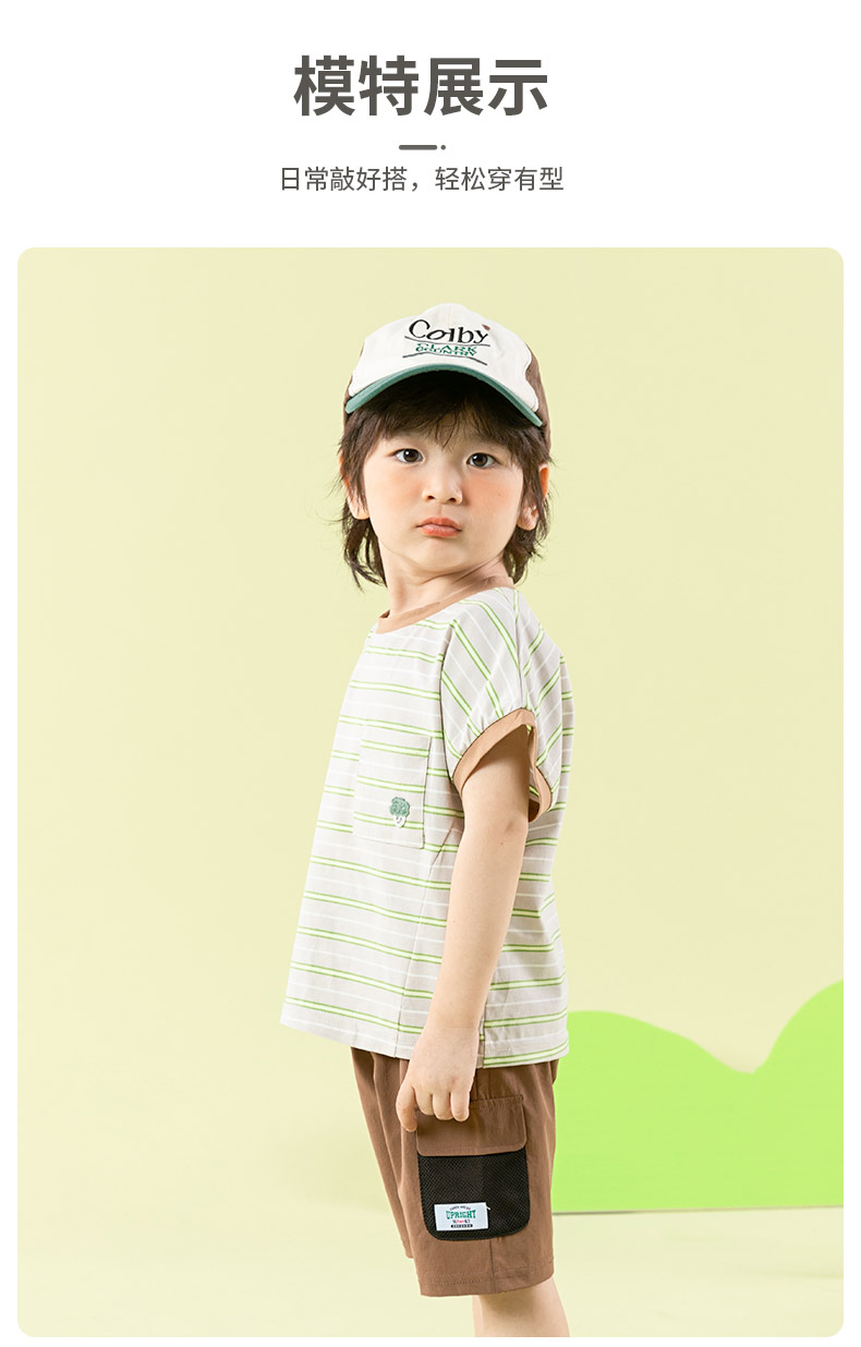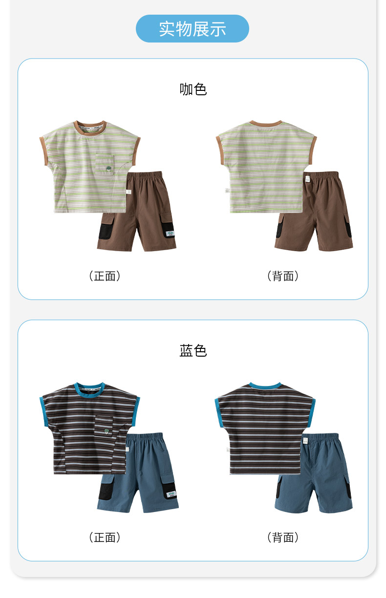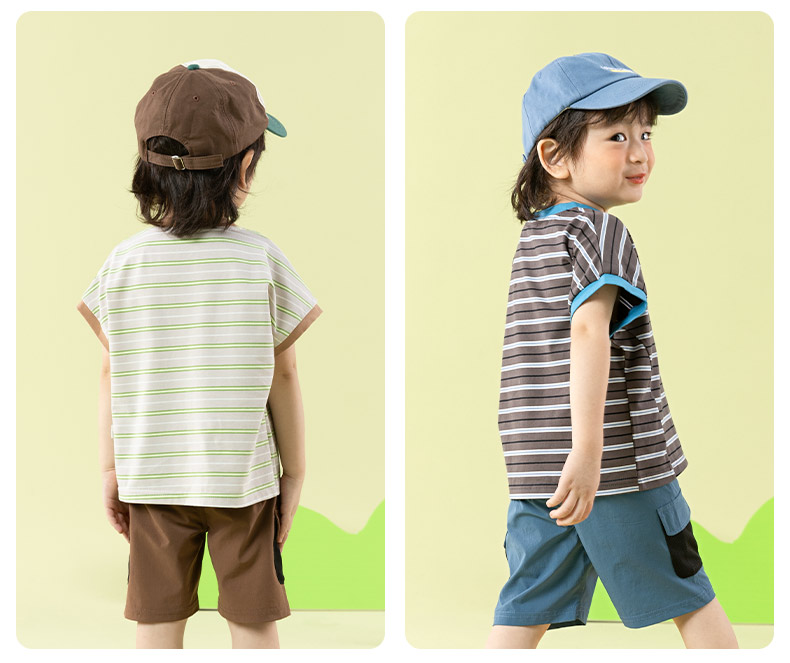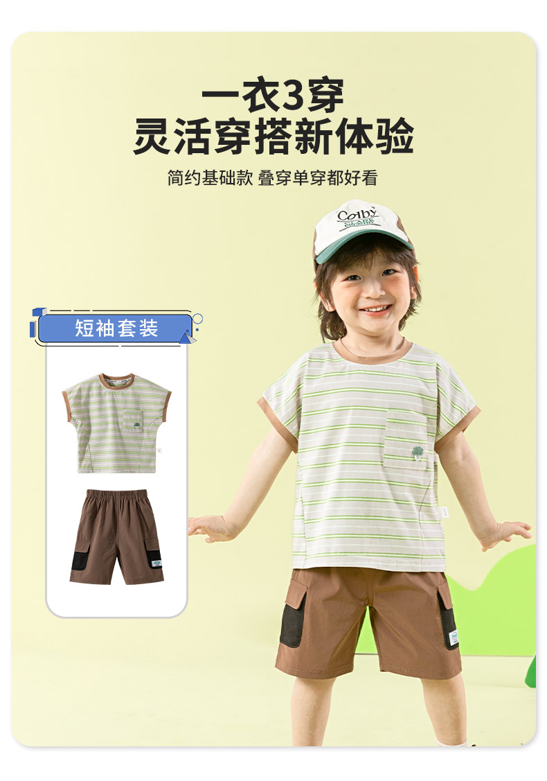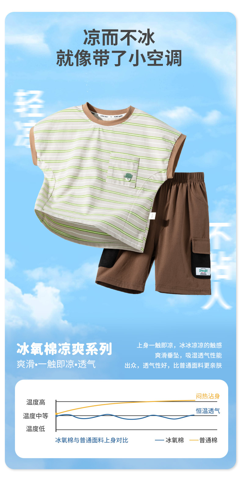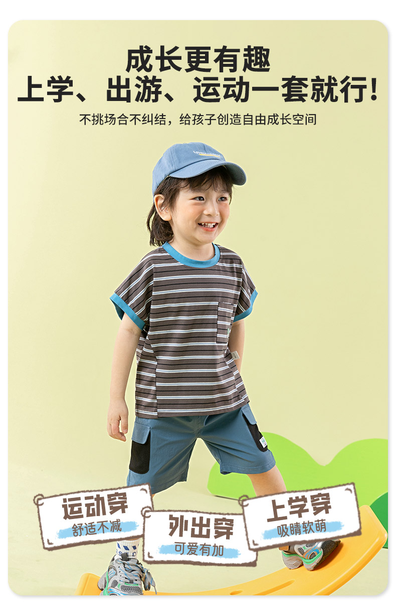 贝贝怡【撞色条纹冰感套装】2025夏季男童凉感短袖T恤吸湿透气短裤套装ZB2ET010