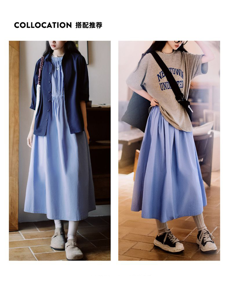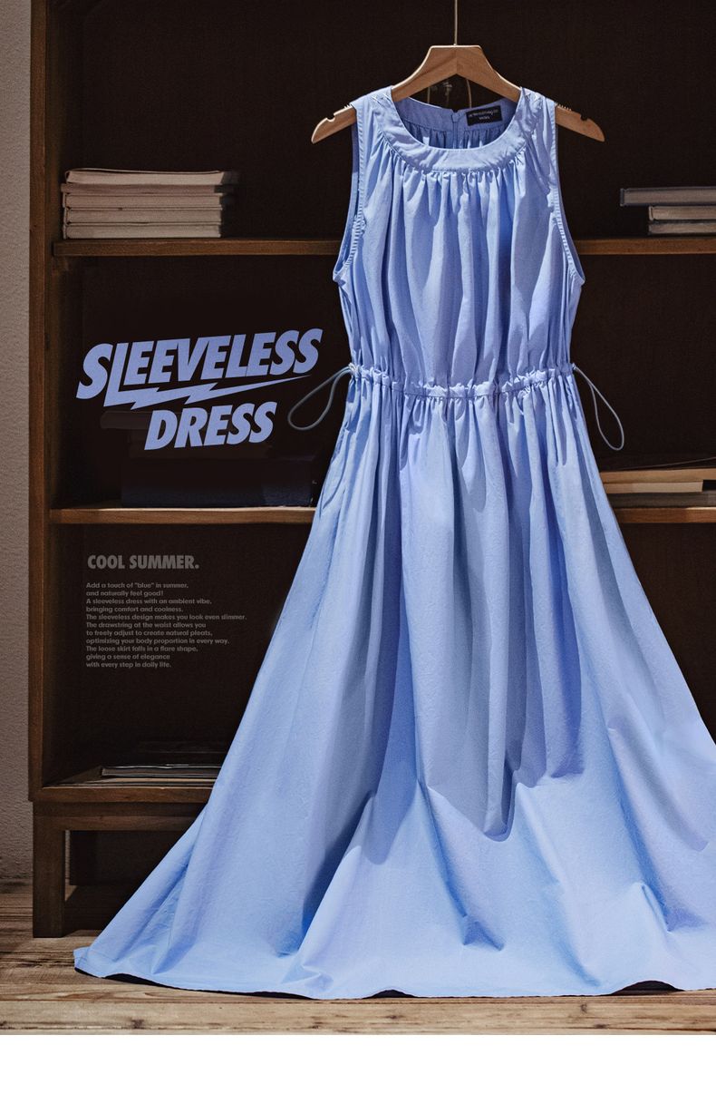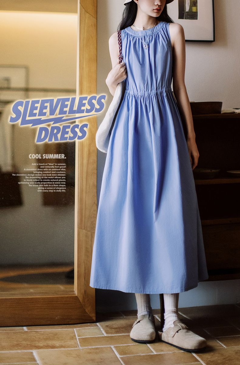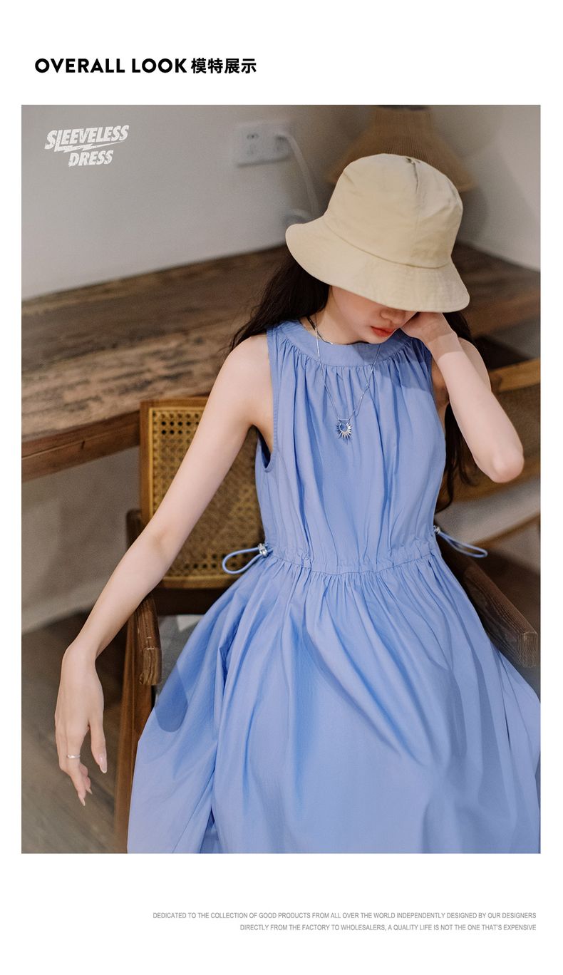 马登浅春系baby蓝无袖连衣裙休闲沙滩度假长裙春夏法式抽褶裙子女