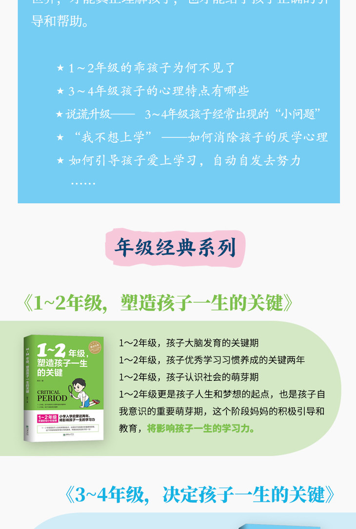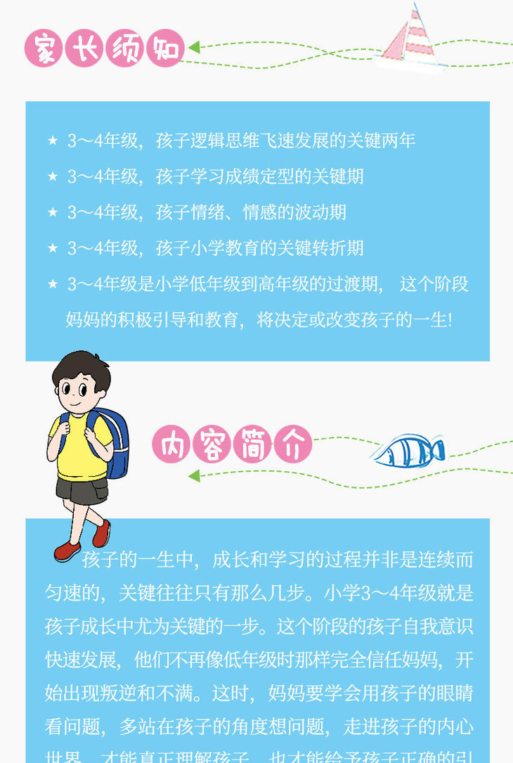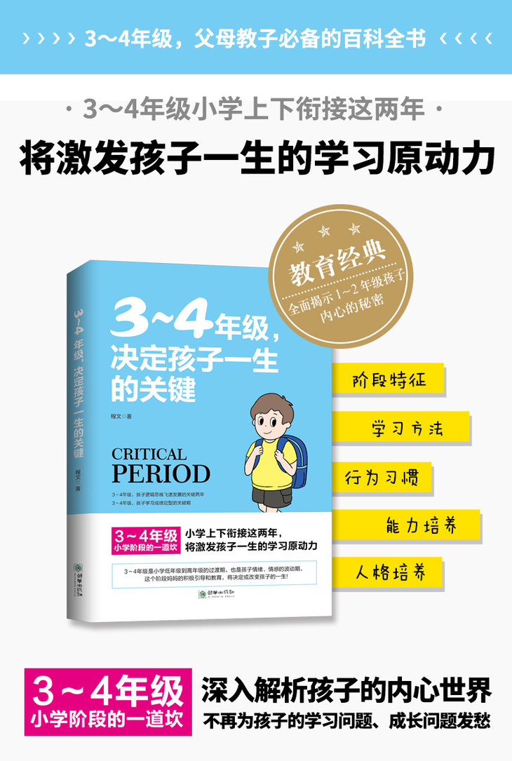小学3~4年级就是孩子成长中尤为关键的一步。这个阶段的孩子自我意识快速发展,他们不再像低年级时那样完全信任妈妈,开始出现叛逆和不满。这时,妈妈要学会用孩子的眼睛看问题,多站在孩子的角度想问题,走进孩子的内心世界,才能真正理解孩子,也才能给予孩子正确的引导和帮助。