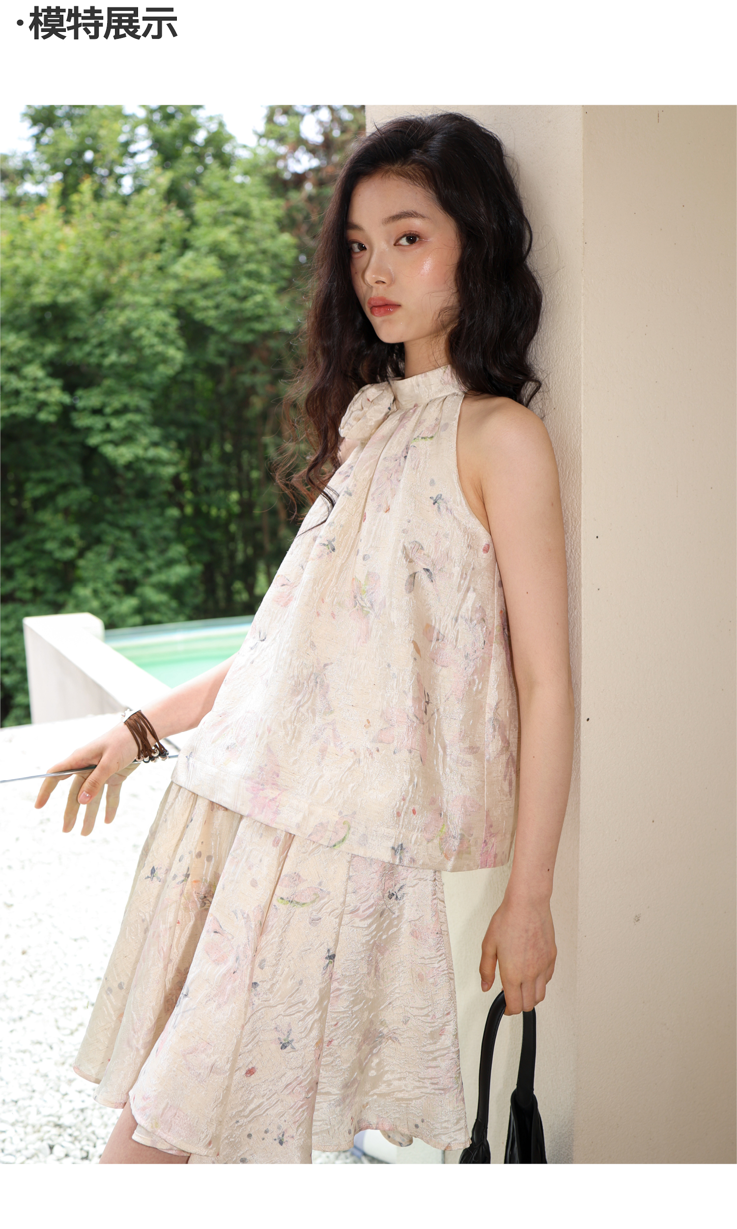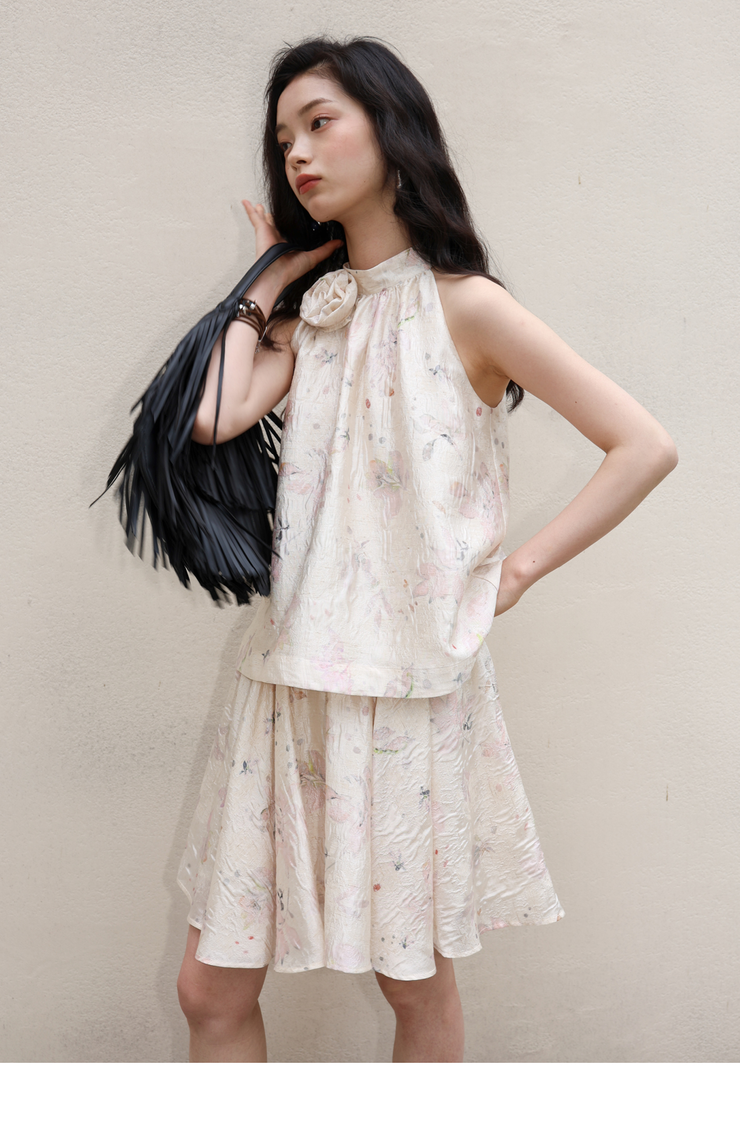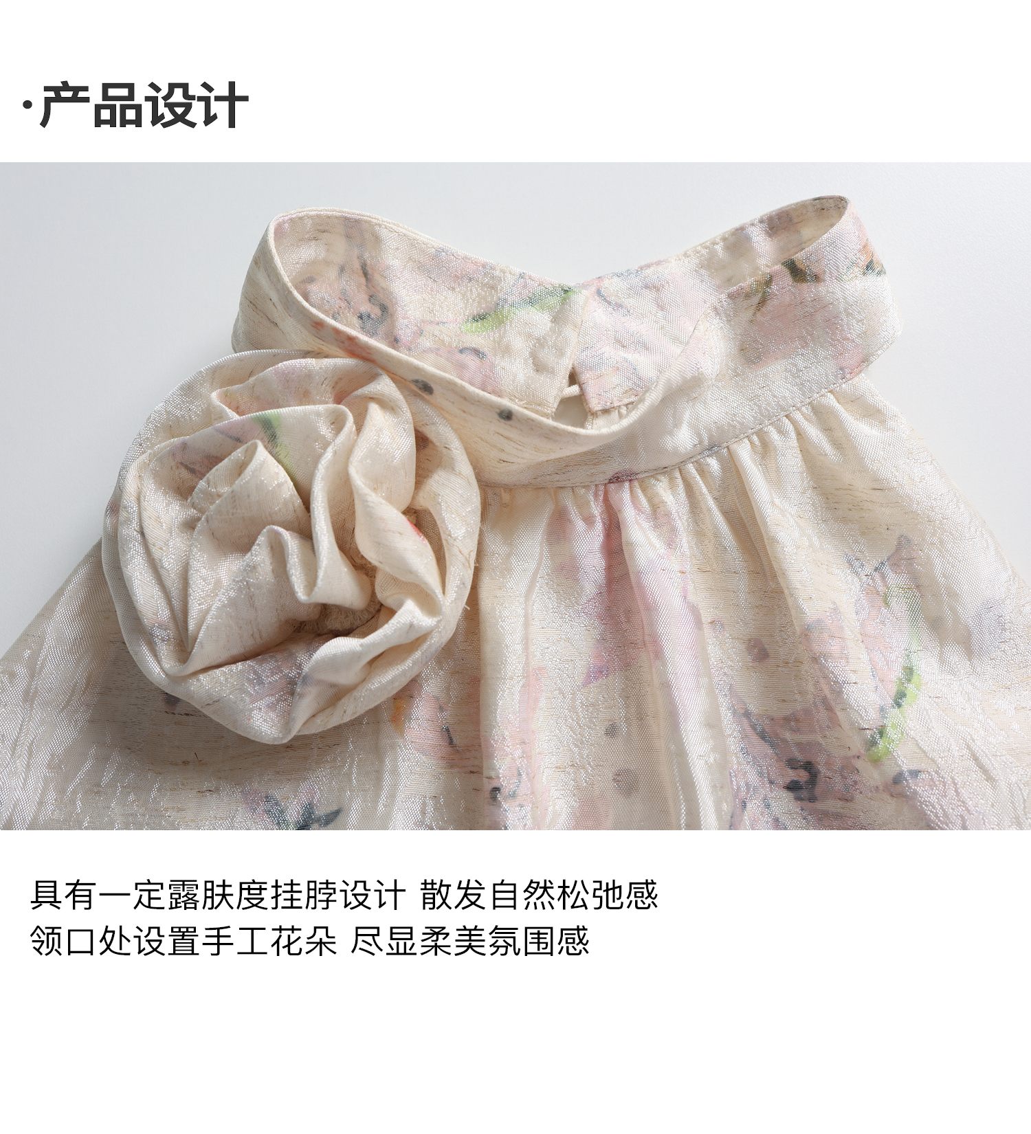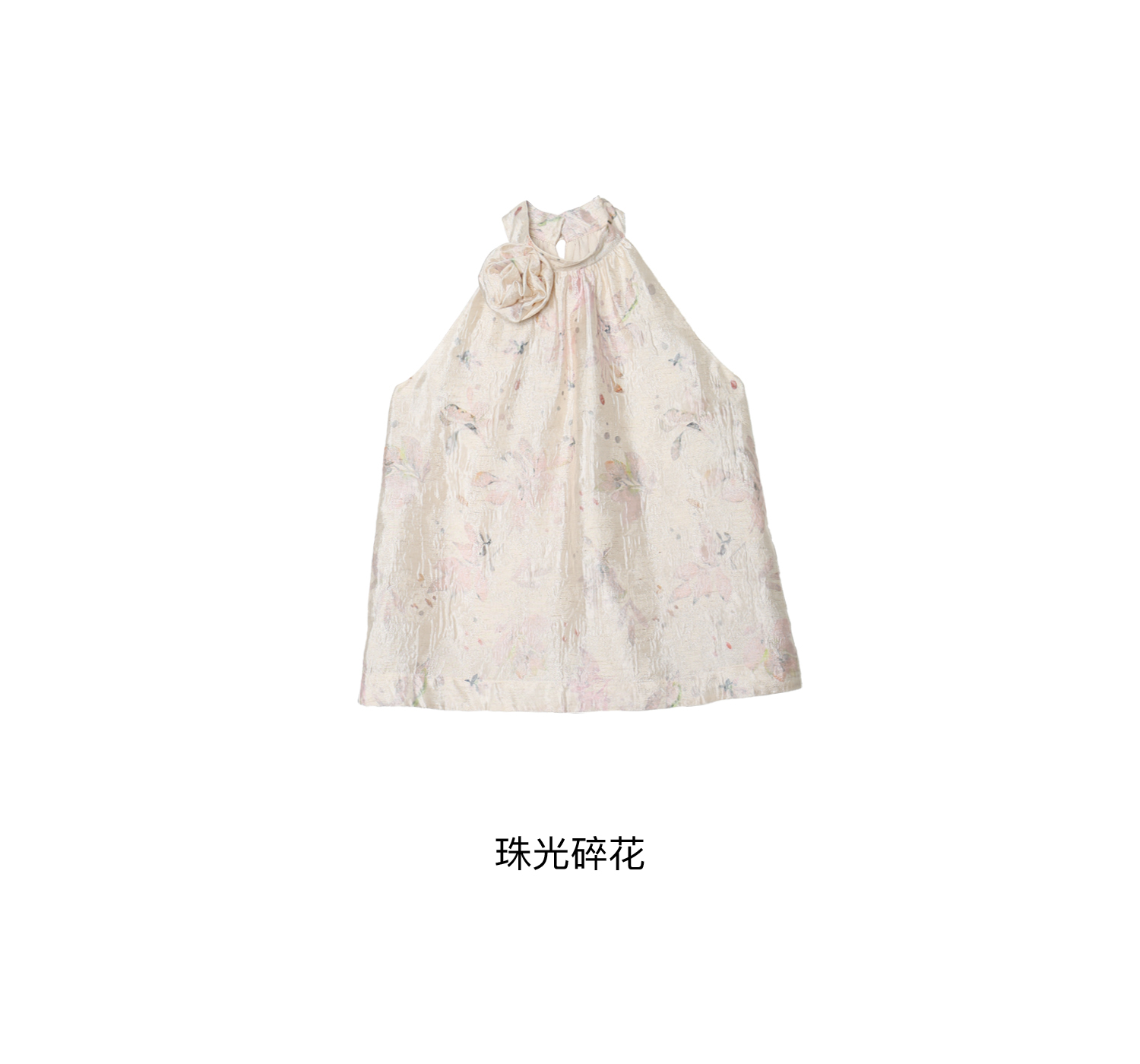 素舶 亚麻混纺挺括透气不变形珠光皱感提花立体手工花朵挂脖上衣