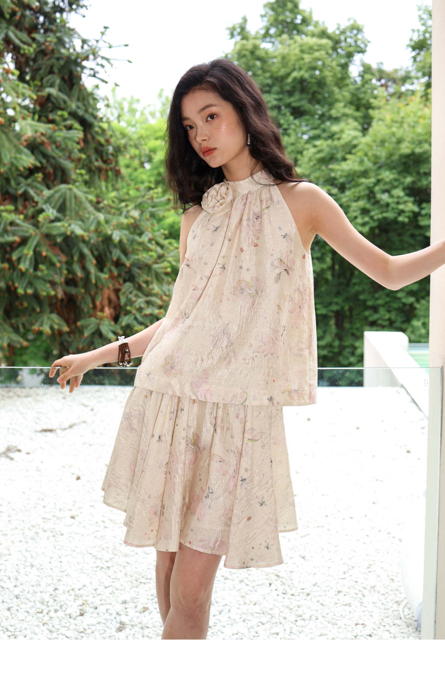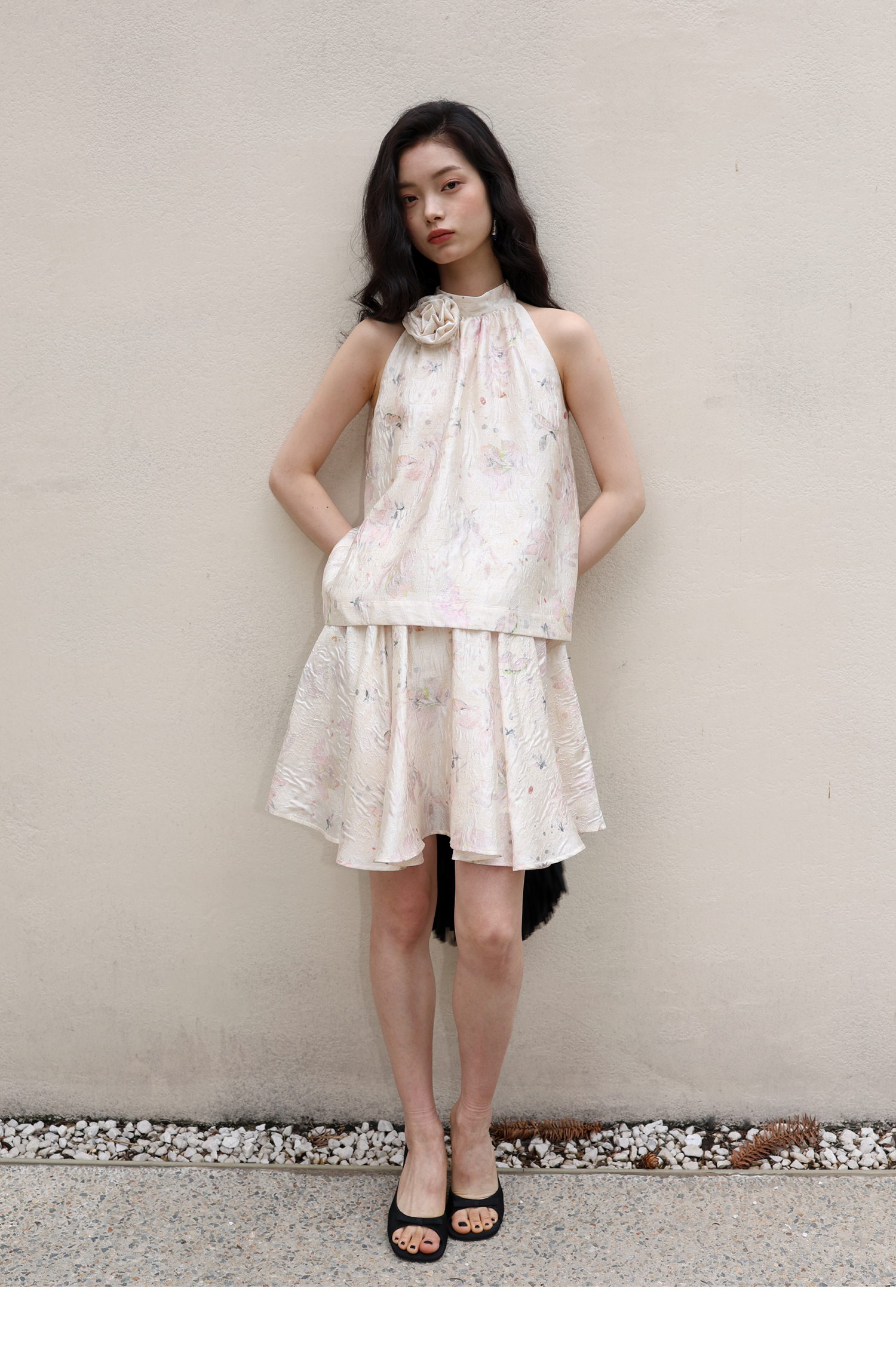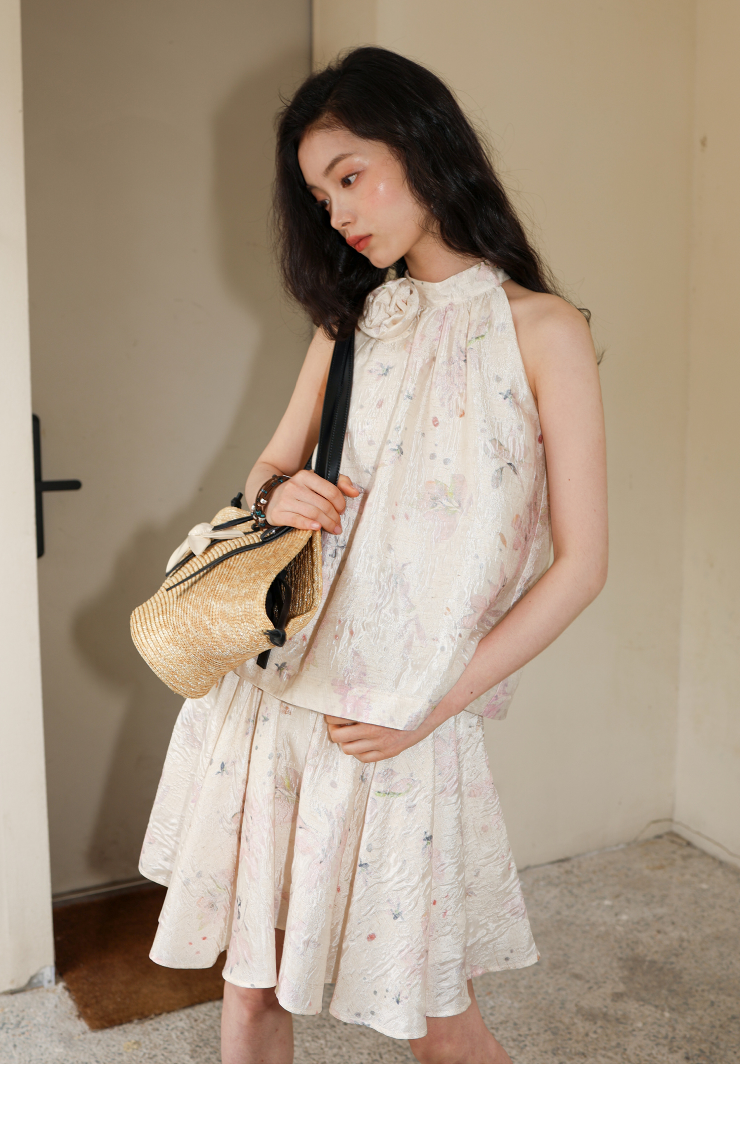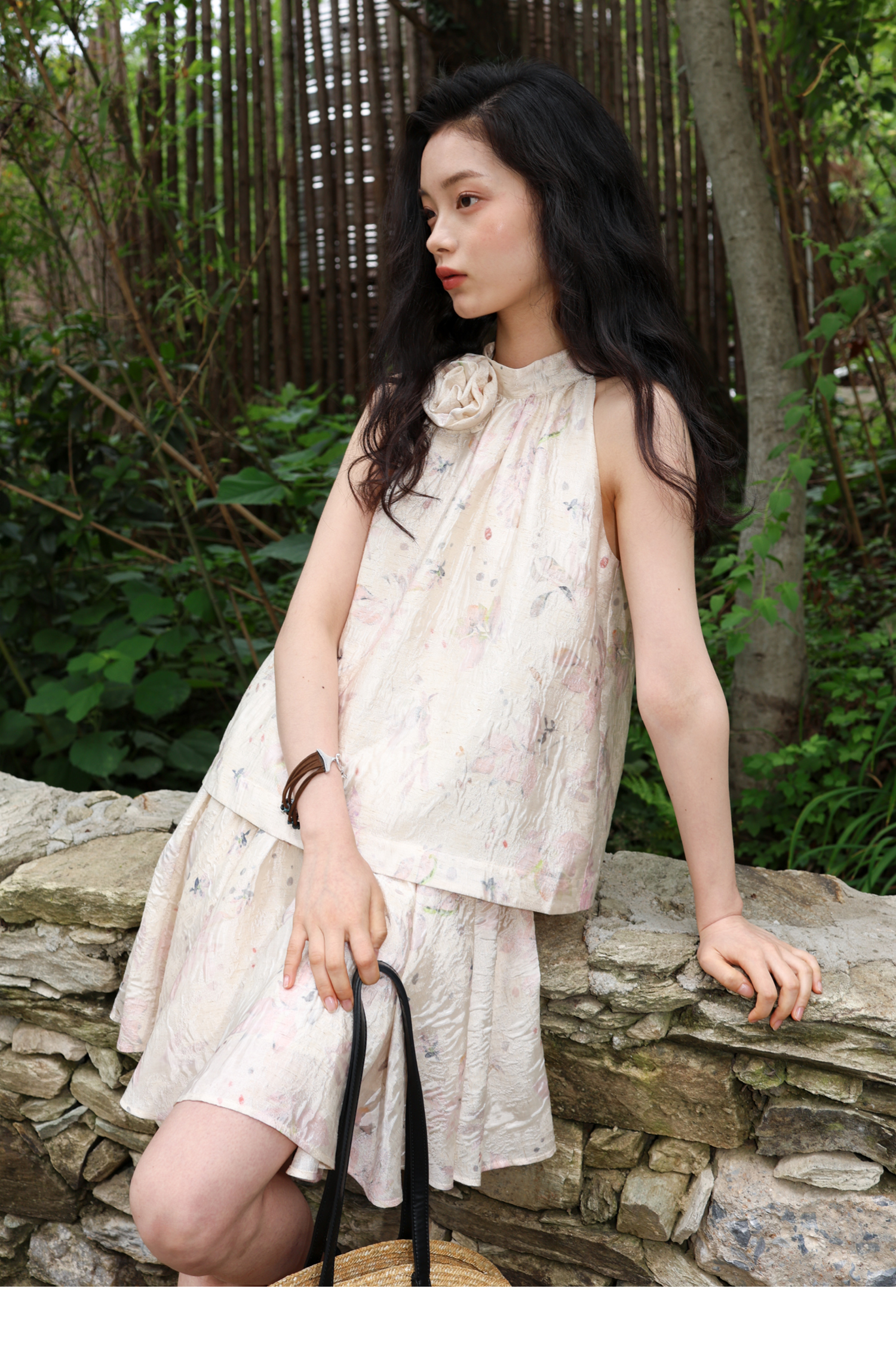 素舶 亚麻混纺挺括透气不变形珠光皱感提花立体手工花朵挂脖上衣