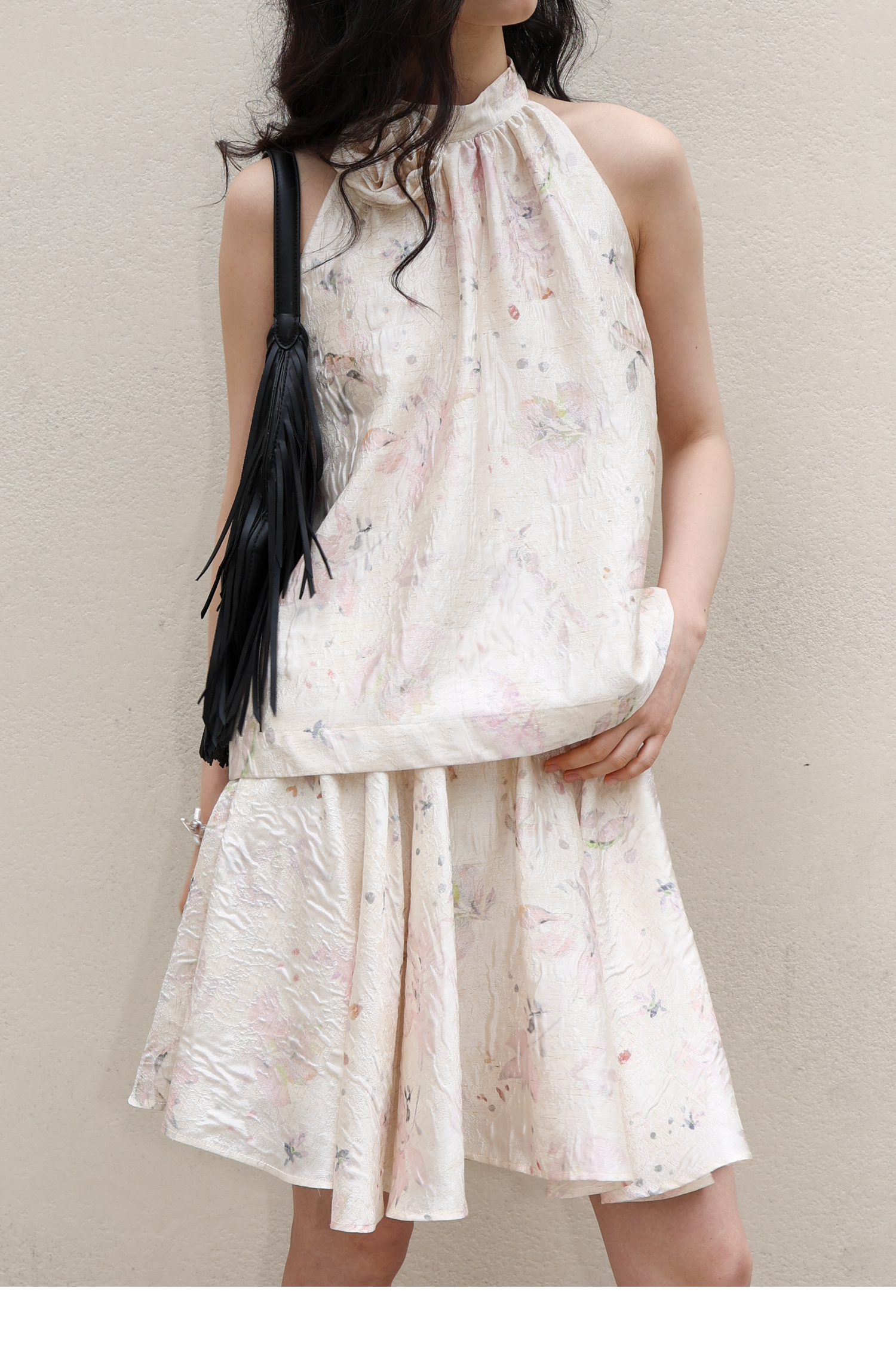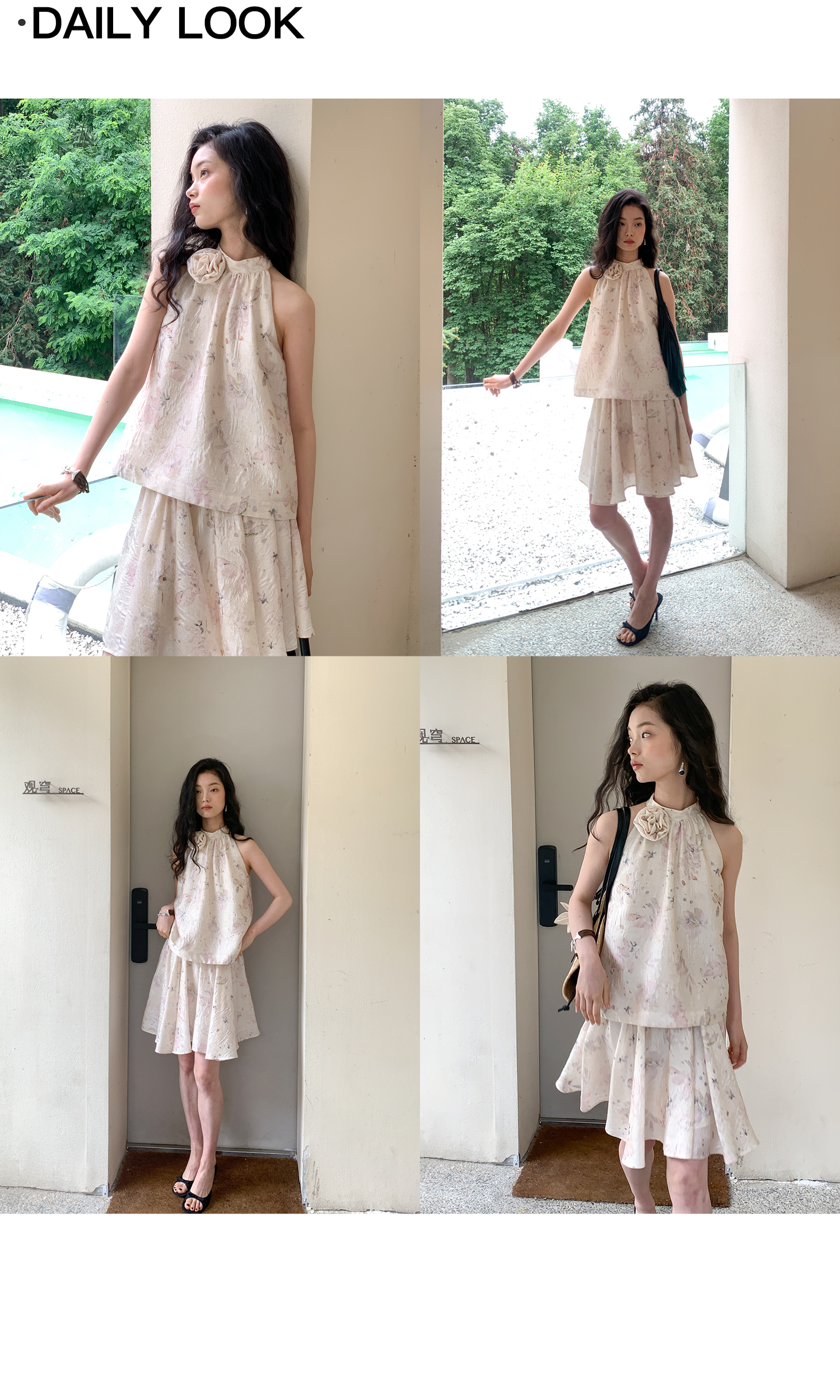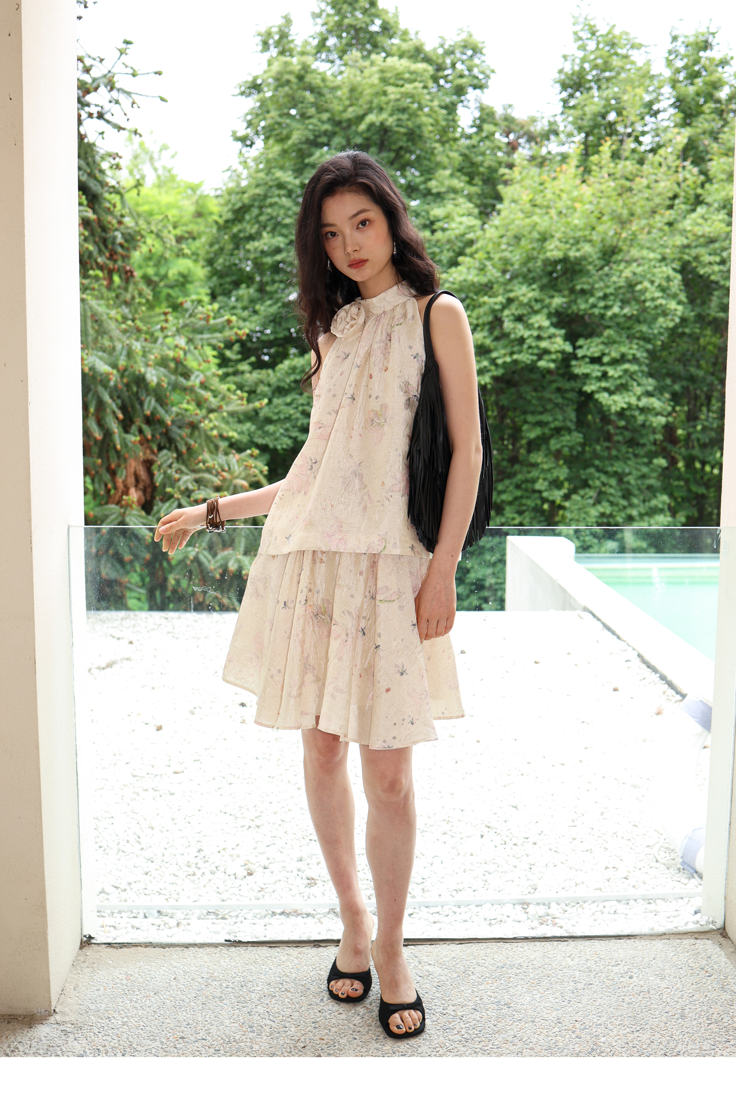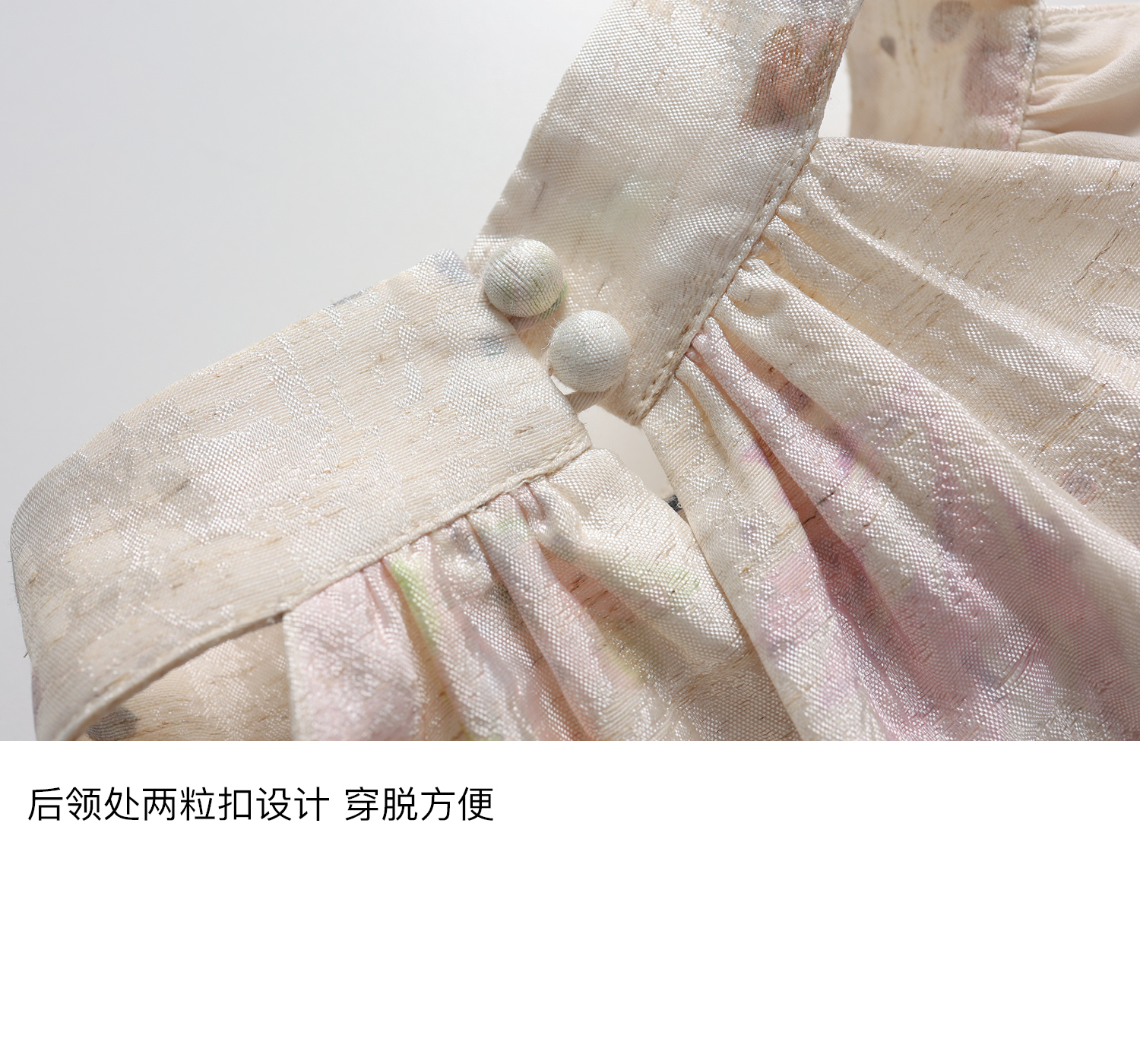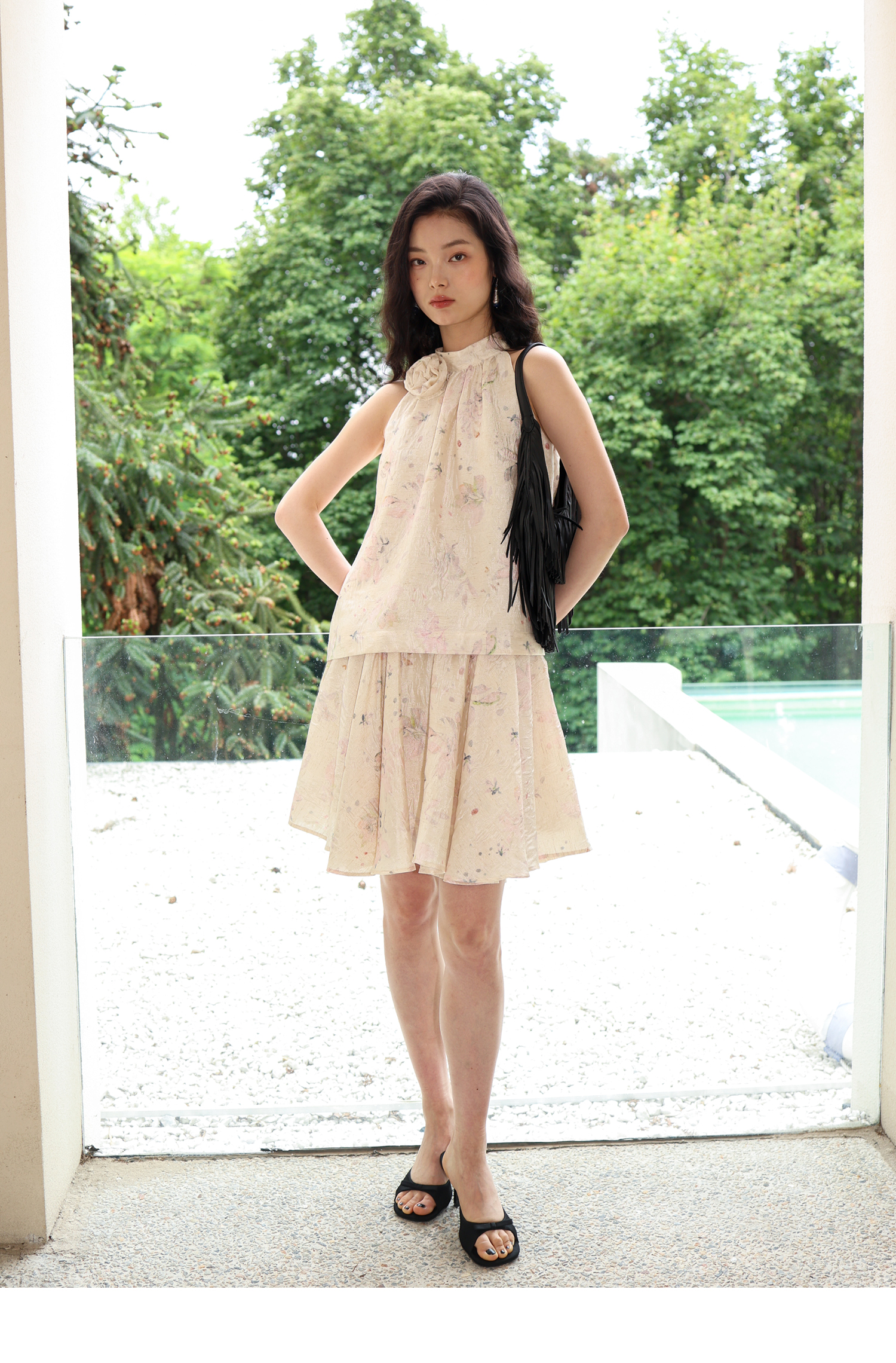 素舶 亚麻混纺挺括透气不变形珠光皱感提花立体手工花朵挂脖上衣
