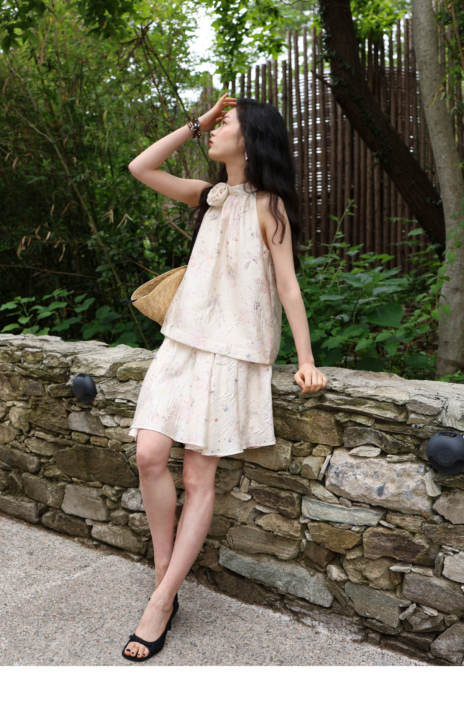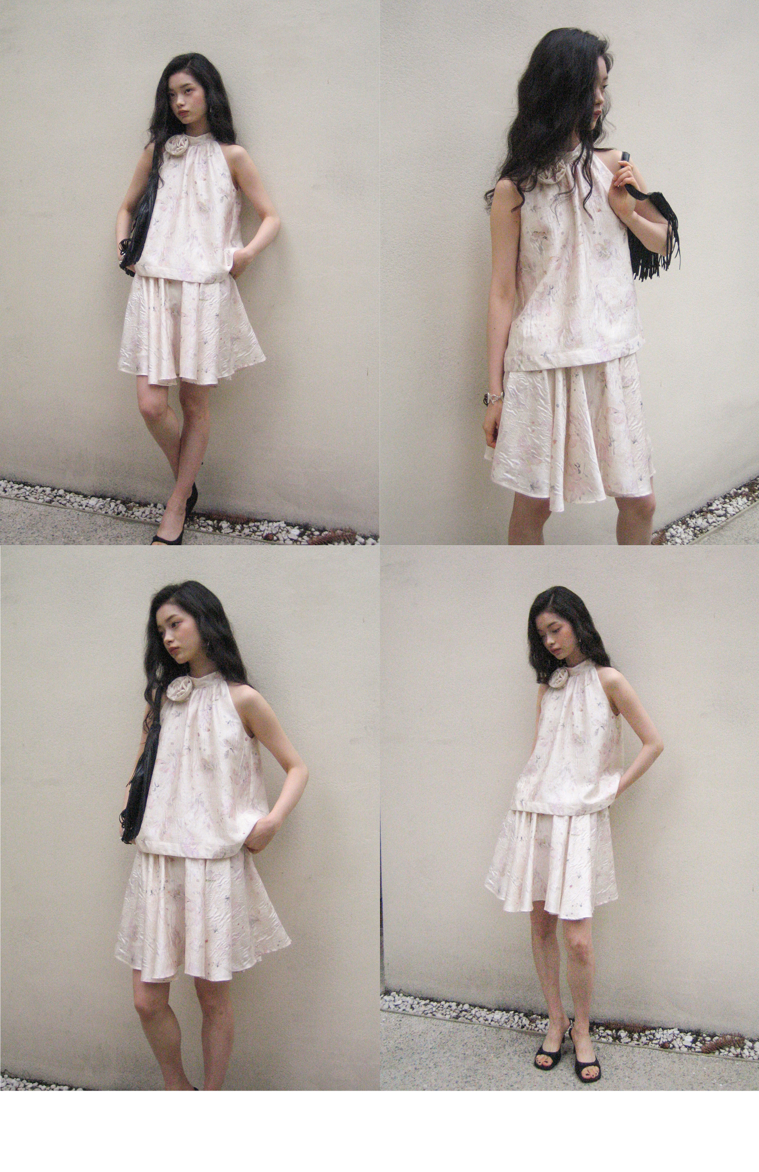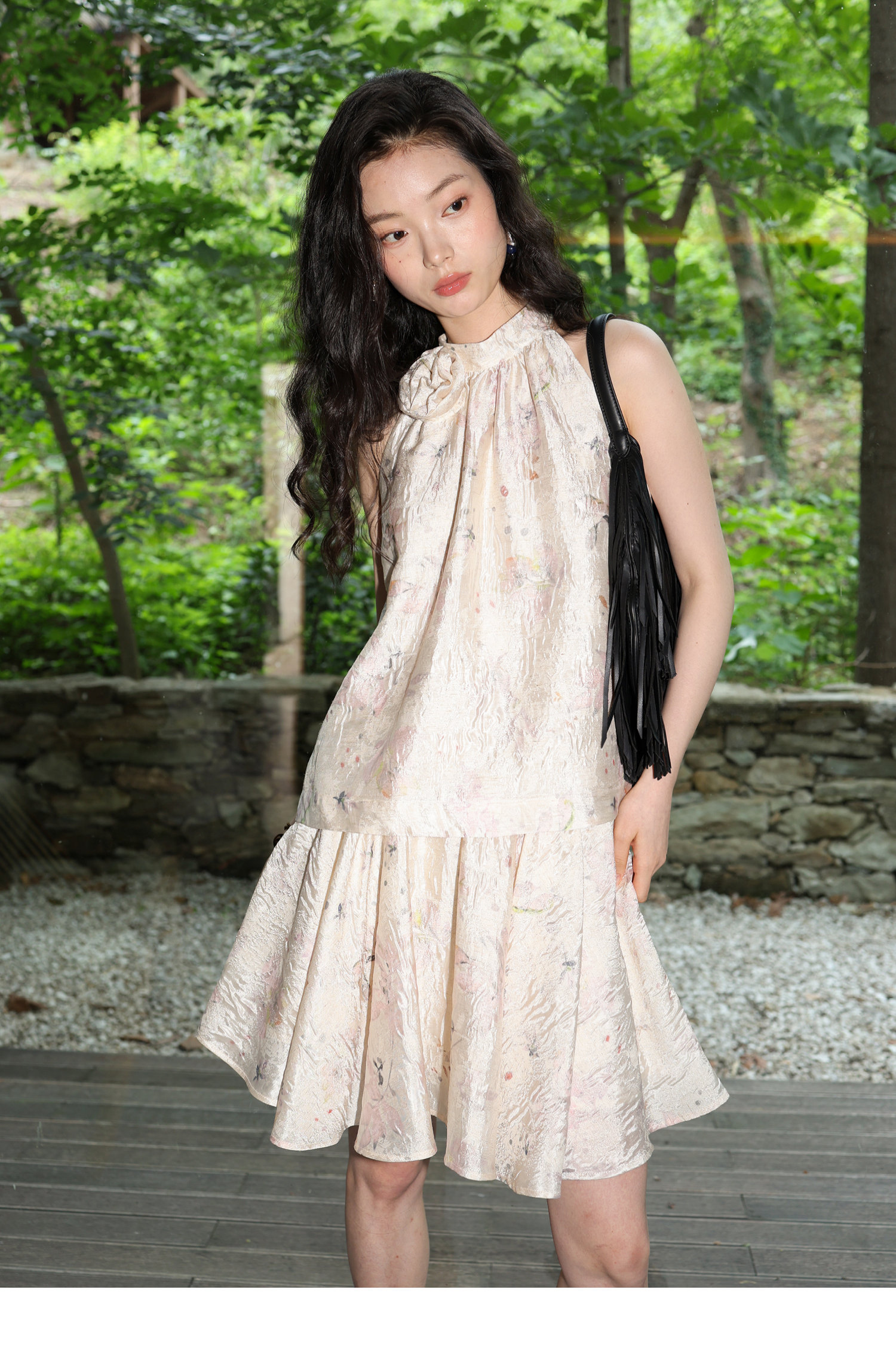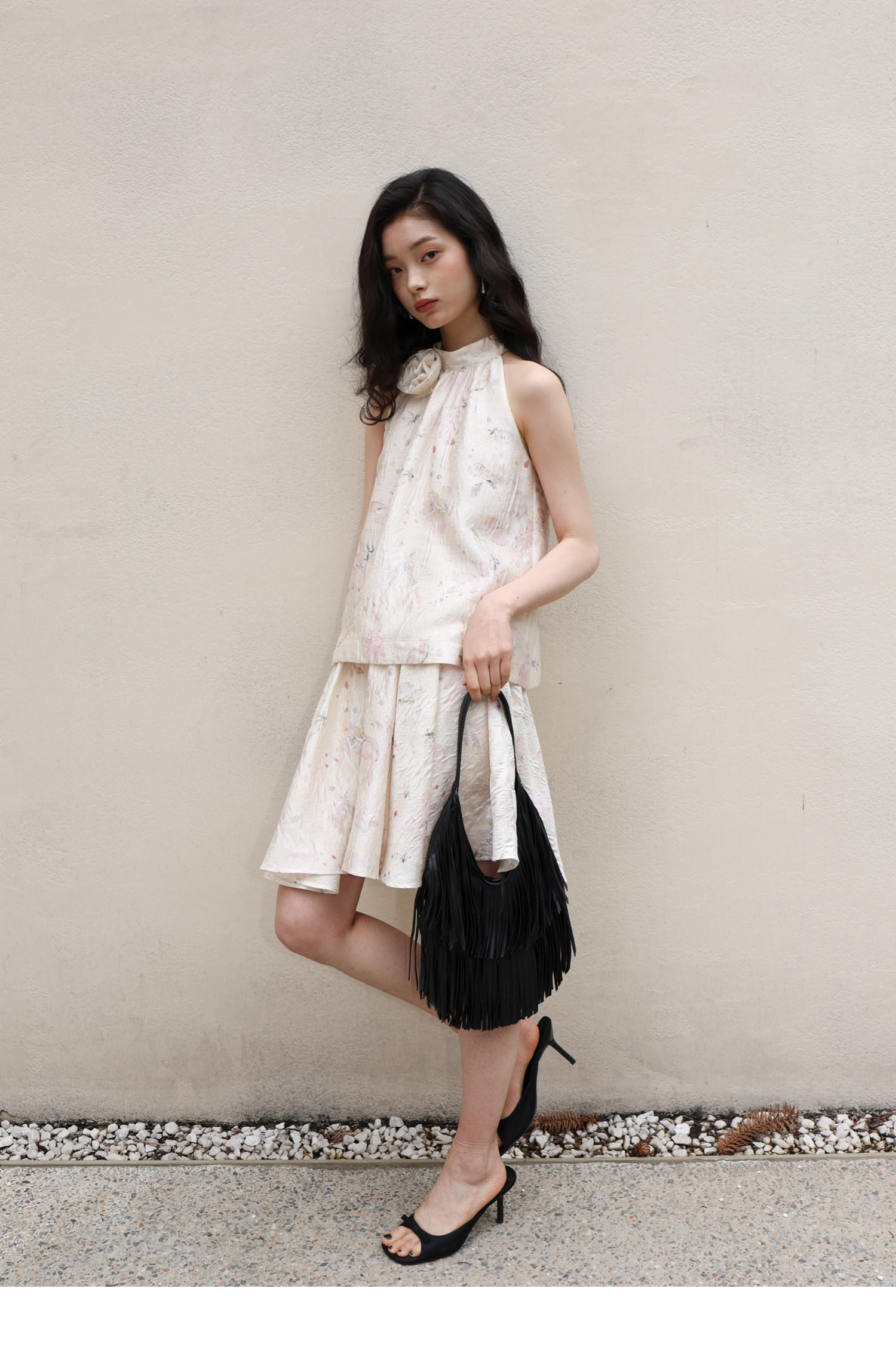 素舶 亚麻混纺挺括透气不变形珠光皱感提花立体手工花朵挂脖上衣