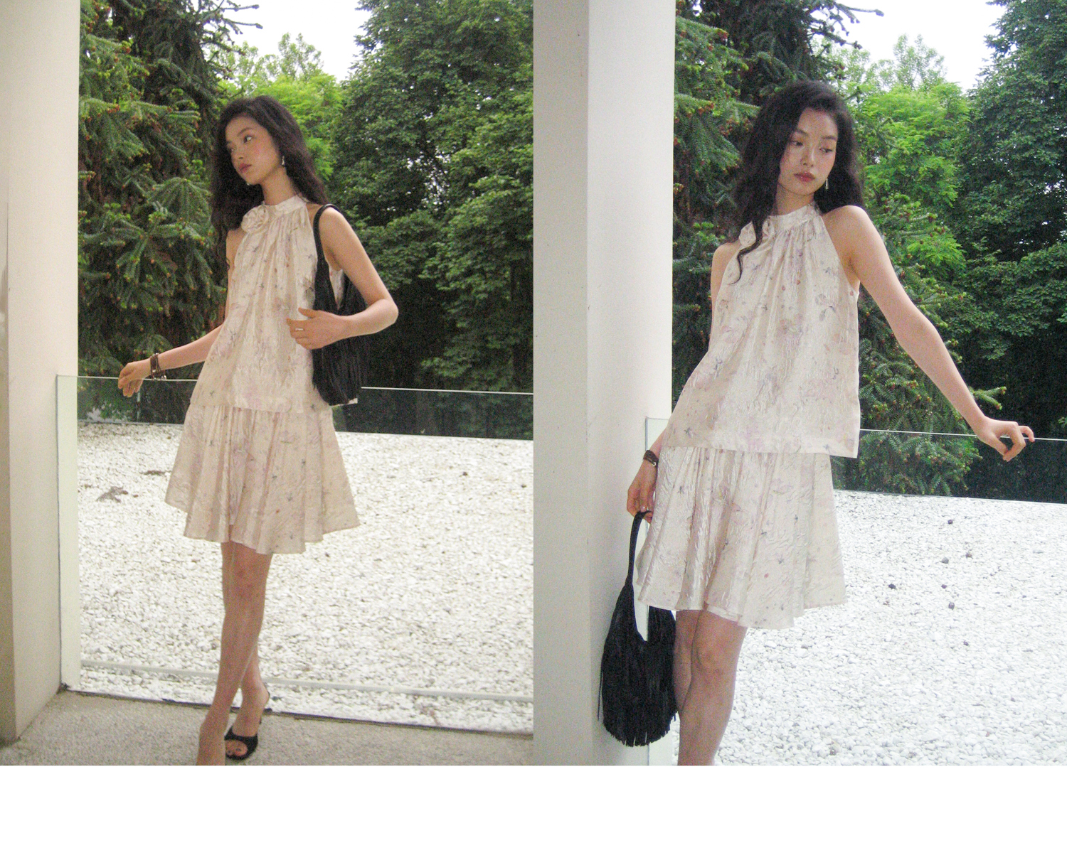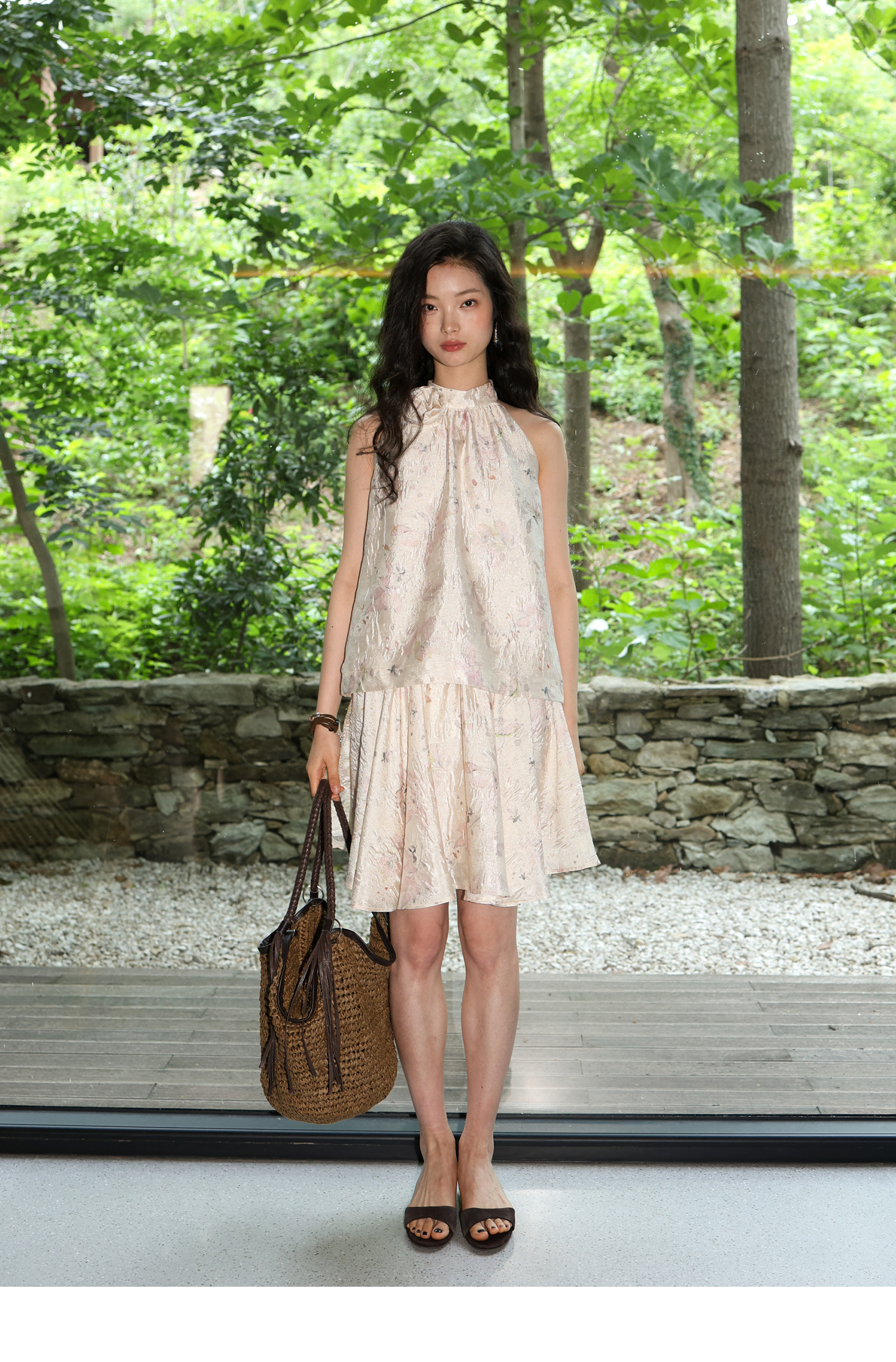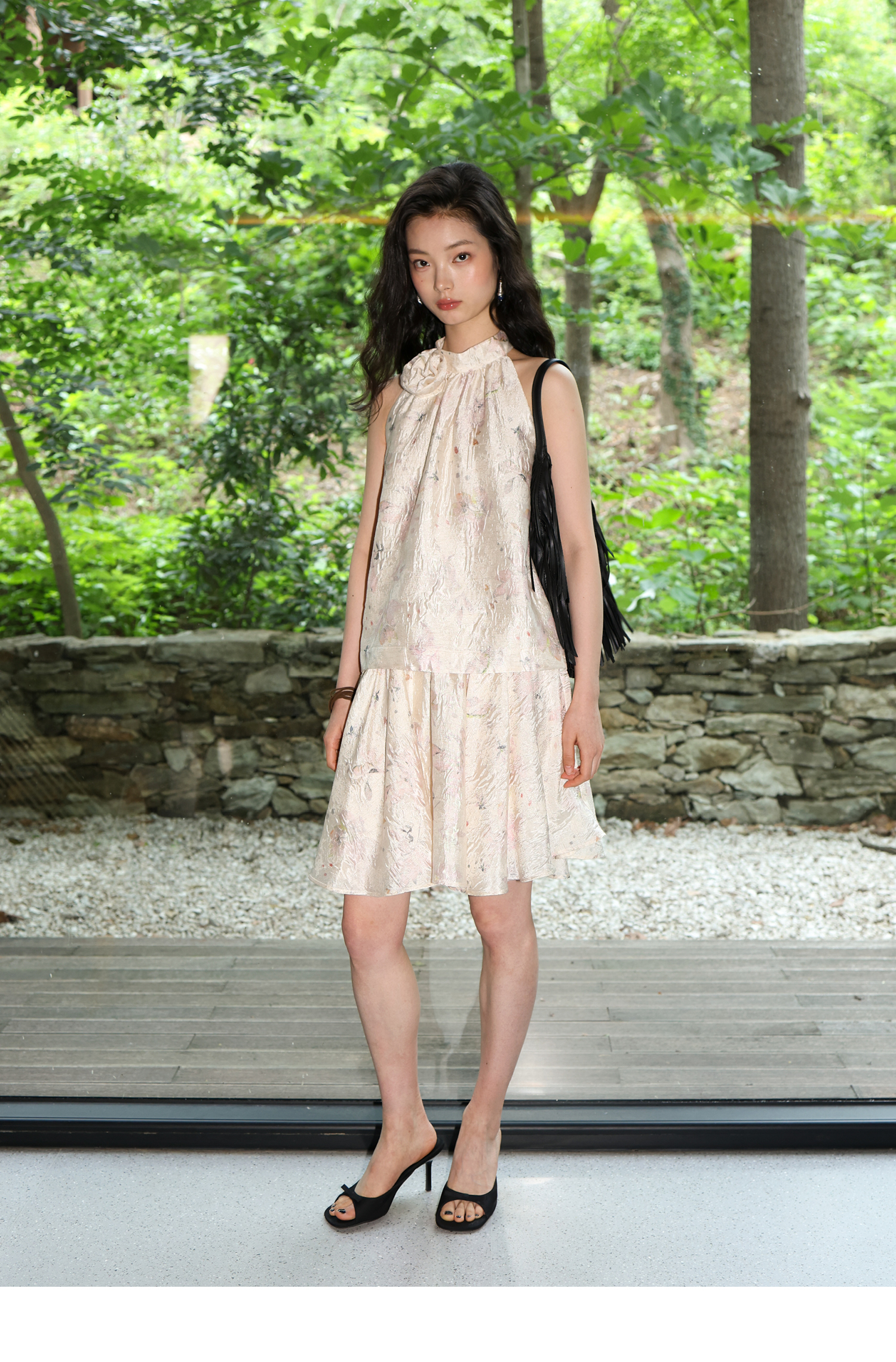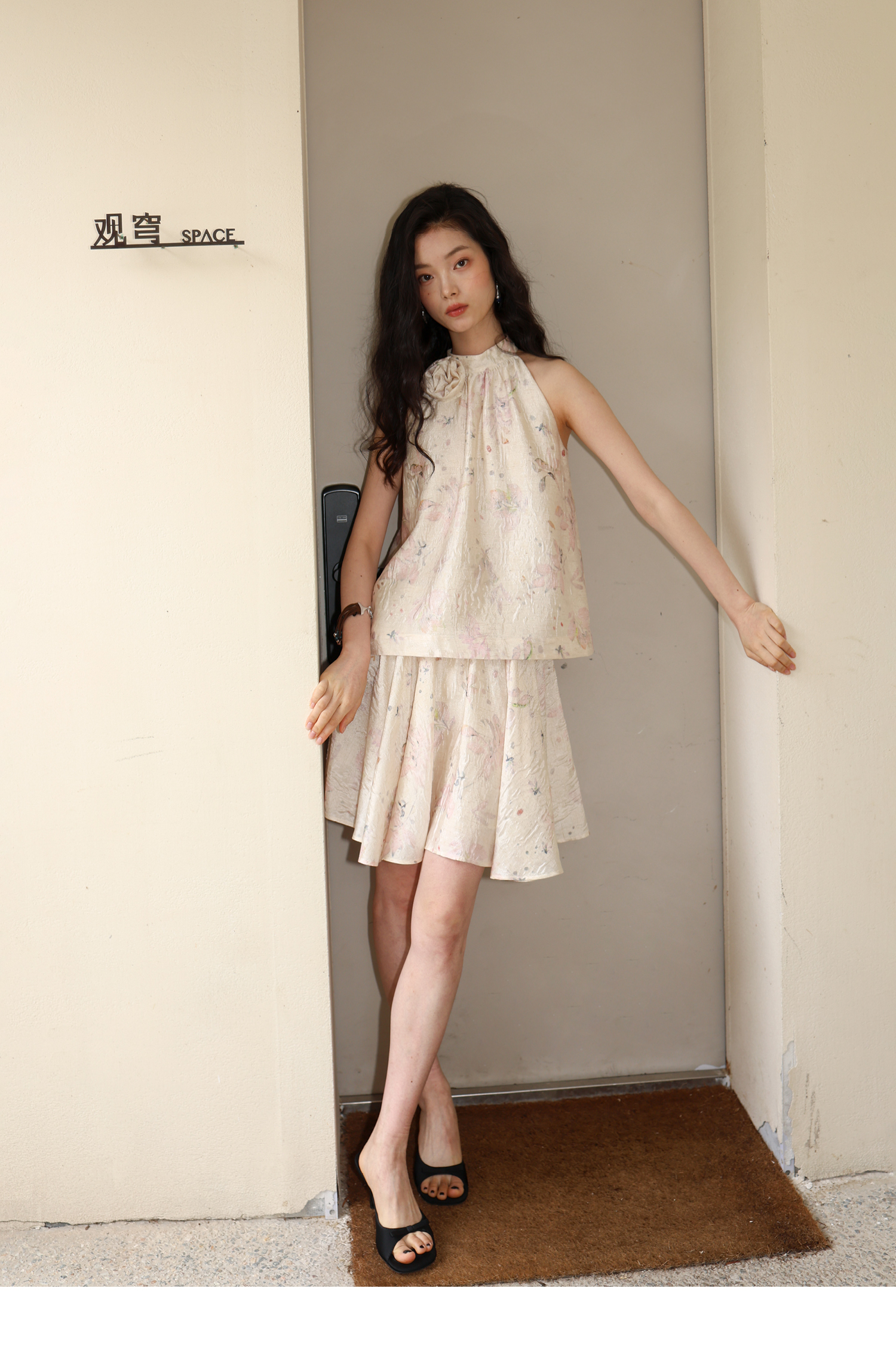 素舶 亚麻混纺挺括透气不变形珠光皱感提花立体手工花朵挂脖上衣