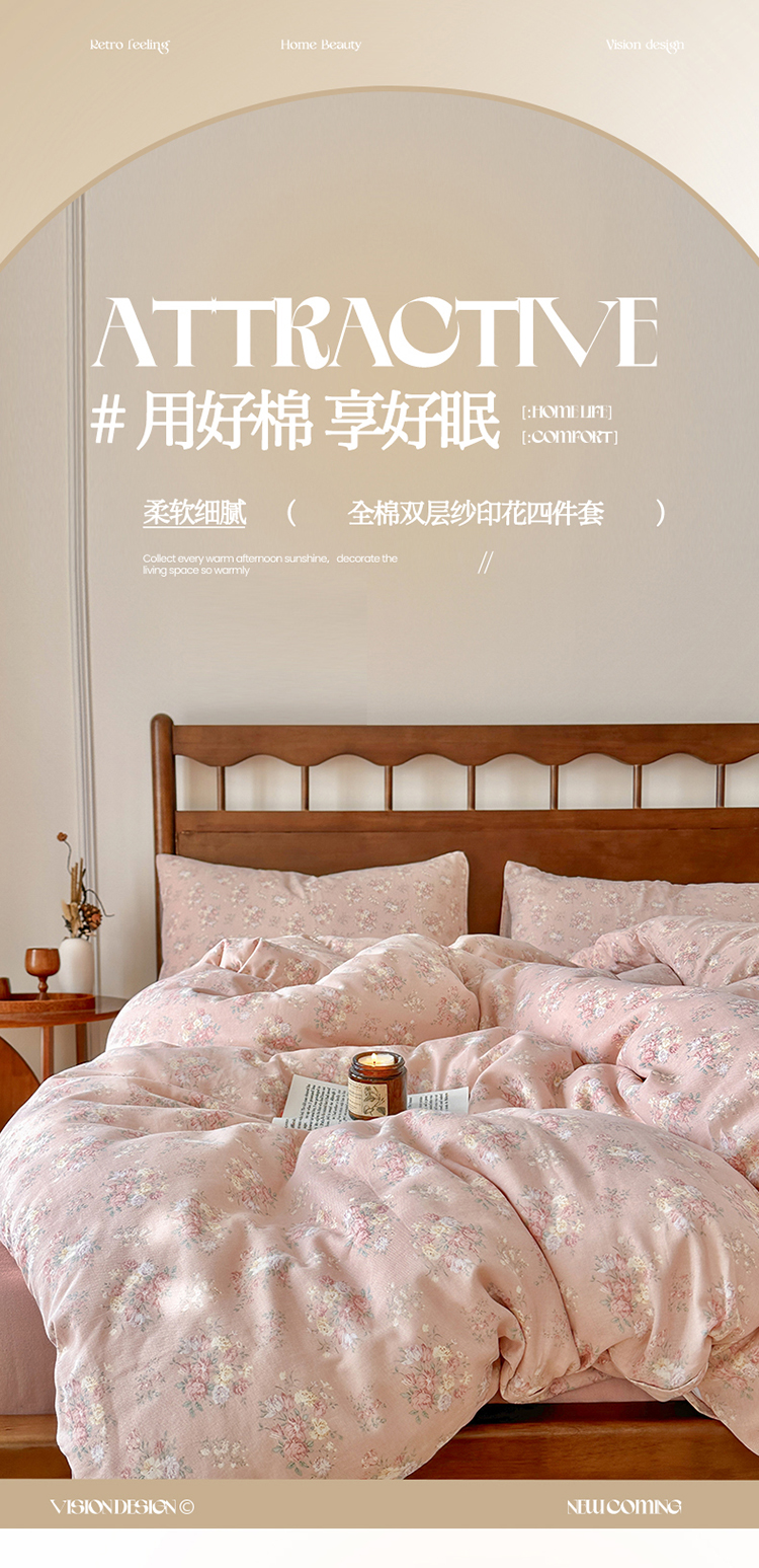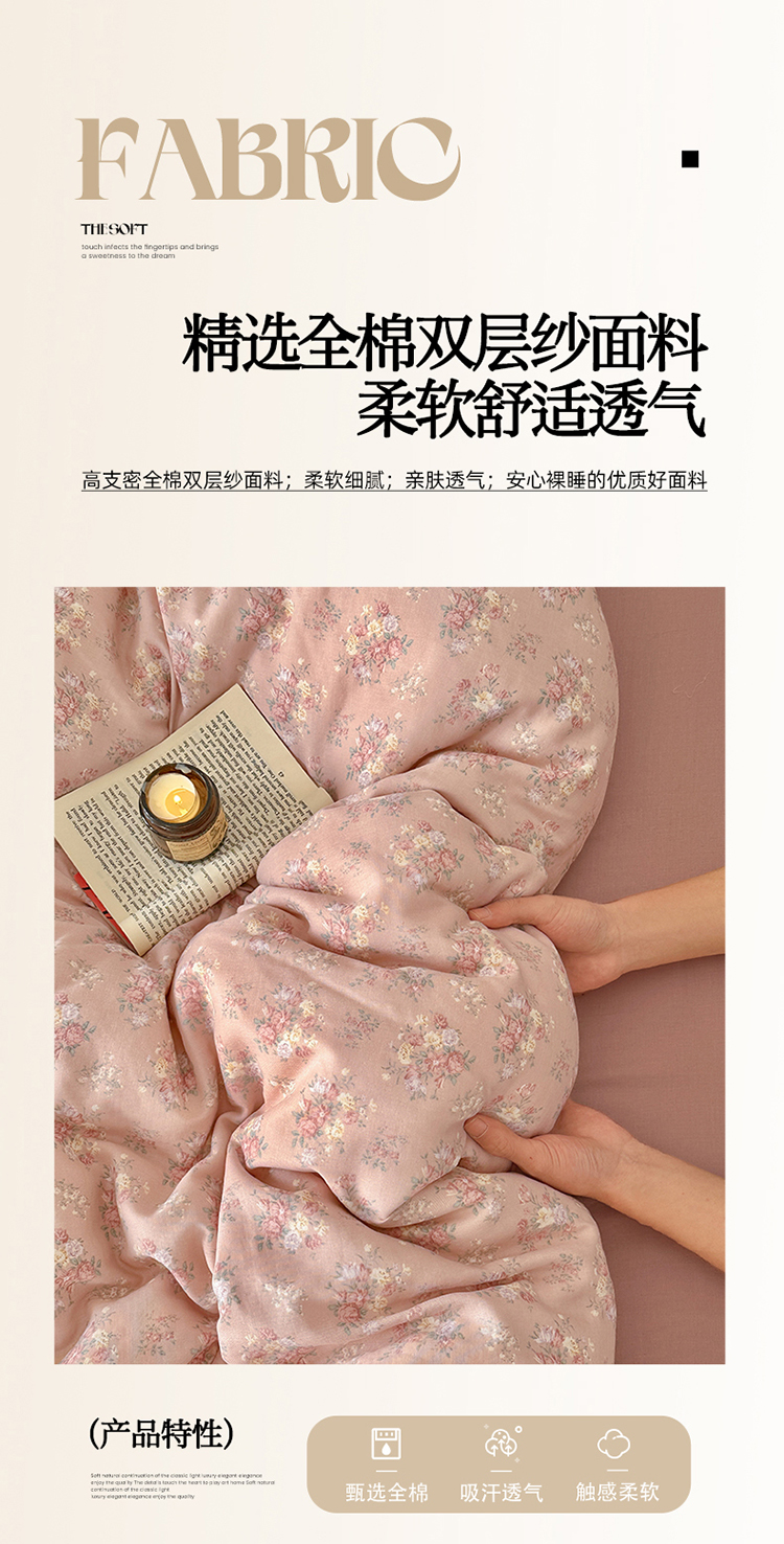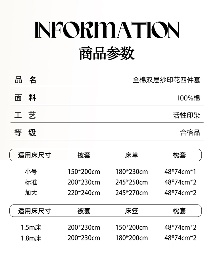 【品名】CKKHOUSE A类母婴级全棉双层纱四件套 床单款/床笠款 5款花型 【规格】 床单款/床笠款:安娜、绿姿、颜花朝、欢乐兔、小晴天 【尺寸】 0.9三件套-被套150cm*200cm 1.2三件套-被套150cm*200cm 1.5四件套-被套200cm*230cm 1.8四件套-被套200cm*230cm 2.0四件套-被套220cm*240cm 【产地】国内 【材质】棉100% 【发货包装】独立包装 【发货地】江苏 【发货快递】申通、邮政、韵达随机发 【补邮费地区】新疆、西藏,青海+20元 甘肃、宁夏、内蒙古、海南、北京+3元 【发货时效】48-72小时,周末节假日顺延 |