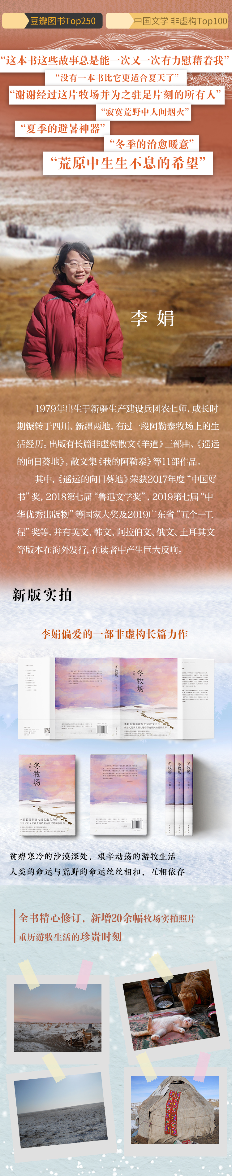 李娟以“栖居者”和“局外人”的双重身份,徘徊于文学与民族志的边界……以新鲜而真切的文字为读者记录下一种正在消失的游牧生活,呈现了一个遥远陌生的世界。