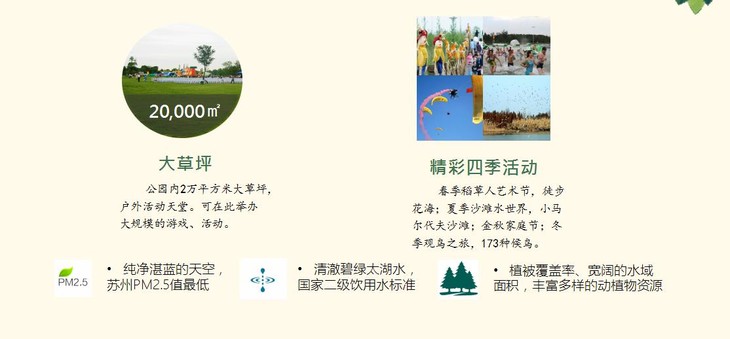 近年来公园内湿地自然学校、湿地科普长廊、1.5公里樱花大堤、2公里海棠大道、百亩桃花岛、生态浮岛项目等,已然成为湿地最具有吸引力的一张名片,真切落实游玩与学习有机结合的课题,为苏州的中小学生提供最专业的研学基地。
