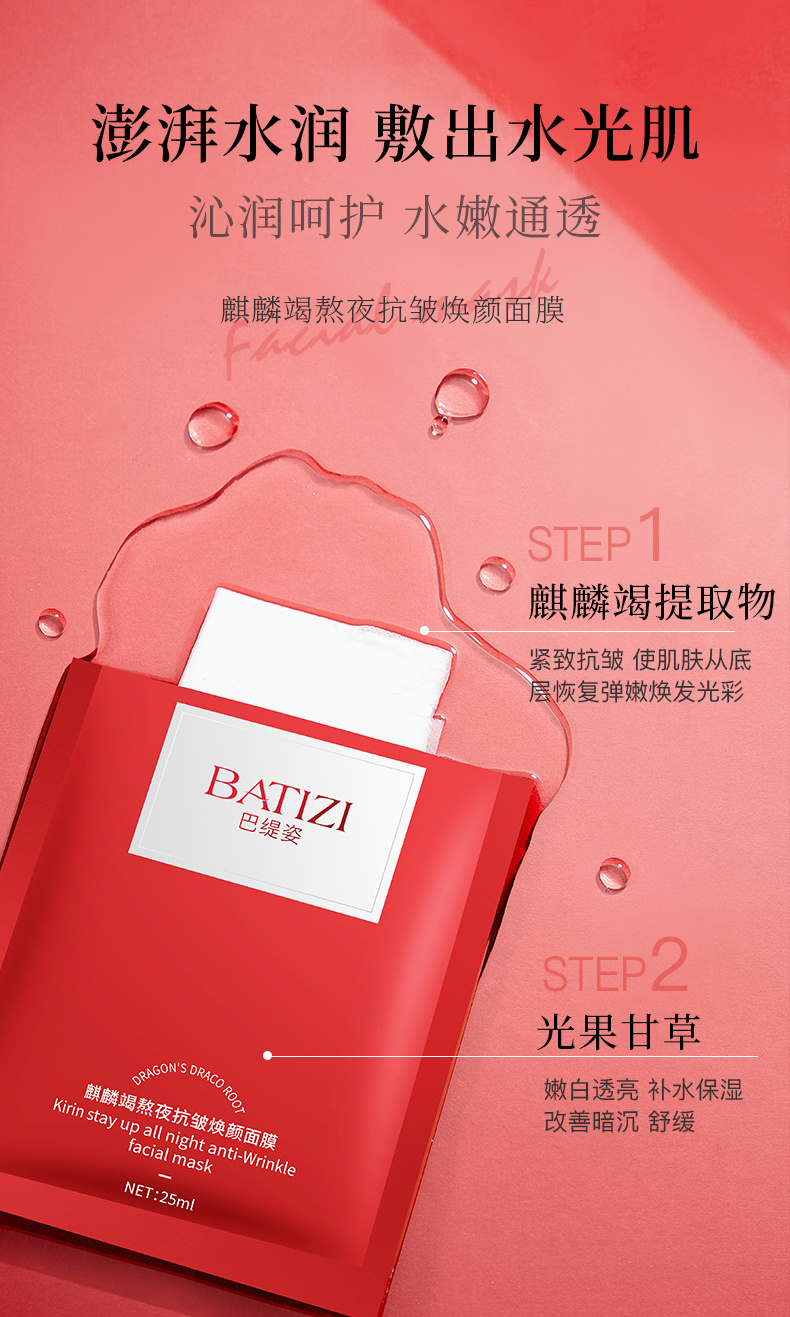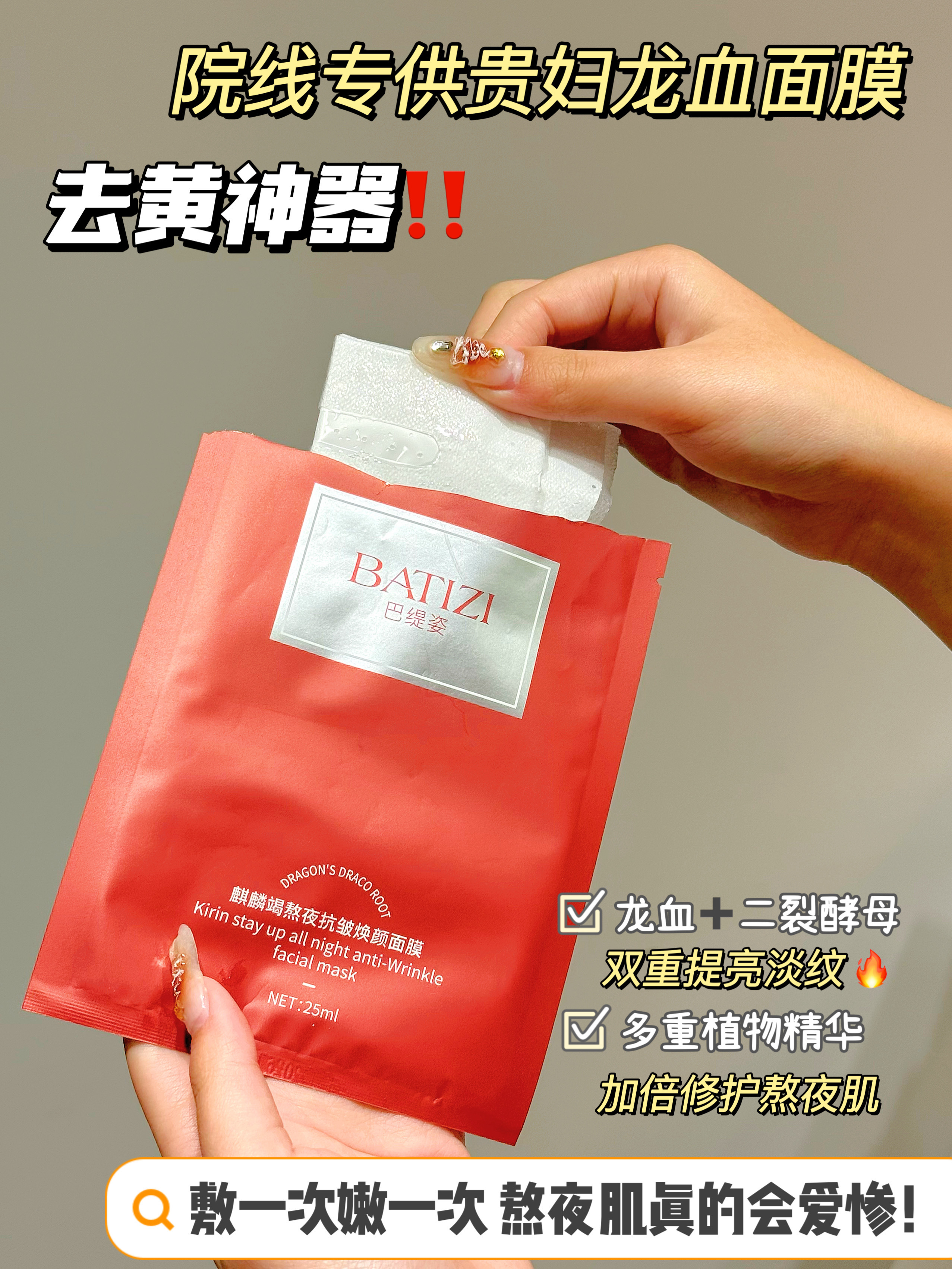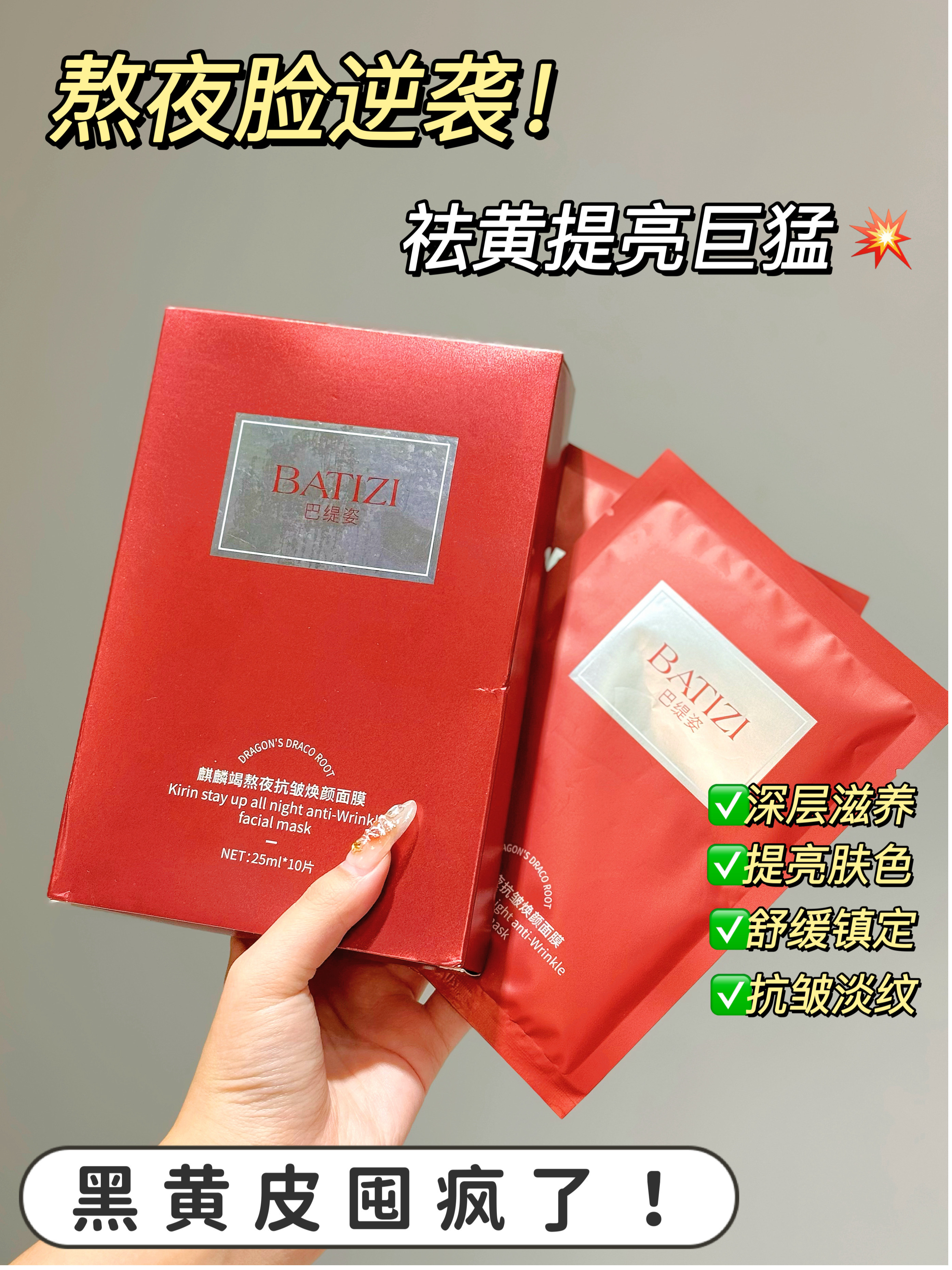 【BATIZI巴缇姿 麒麟竭熬夜抗皱焕颜面膜】院线级修护面膜!!!!1片龙血面膜顶5片普通面膜 特有珍贵麒麟竭成分◎出自8000年圣树龙血树 可有效改善面部的暗黄、黑眼圈另外添加了二裂酵母成分