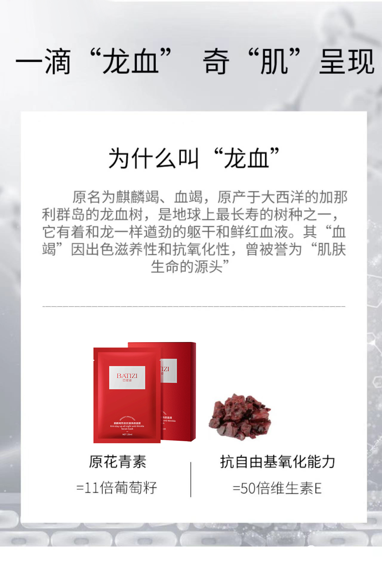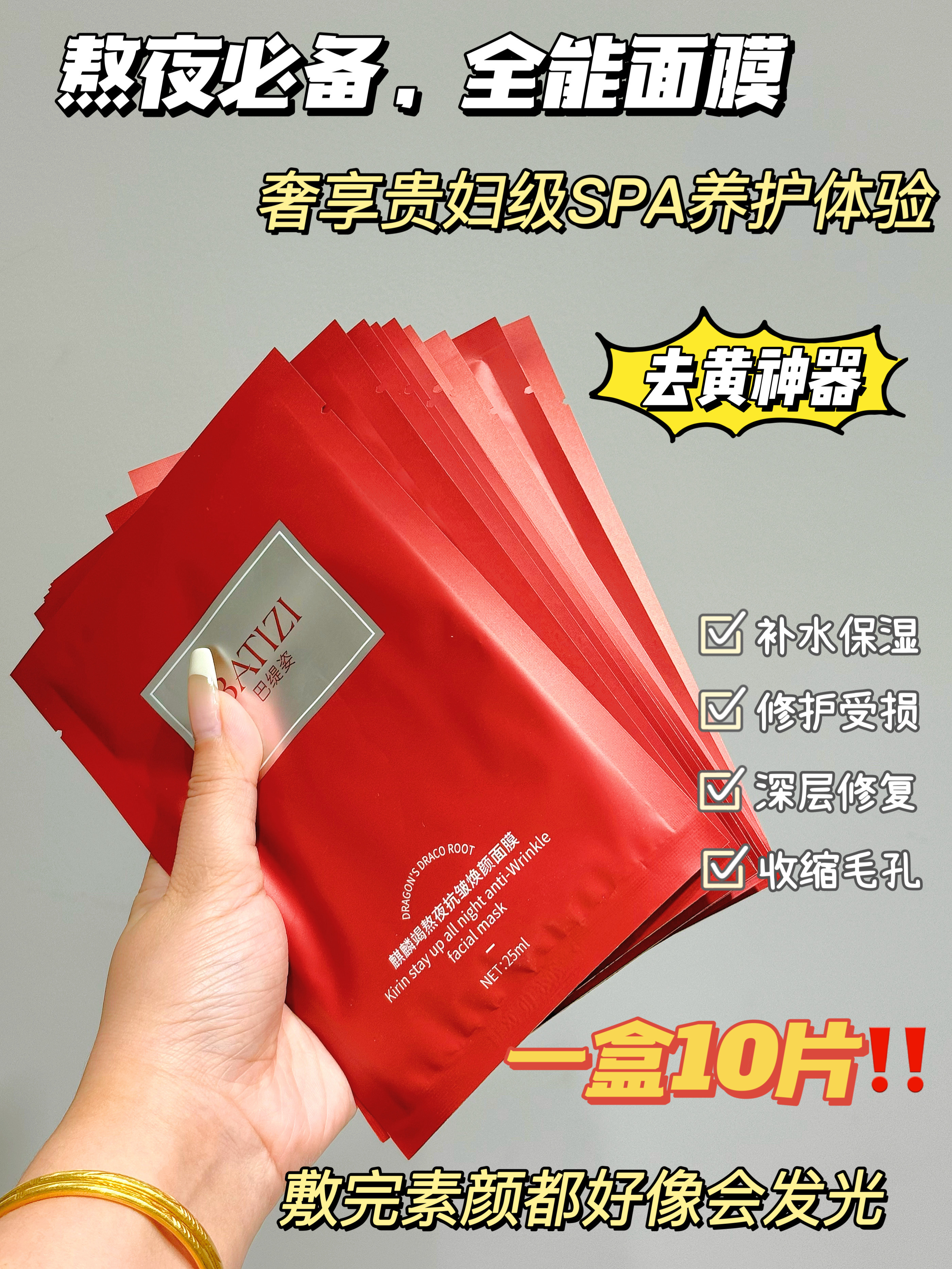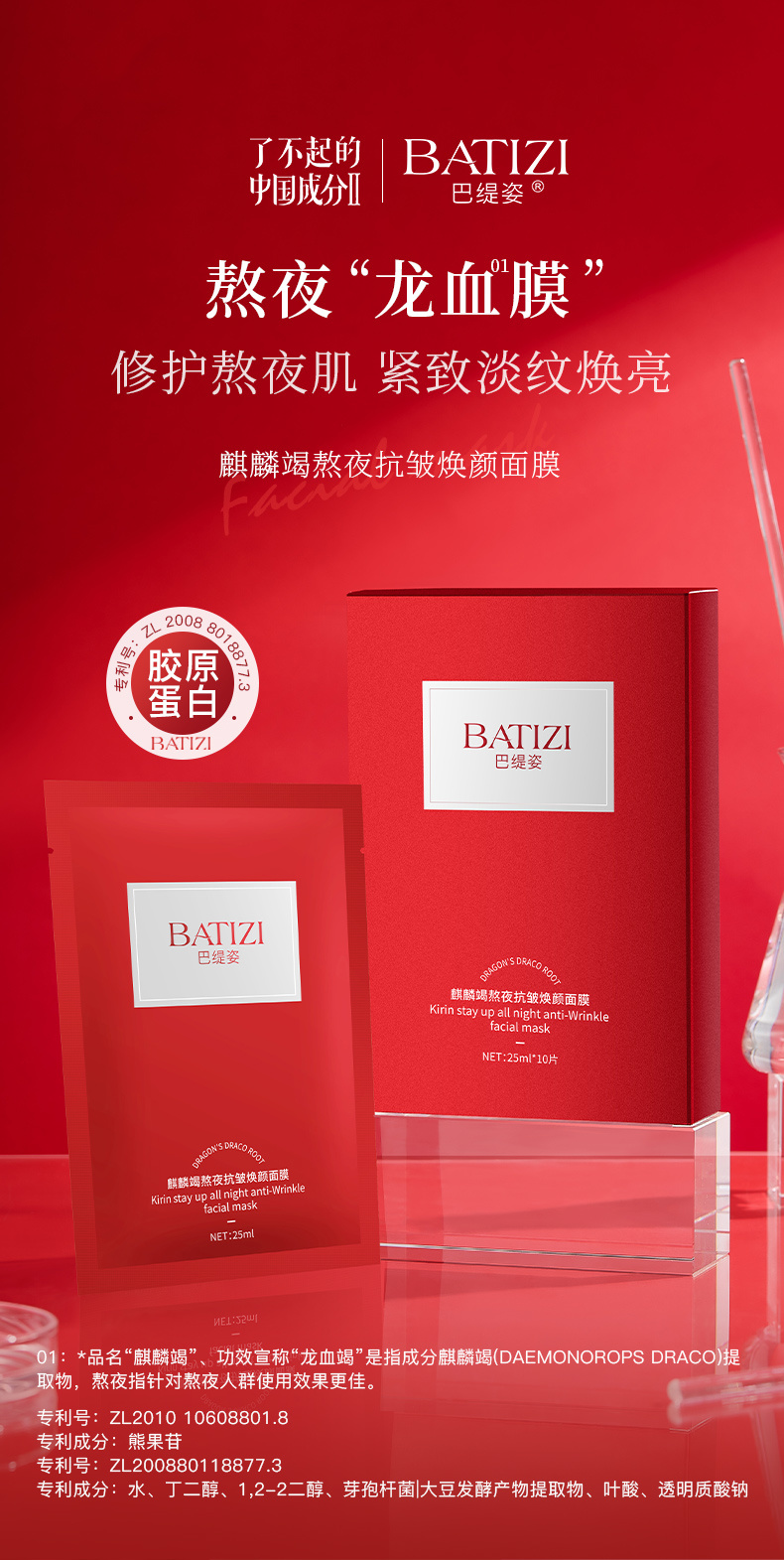 【BATIZI巴缇姿 麒麟竭熬夜抗皱焕颜面膜】院线级修护面膜!!!!1片龙血面膜顶5片普通面膜 特有珍贵麒麟竭成分◎出自8000年圣树龙血树 可有效改善面部的暗黄、黑眼圈另外添加了二裂酵母成分
