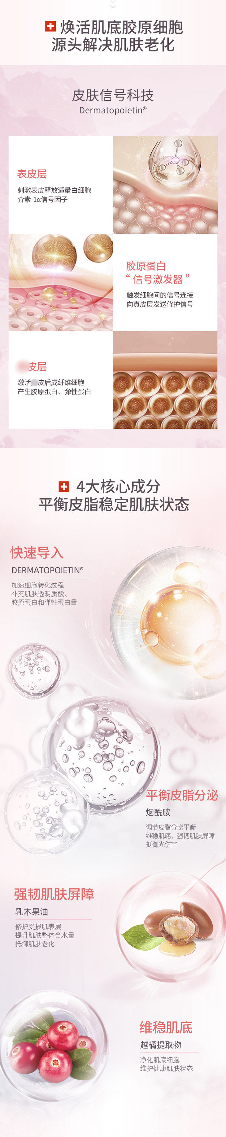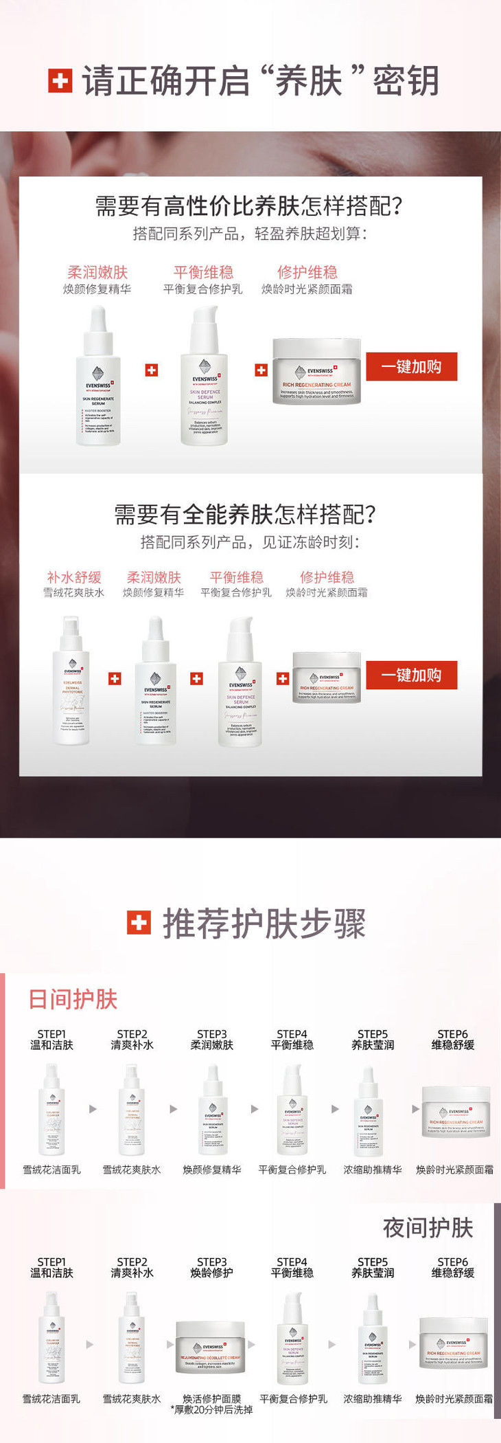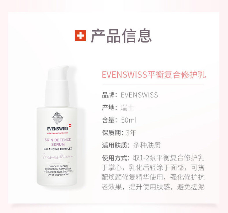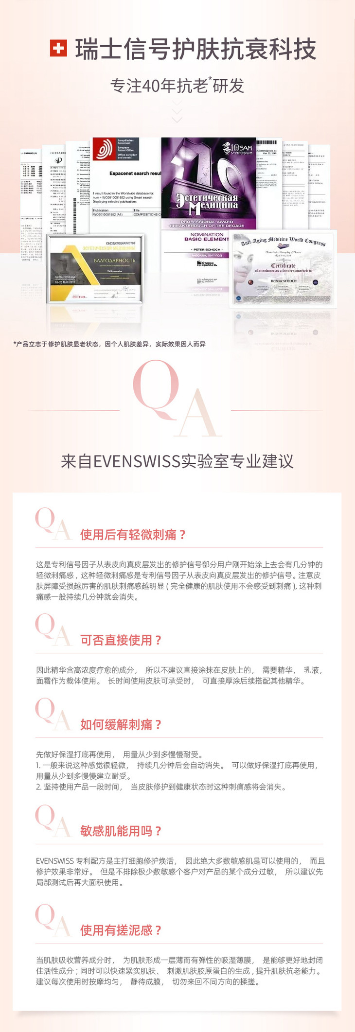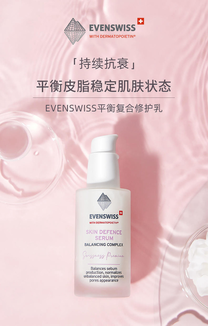 EVENSWISS伊瑞施是一个来自瑞士的前沿科技护肤品牌,创始人Igor Pomytkin博士此前曾在莫斯科化学物理研究所担任高级研究科学家,拥有许多医学方面的前沿专利发明。40年来,品牌专研肌肤妔衰XIU复技术,主打信号护肤,拥有20多项国际专利,除创始人外,EVENSWISS科研团队还汇聚了生物化学、皮肤科等方面的专家,将再生医学技术与生物美容结合,研发出前沿品牌专利技术Dermatopoietin(简称DP ),通过触发白细胞介素1α炎症信号因子的释放,建立细胞间的信号级联,高效地CU进 ZHEN皮层胶原蛋白自生。EVENSWISS品牌旗下产品都是在DP技术上,加以瑞士植物干细胞配方、各种小分子多肽以及其他高浓度的活性成分,帮助使用者减少产品使用的数量,一瓶满足多种功效,28天看到肌肤变化哦!