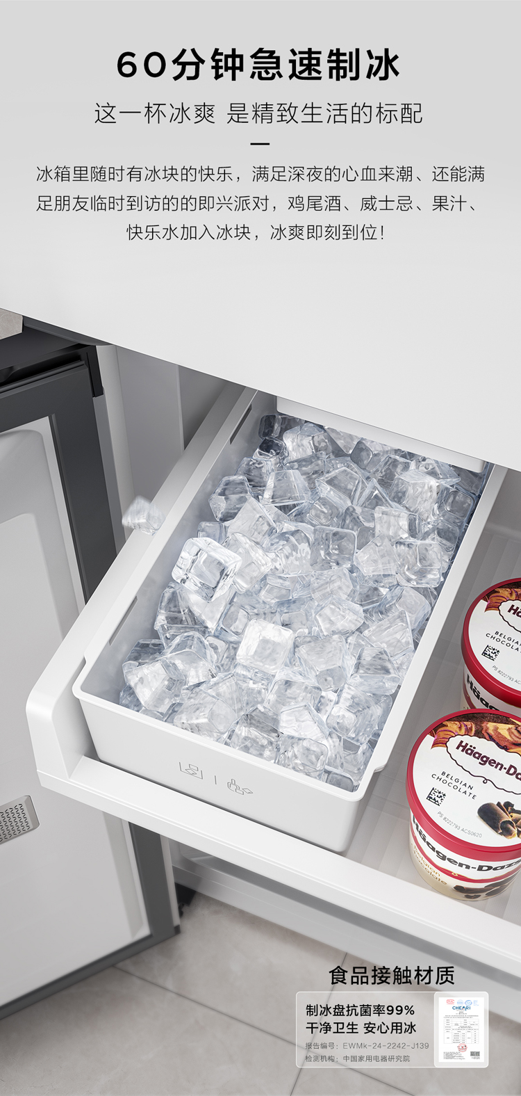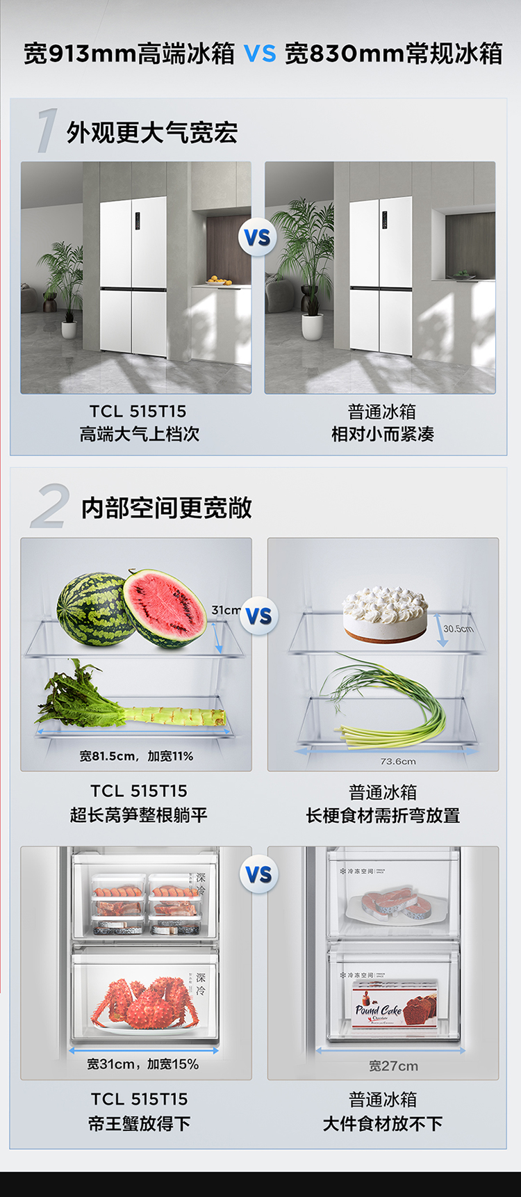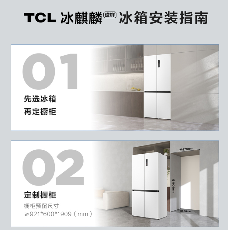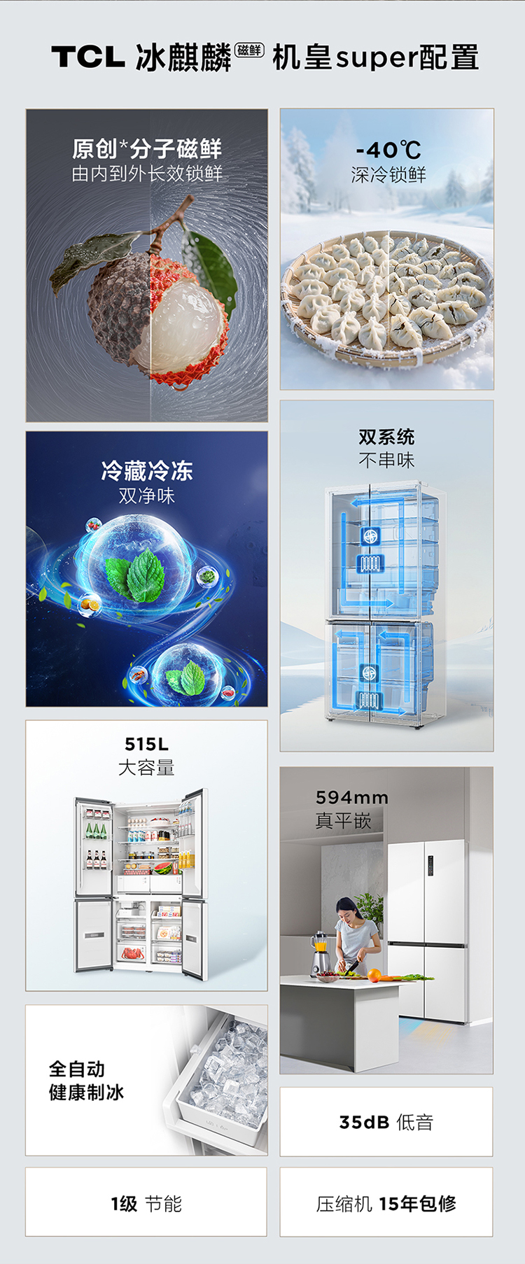 【新品上市】TCL冰麒麟515升十字四门原创分子磁鲜双系统自动制冰超薄零嵌冰箱R515T15-UQBS