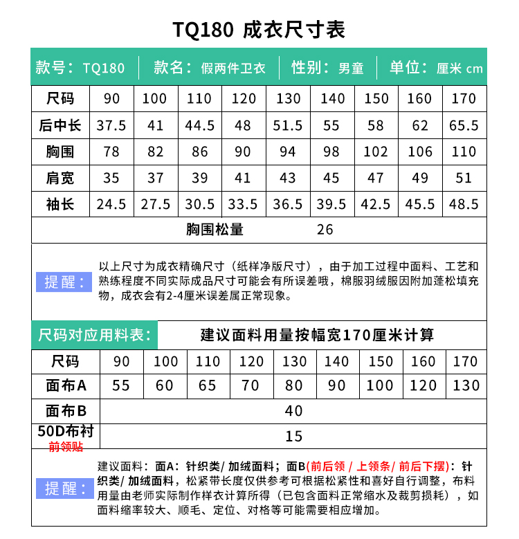 裁缝学苑TQ180童装男童卫衣纸样儿童秋冬长袖t恤新款假两件上衣样板