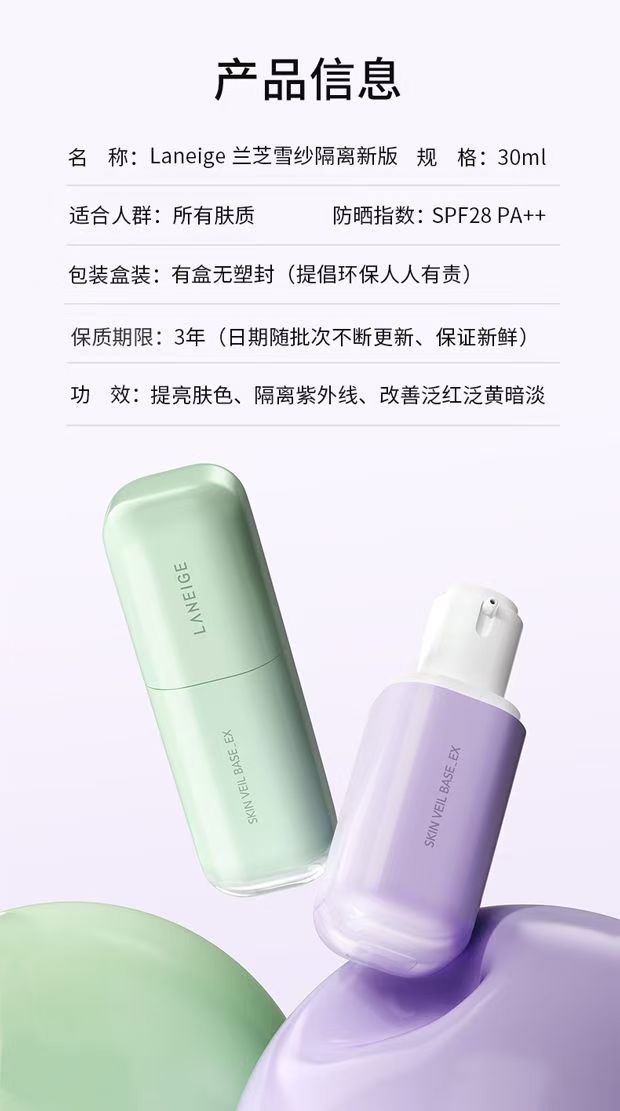 【韩国直邮新版】 兰芝隔离霜防晒妆前乳遮瑕三合一紫绿色SPF2325+提亮