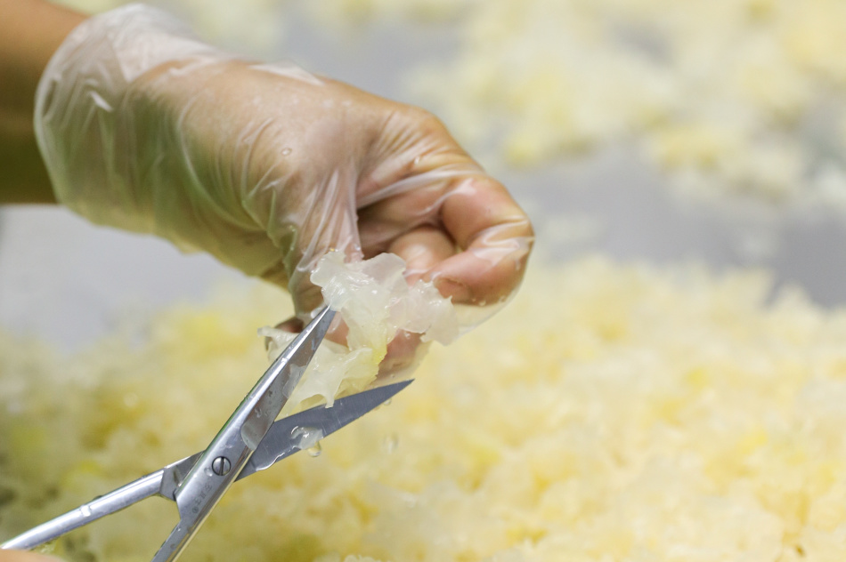 Step 2:人工对银耳清理肉眼可见杂质,将银耳中黑点较为集中的地方进行修剪。