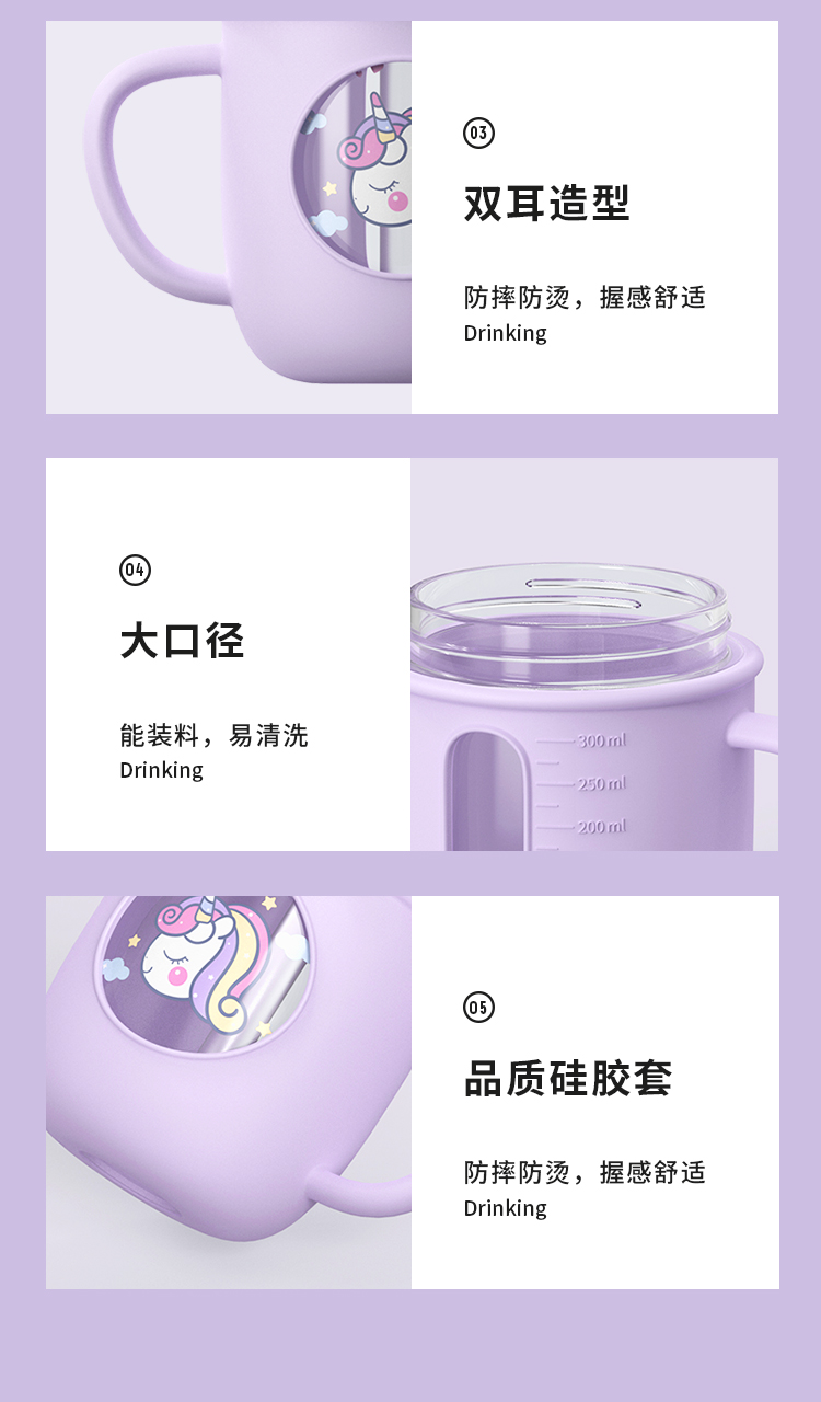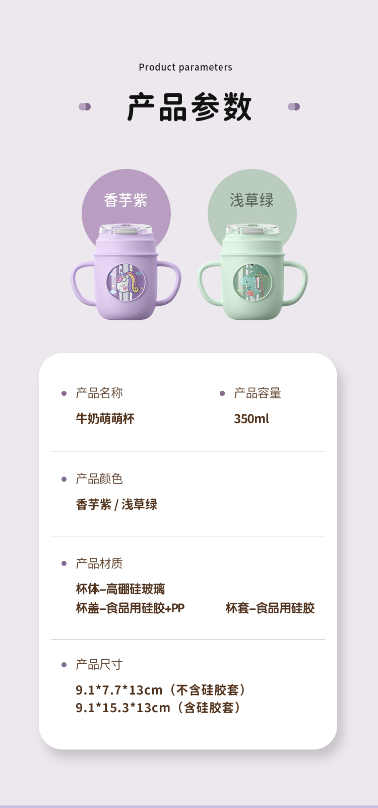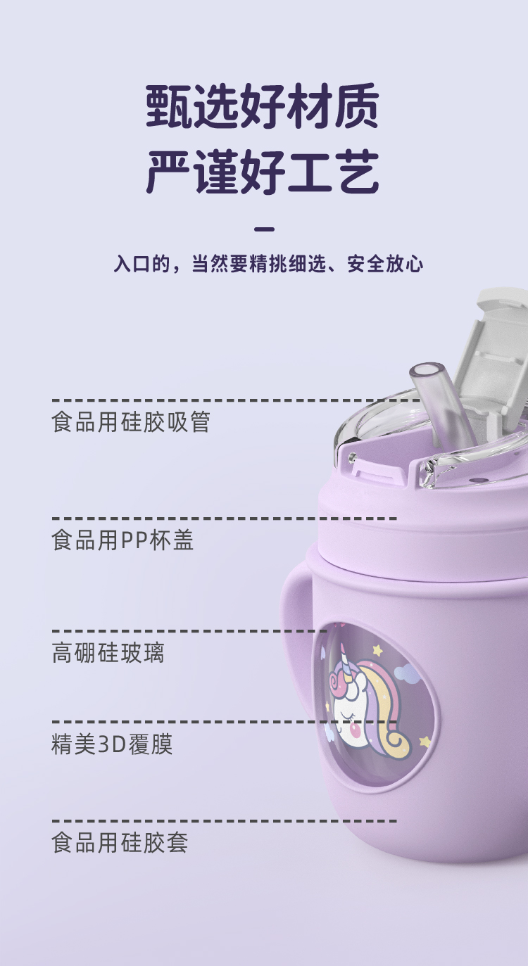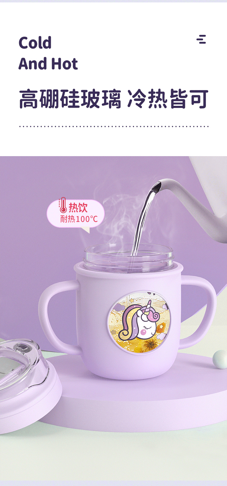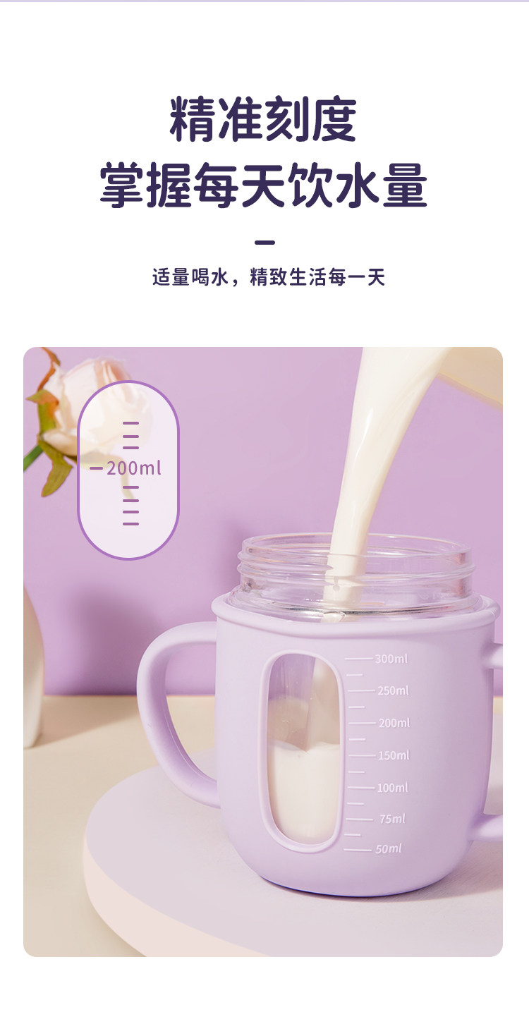 特美刻(TOMIC)玻璃杯 家用儿童牛奶杯子带刻度便携耐热吸管水杯防漏带把手婴幼儿学饮杯 TG82029 浅紫色
