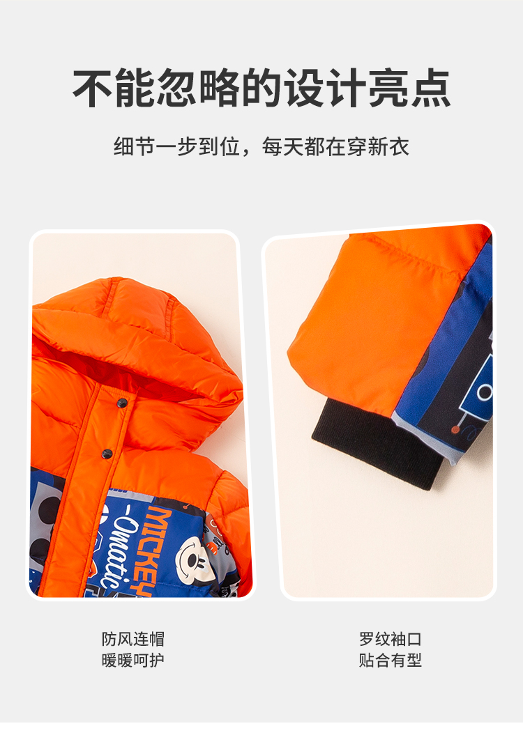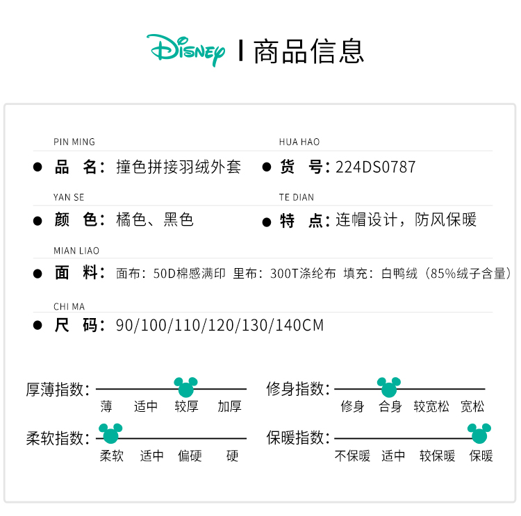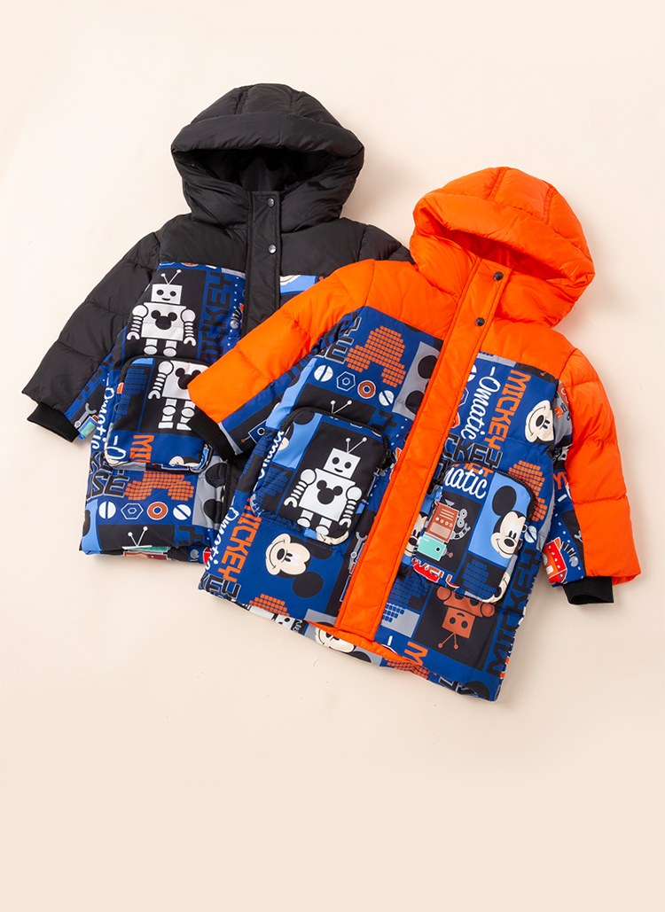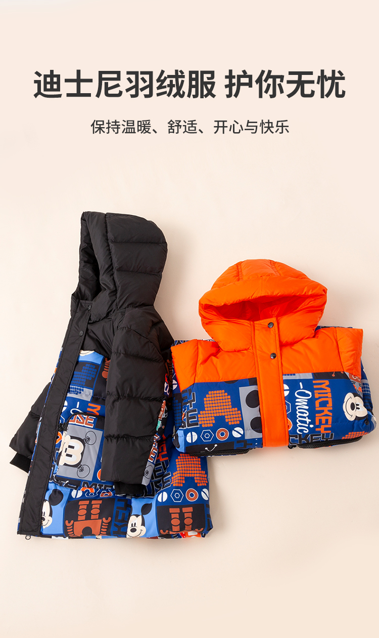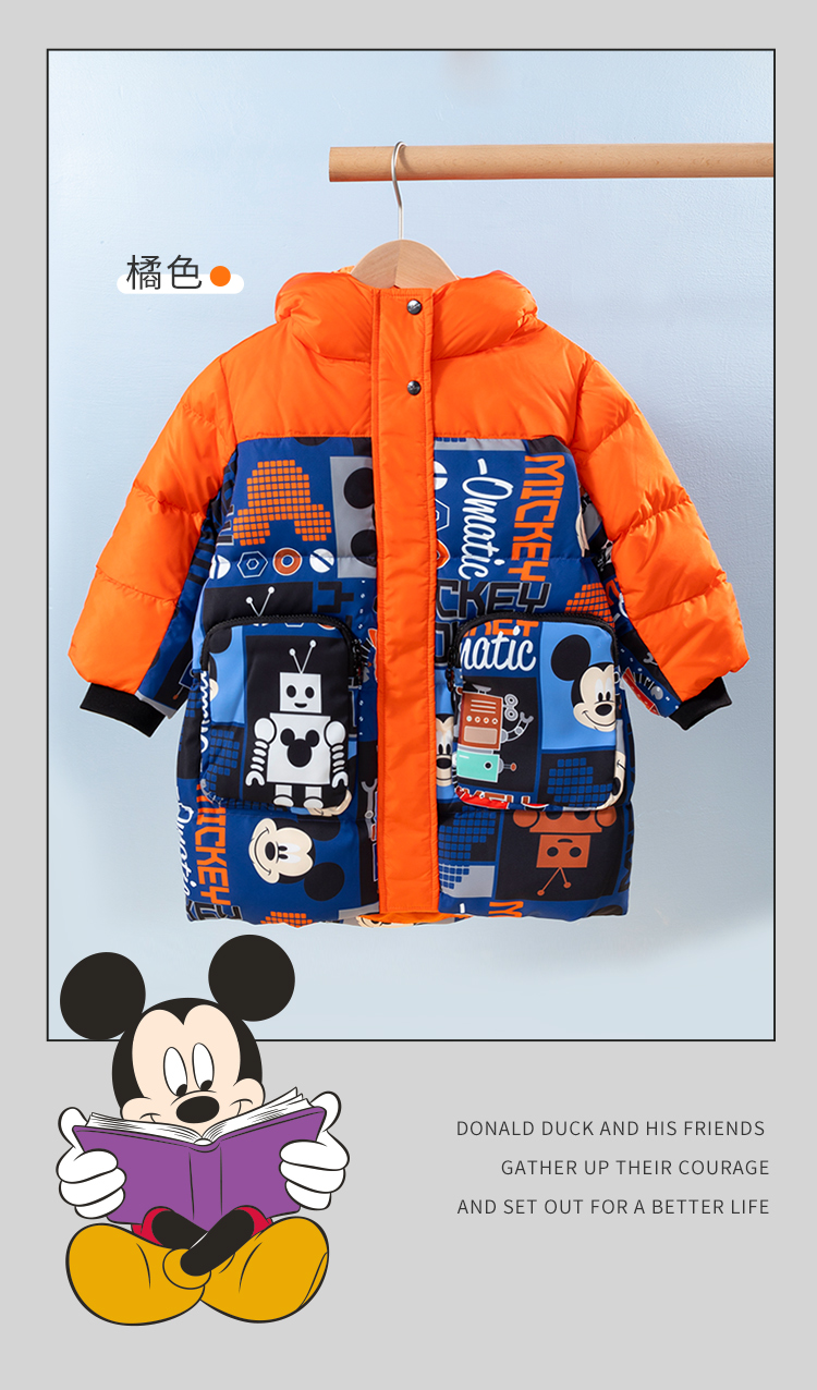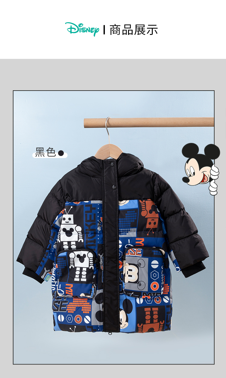 迪士尼【加厚保暖】冬季新品男童撞色中长款羽绒服婴幼儿连帽外套224DS0787