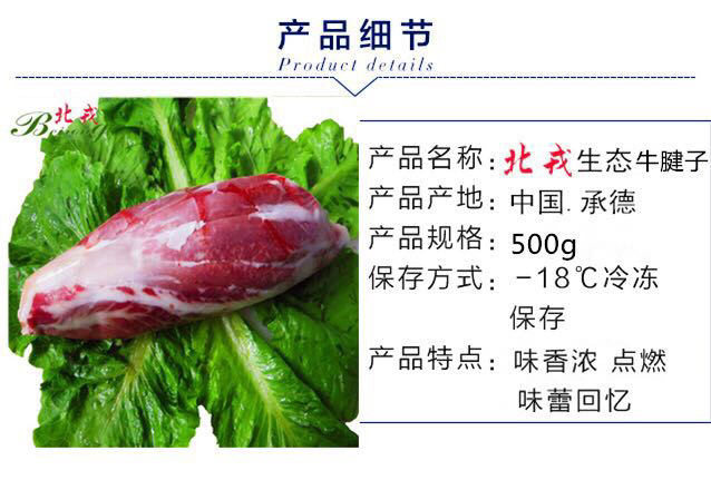 牛肉营养价值高,味道鲜美,受人喜爱,享有“肉中骄子”的美称。北戎生态牛肉-牛腱子,分前腱和后腱,熟后有胶质感。适合红烧或卤、酱牛肉。