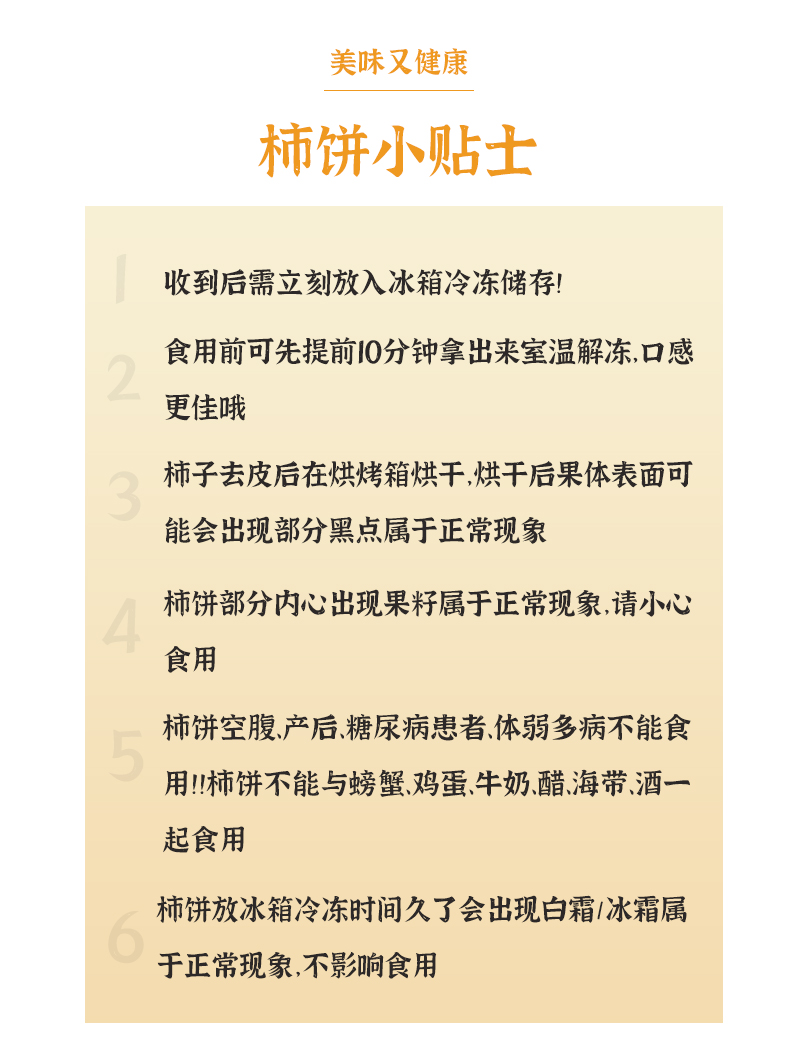 4.柿饼部分内心出现果籽属于正常现象,请小心食用
