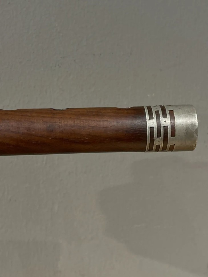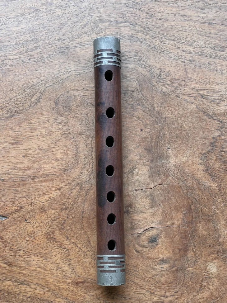 这是一件选材质地坚硬、纹里清晰的小叶紫檀雕琢并且镶金属锡边而成的横笛,坚韧的小叶紫檀内部掏膛成厚壁笛管后钻孔镶镂空回纹锡边而成横笛,此年代老的横笛,表面色泽淡褐、质地堅硬,天然纹理清晰流畅,包浆浑厚温润,非常美丽。除锡边外表面不假雕琢,整体古朴典雅,是一件高端的老横笛。