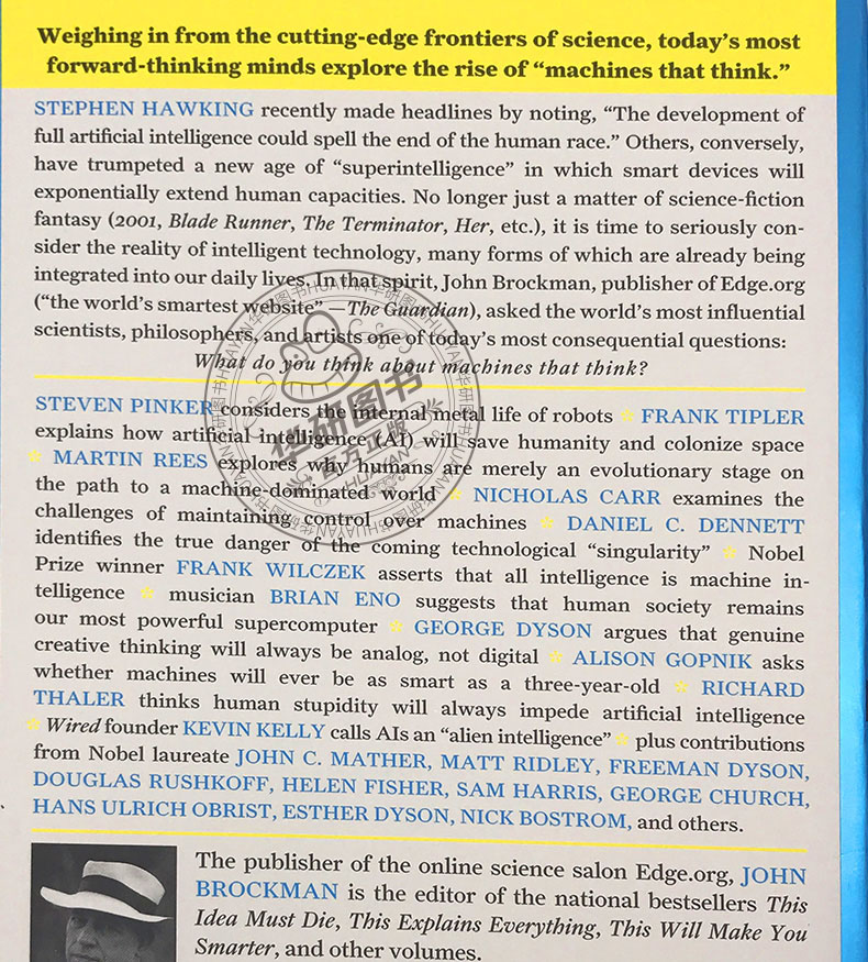 如何思考会思考的机器?What to Think About Machines That Think《如何思考会思考的机器》编者约翰·布罗克曼召集了世界知名的科学家和思想家来回答这个“大问题”,并把他们的答案和论述集结成书。