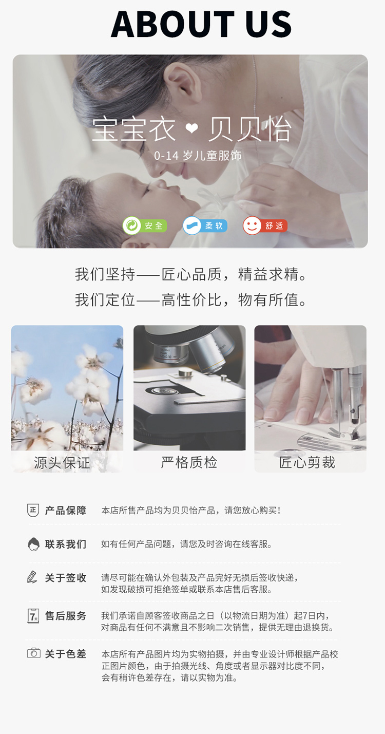 - 贝贝怡专注0-6岁婴幼儿服饰,坚持安全、柔软、舒适的产品理念,为千万中国家庭提供超高品质、安全可靠的婴幼儿服饰产品,妈妈放心,宝宝开心!