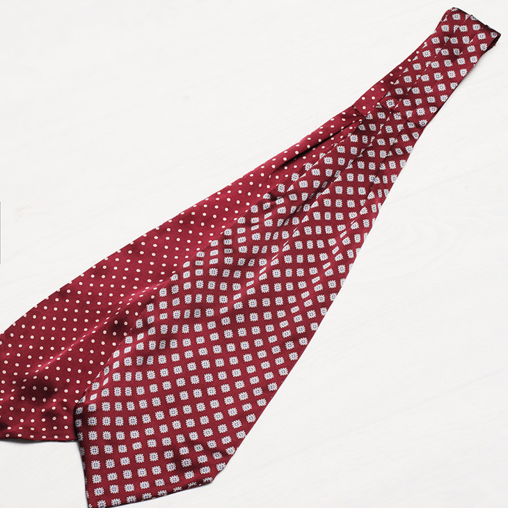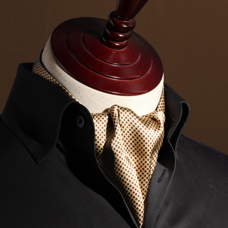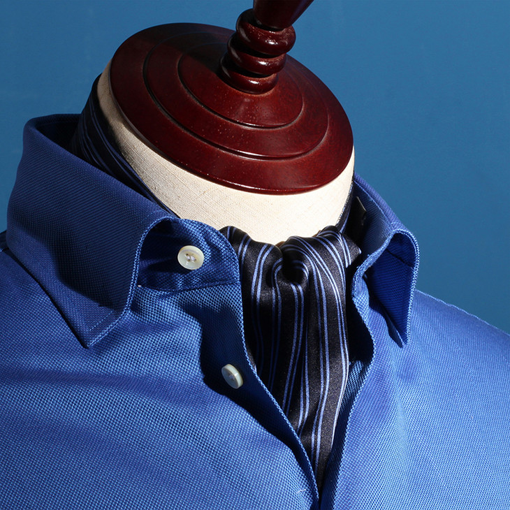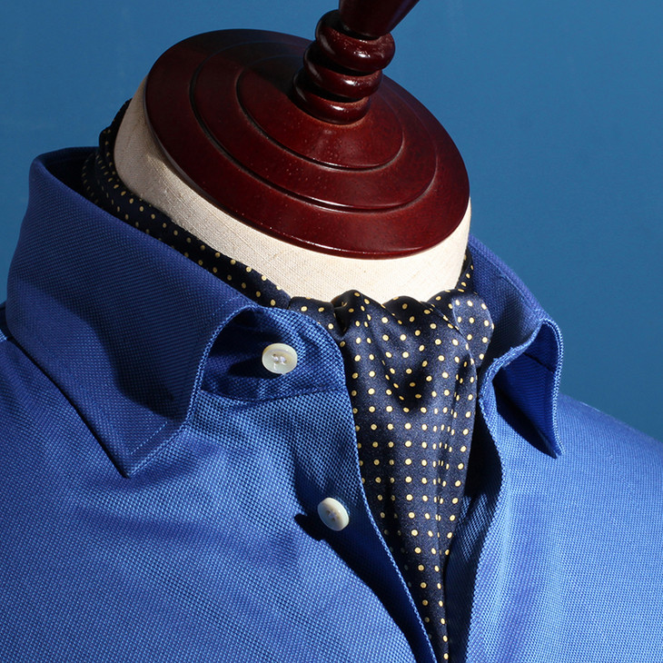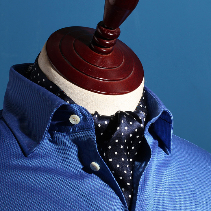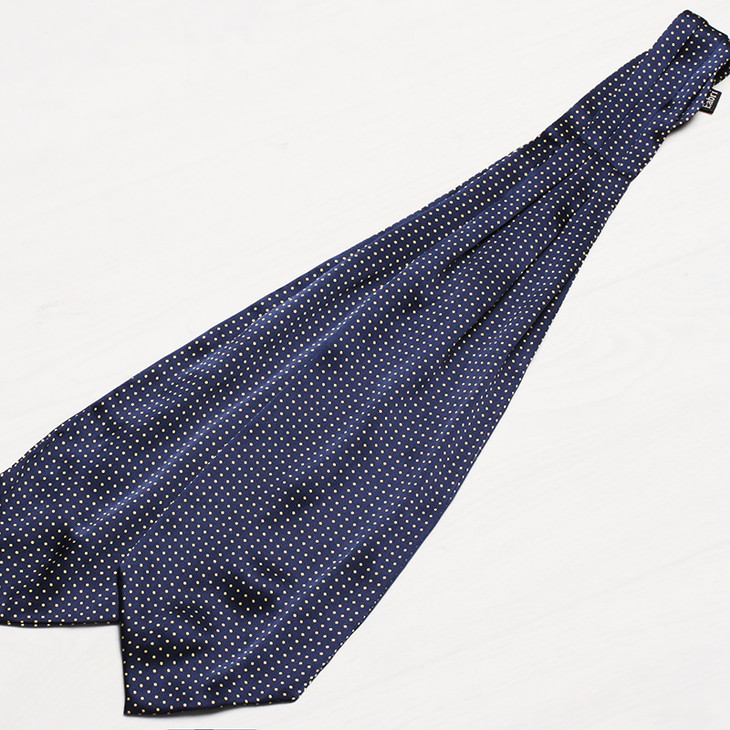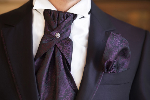 领巾的英文名叫Ascot Tie,也可以叫Hanker Tie,在19世纪初就已经普遍流行了,当时参加英国皇家爱斯科赛马会(Royal Ascot)的绅士们,标准着装晨礼服和Ascot Tie,男士白天在隆重的婚礼或庆典场合也会这样穿着。