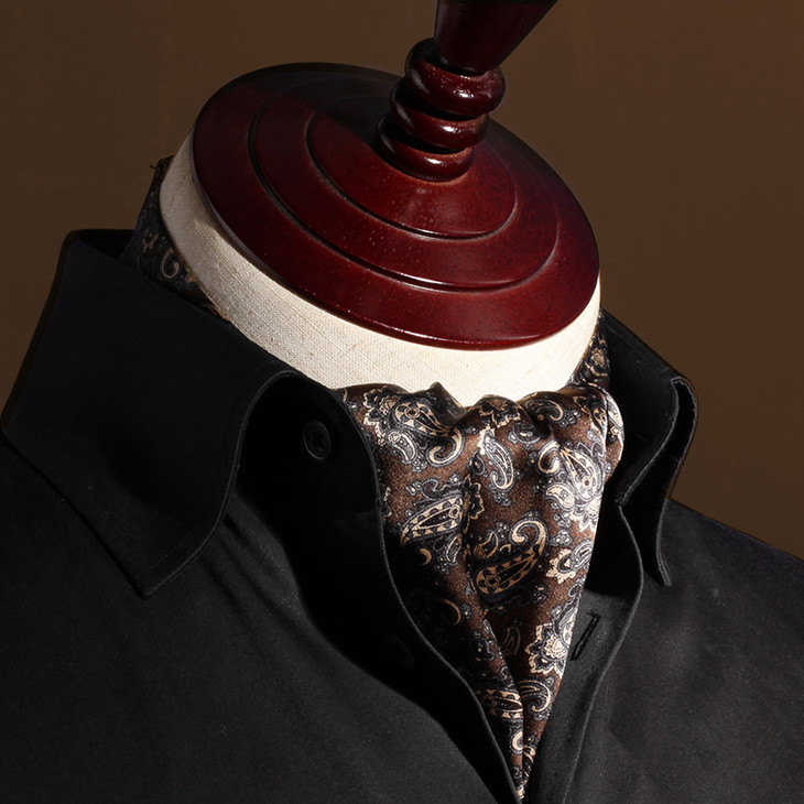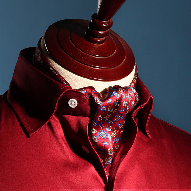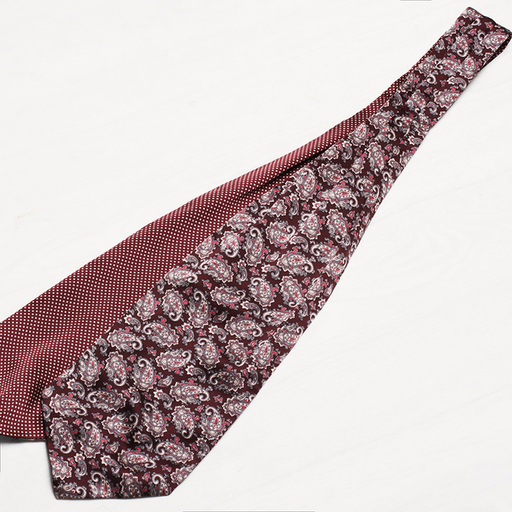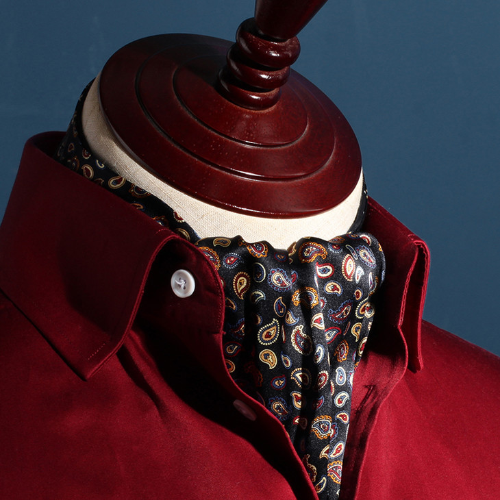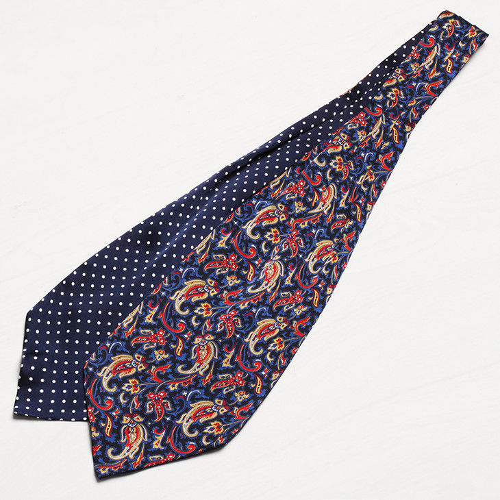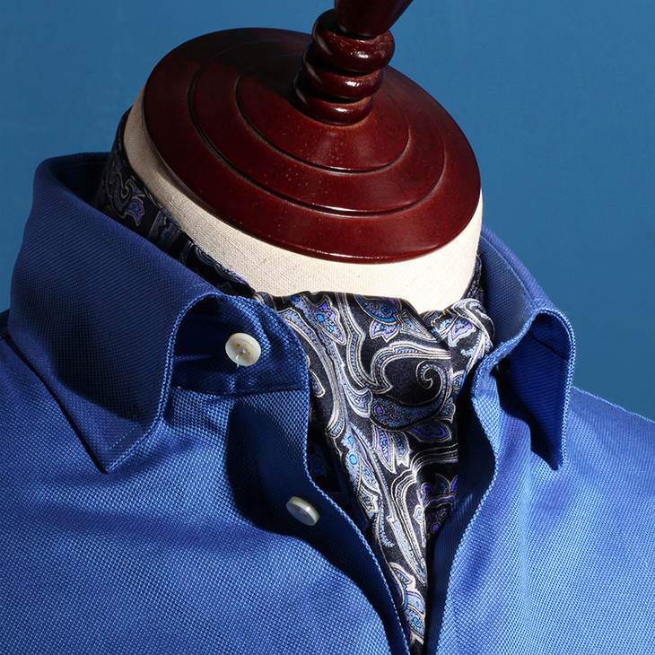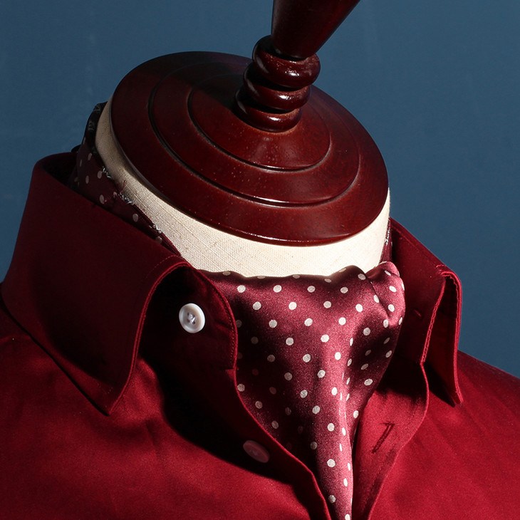 领巾的英文名叫Ascot Tie,也可以叫Hanker Tie,在19世纪初就已经普遍流行了,当时参加英国皇家爱斯科赛马会(Royal Ascot)的绅士们,标准着装晨礼服和Ascot Tie,男士白天在隆重的婚礼或庆典场合也会这样穿着。