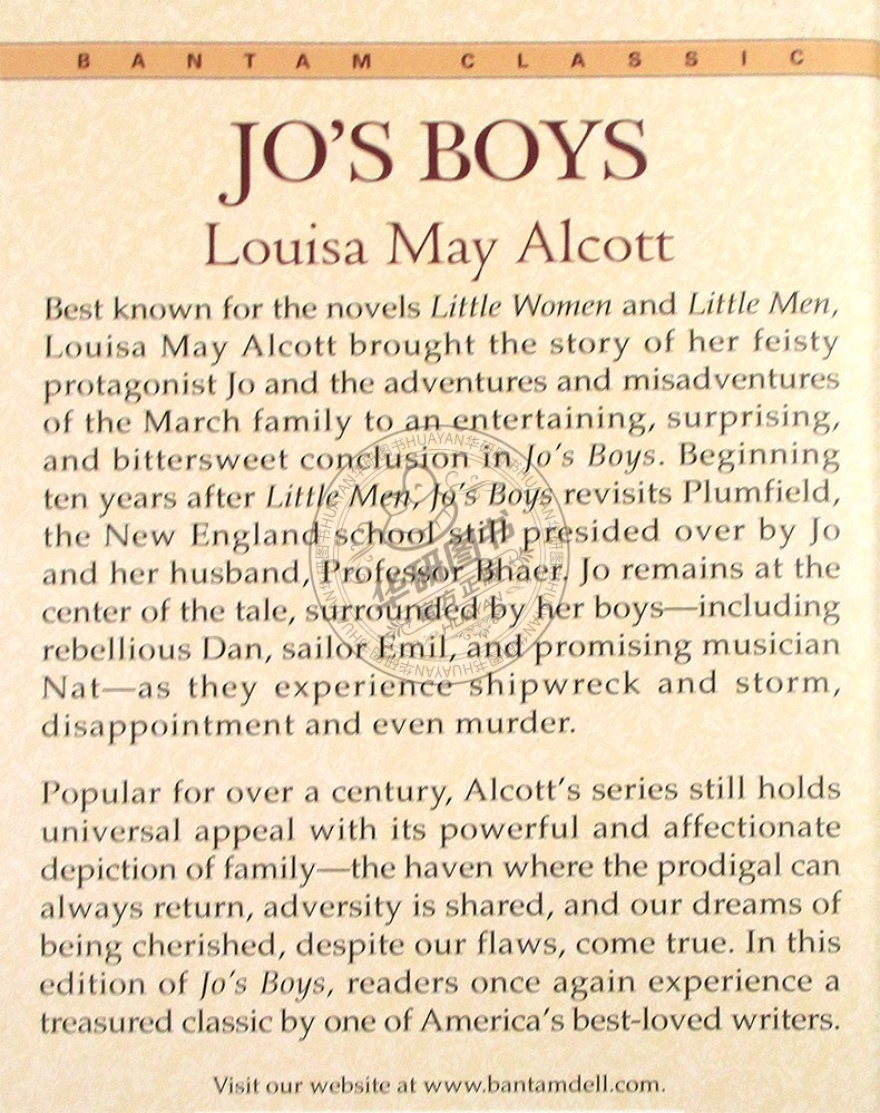 Jo’s Boys《乔的男孩们》是美国作家路易莎·梅·奥尔科特“小妇人”系列的第三部,也是最后一部作品。在本书中,作者以学校中的莘莘学子为主角,架构出一本充满浪漫气息的青春小说。它描写了十四位少男、少女成长后的生活,故事背景为《小绅士》(或译《小男儿》)的十年之后,成长后的他们和她们,在不同的大学里经历青春、爱情,逐渐走向社会,开创自己的事业,其中有新闻记者、音乐家、青年实业家等。本书为Bantam Classics推出的英文版,内容无删减,体积小巧,方便携带。